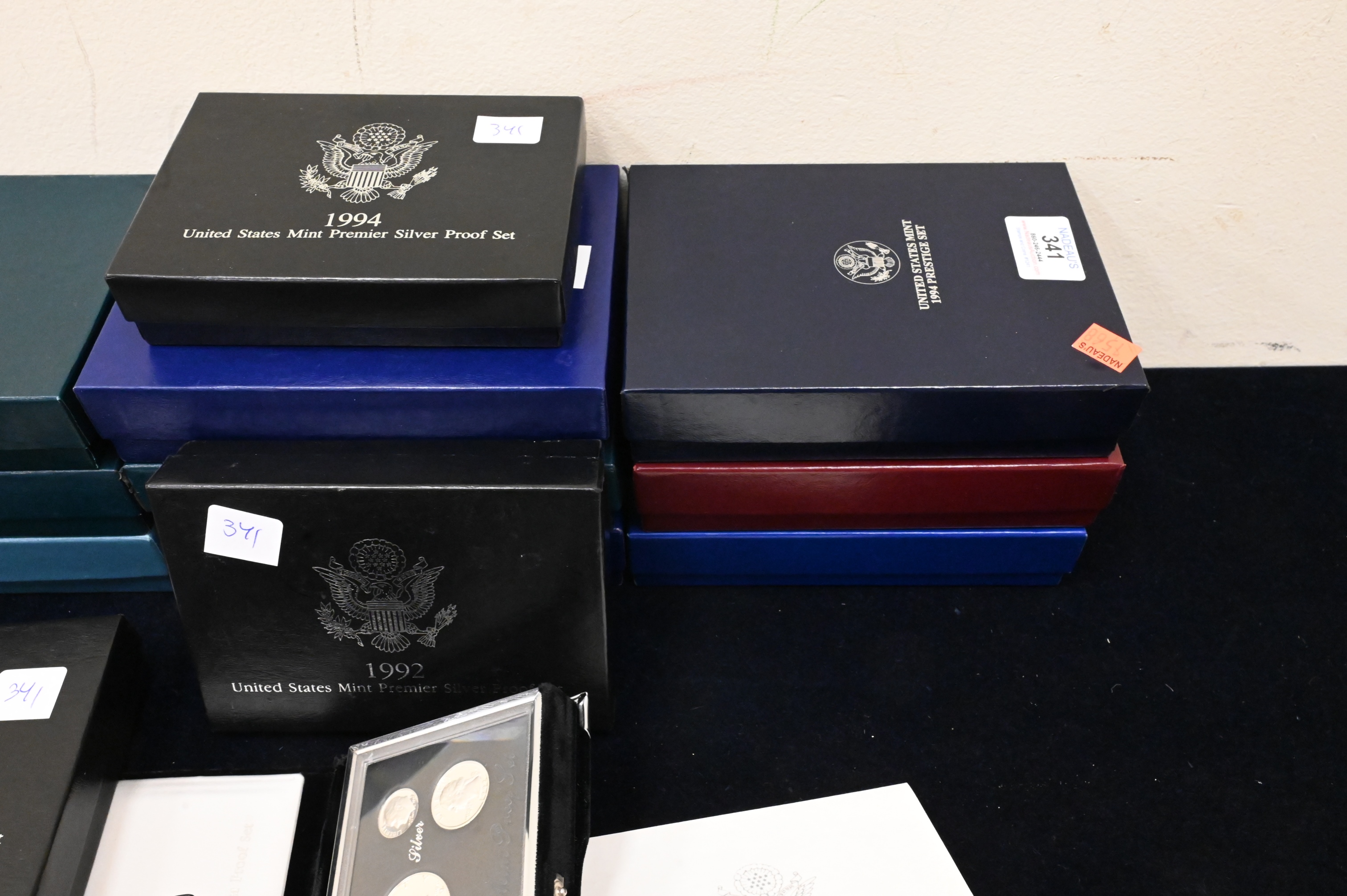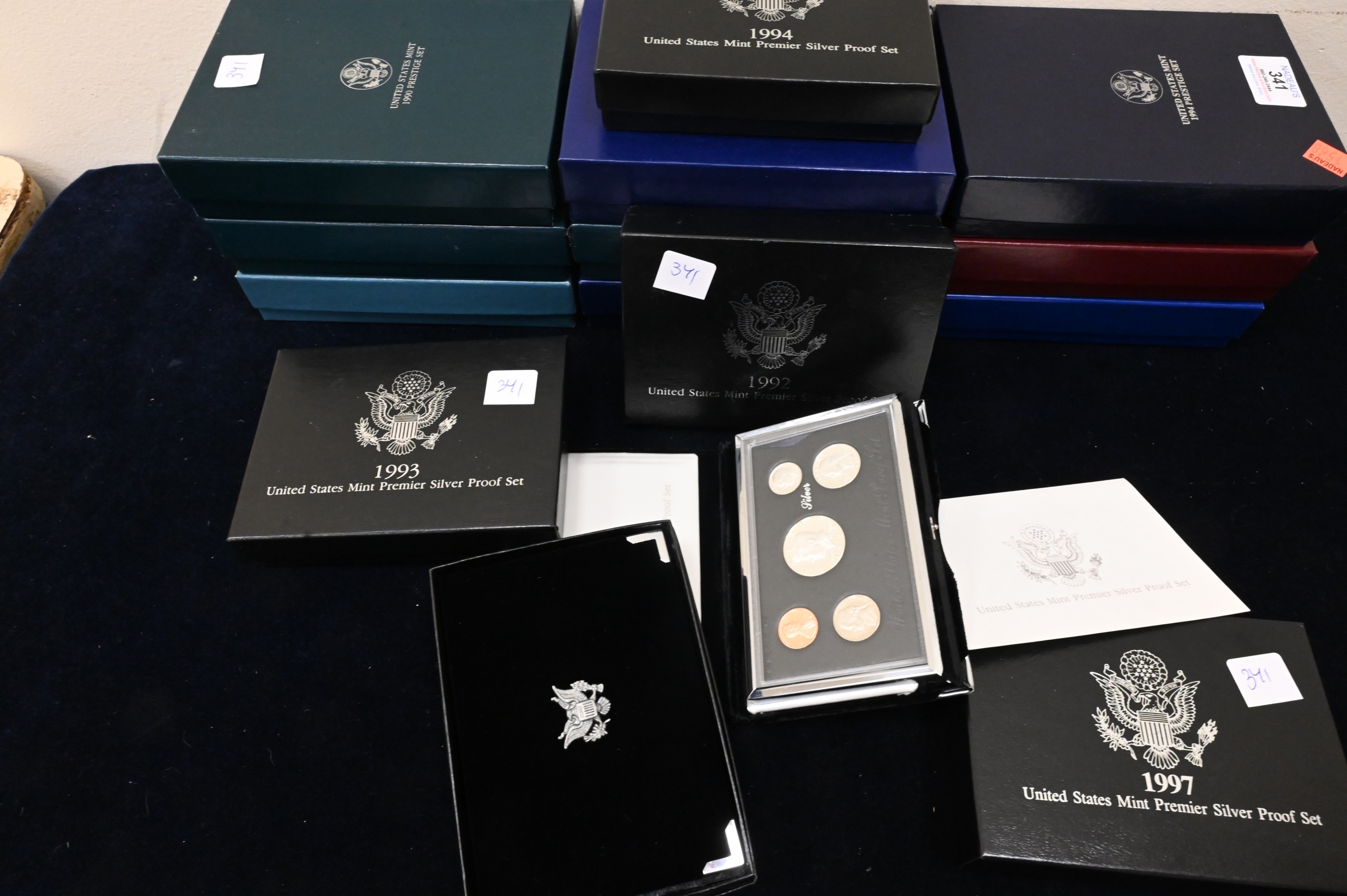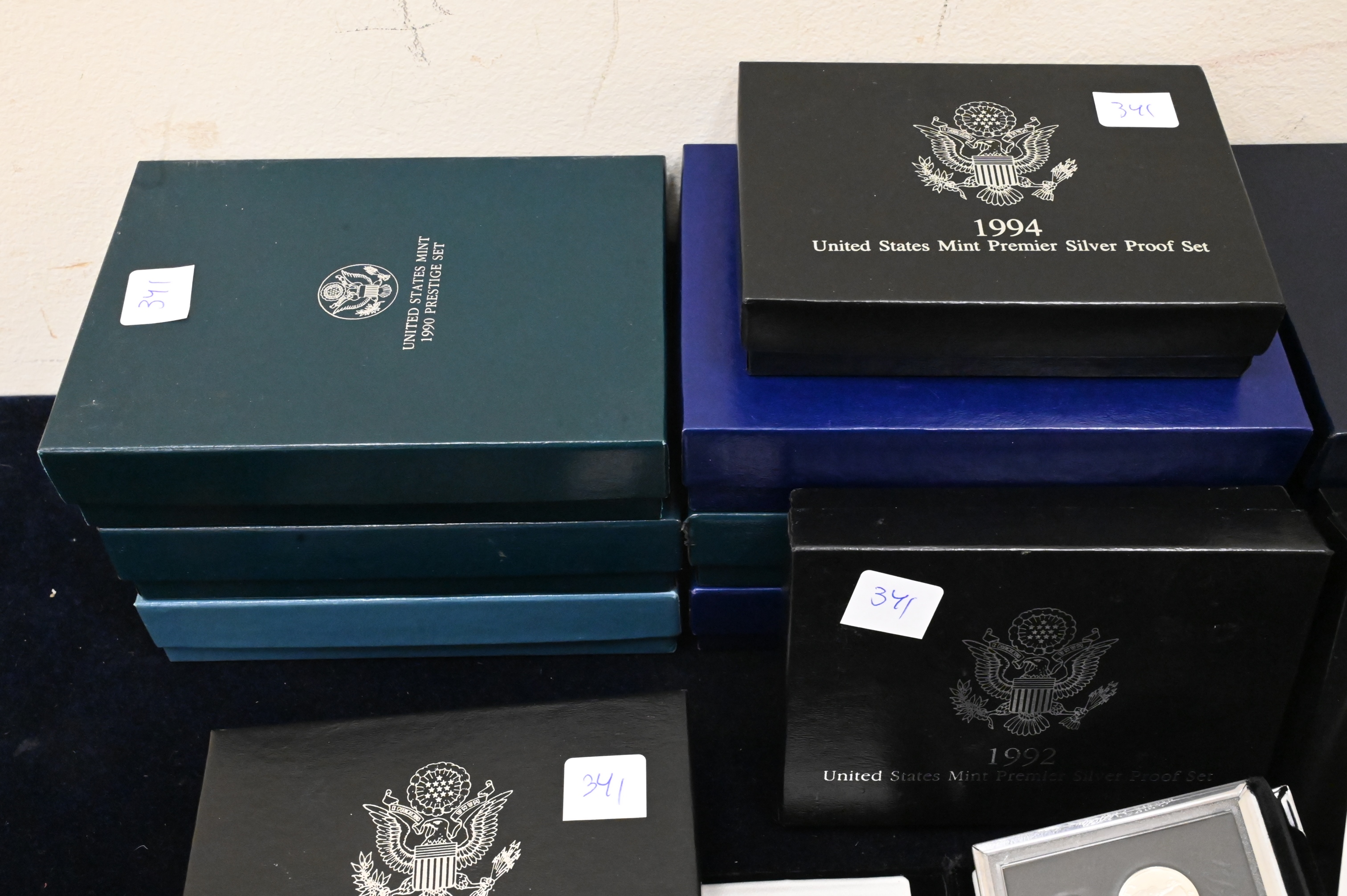 U.S. Mint Sets, to include six U.S. mint prestige proof sets, with 1986, 1987, 1990, 1993, 1994, and 96, along with premier silver proof sets, including two 1992, one 1993, oe 1994, one 1998 and one 1997, U.S. prestige mint sets to include one 1993, and two 1995