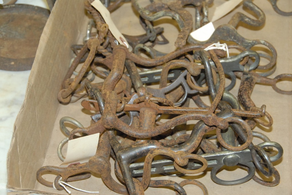 Box lot early military bits, Shoemaker bits, iron, brass, plated etc.