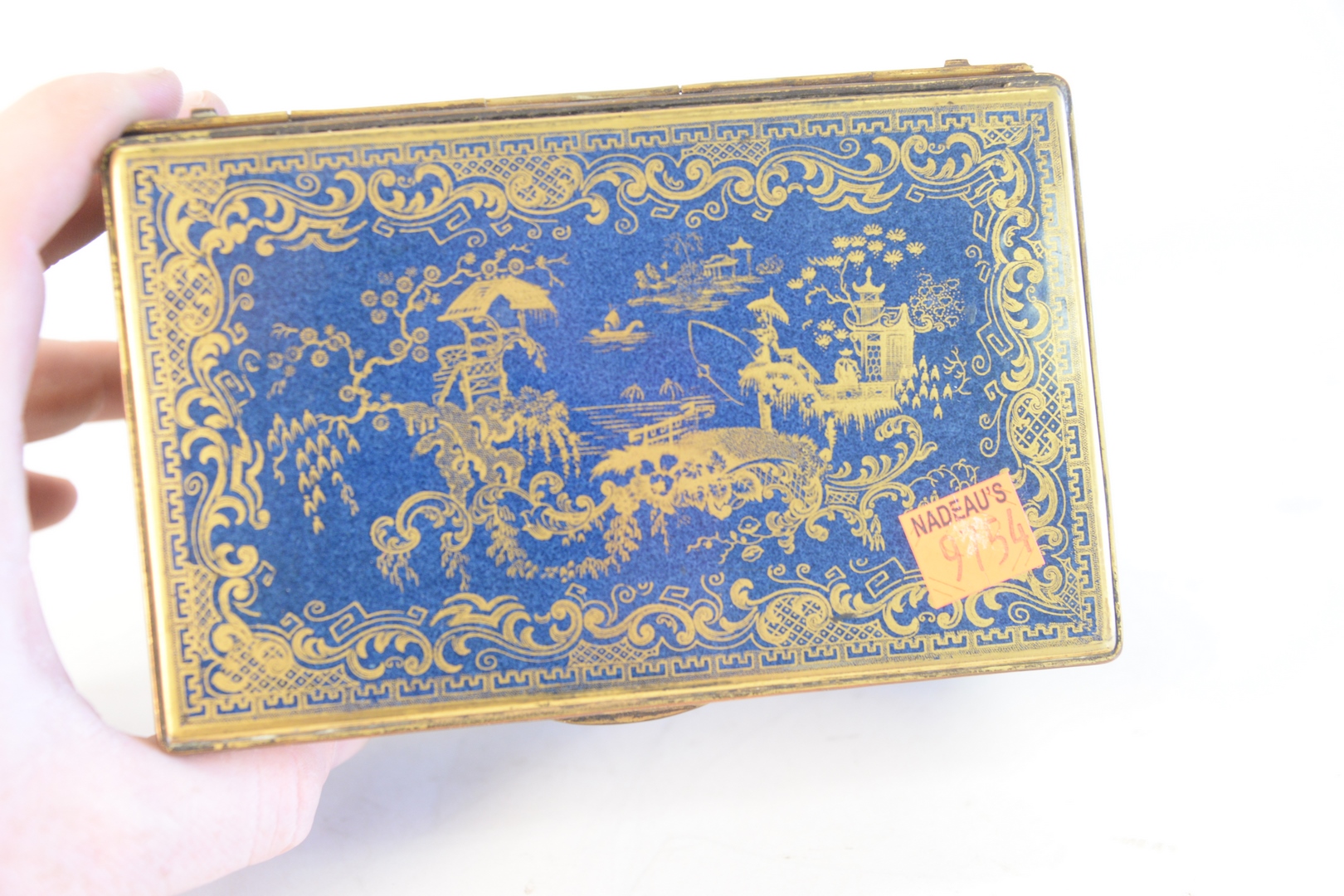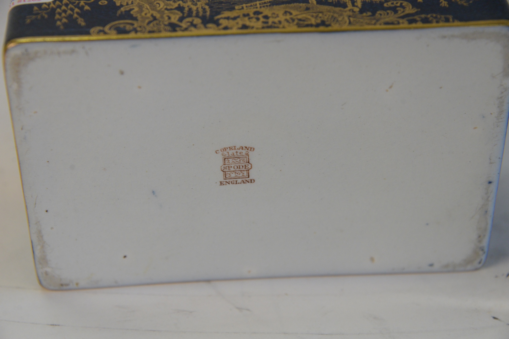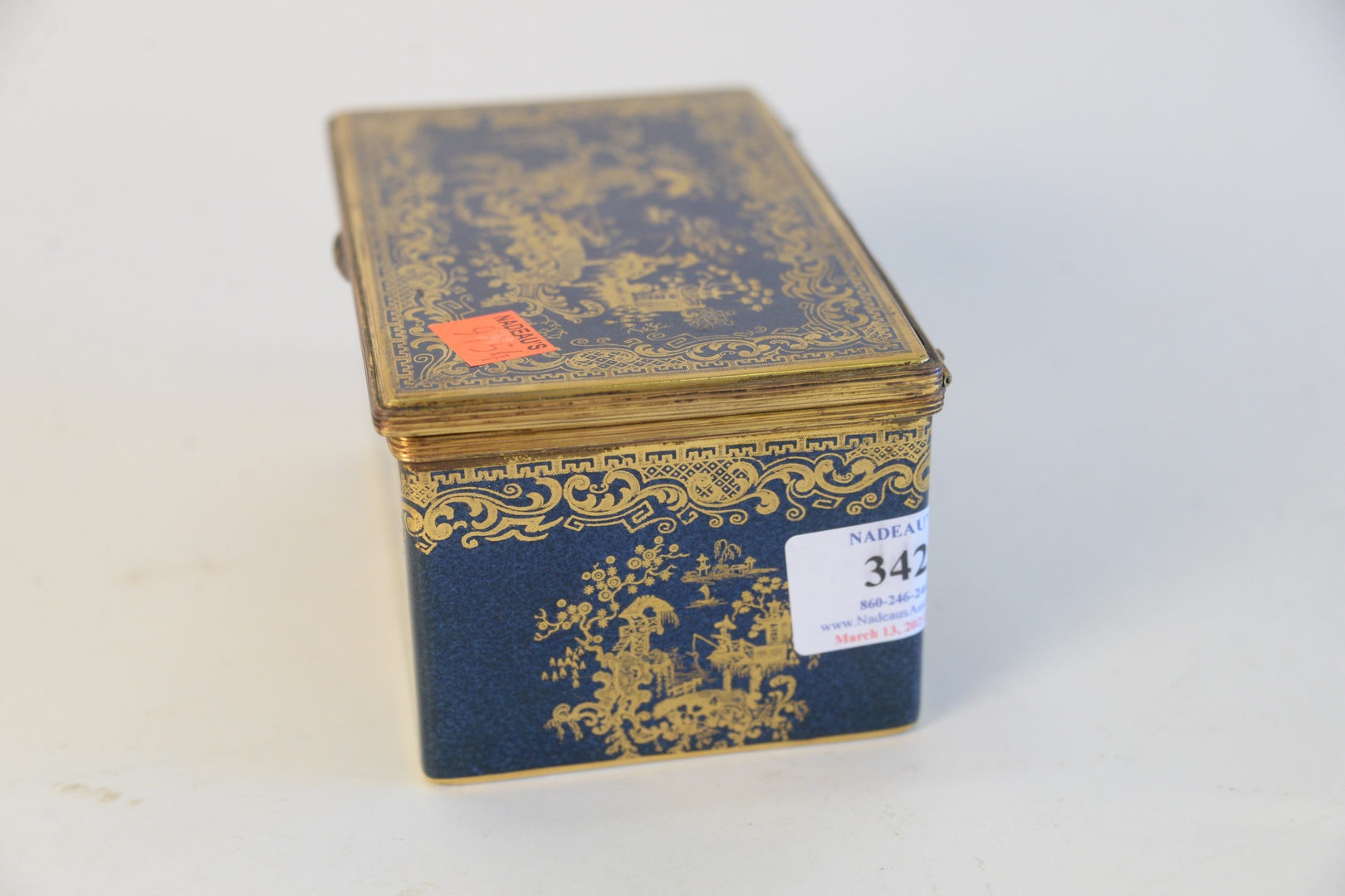 Lot 342: Copeland Spode Box, with hinged lid, reeded brass trim, all in a powder blue with Chinese gilt decoration, height 3 1/4 inches, top …