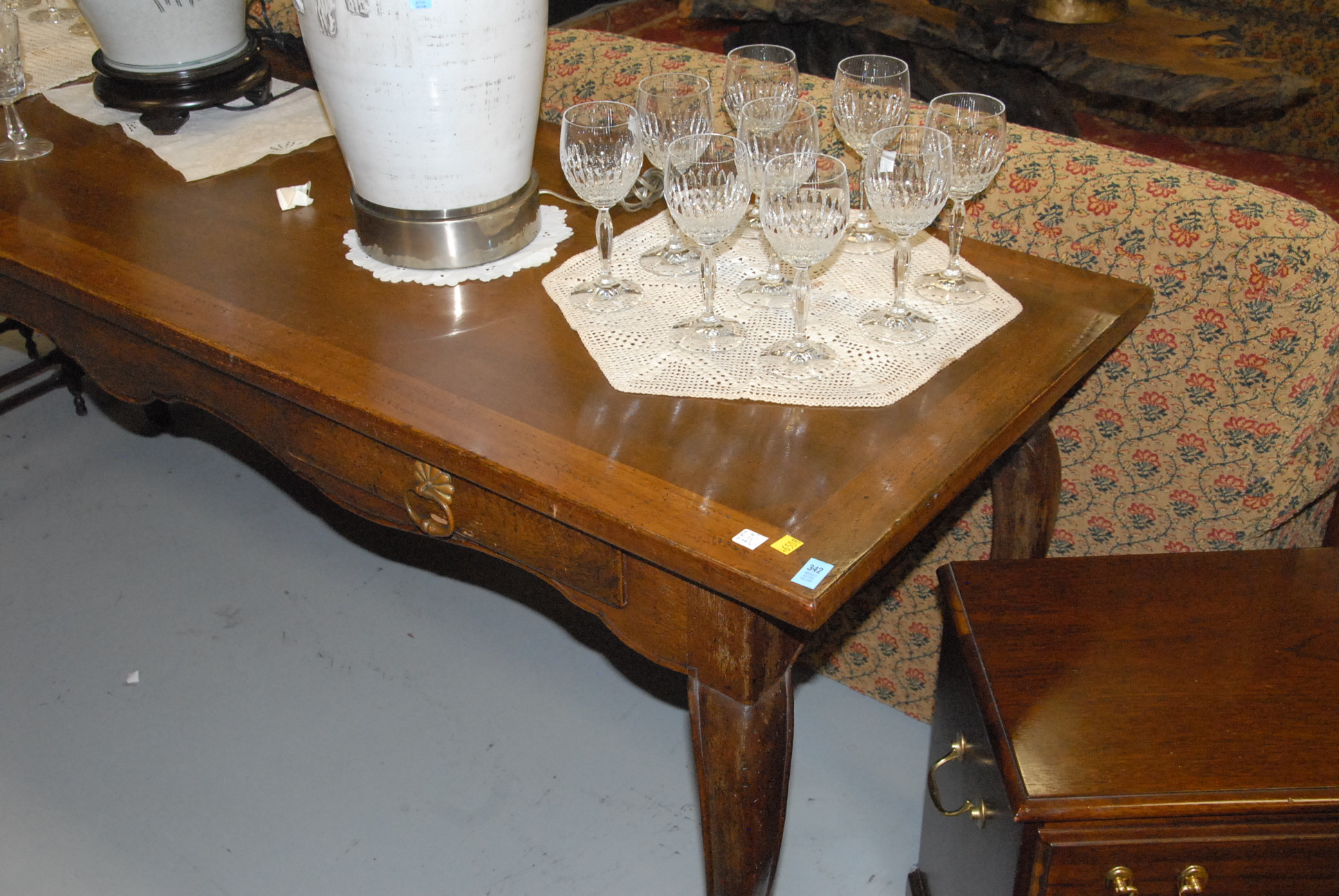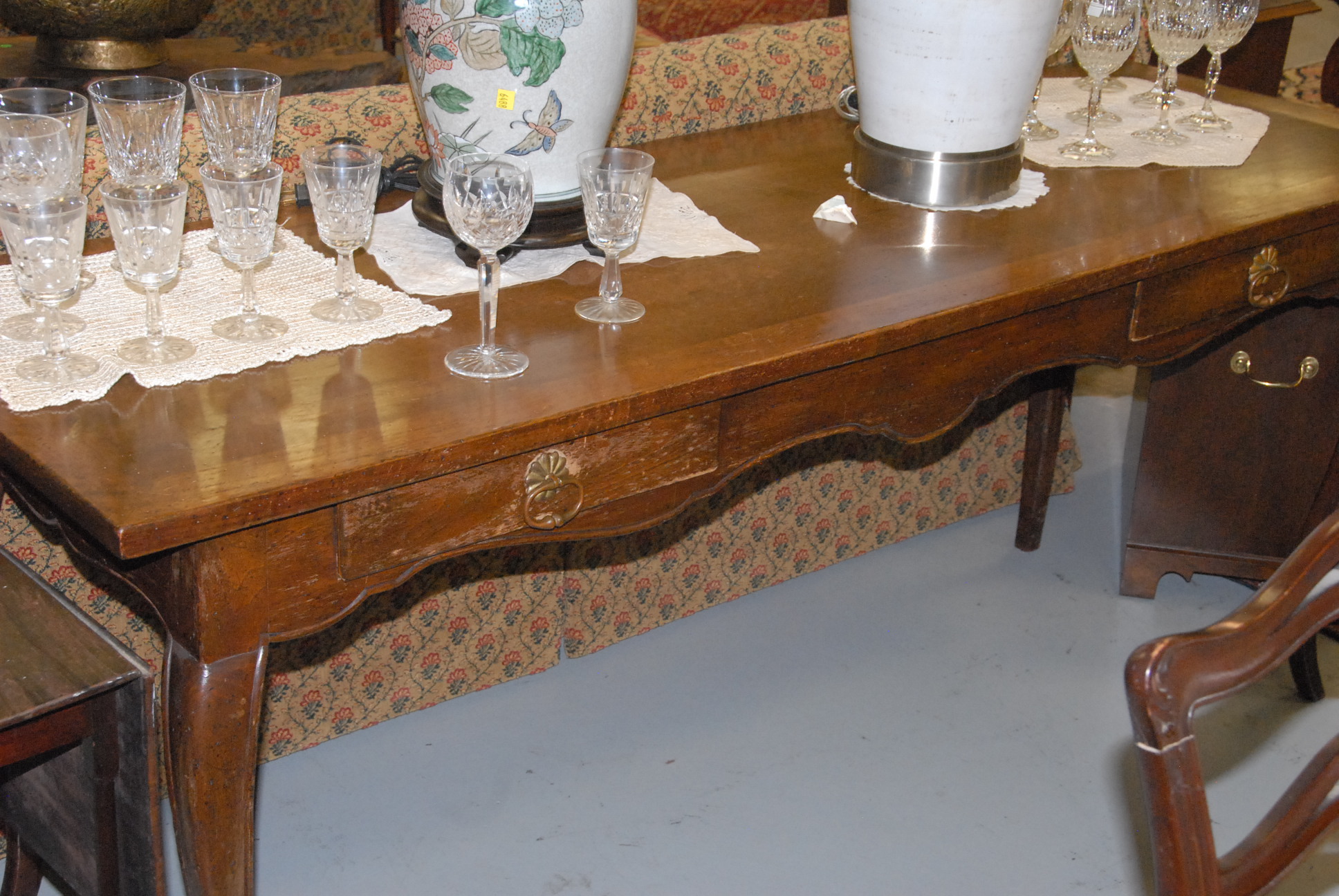 Custom walnut Louis XVI style table with two drawers, signed on drawers New York City, ht. 30in. lg. 72in. dp. 24in. Provenance: property from a home in Rockville Center, New York which was decorated by Iris Apfel.