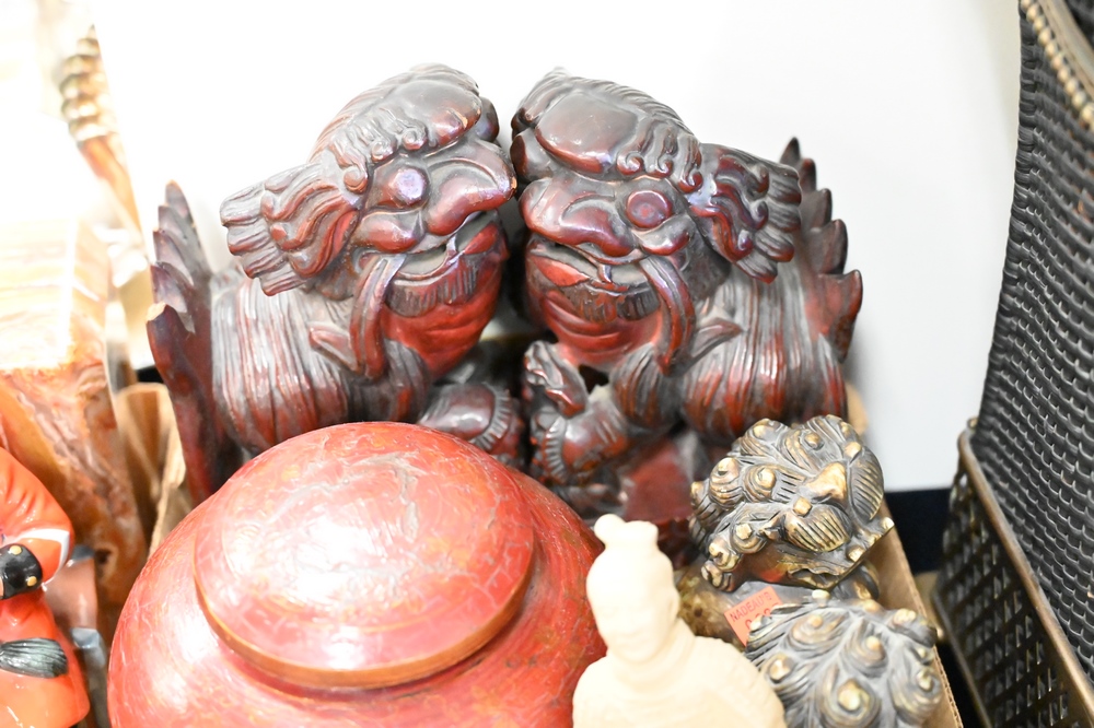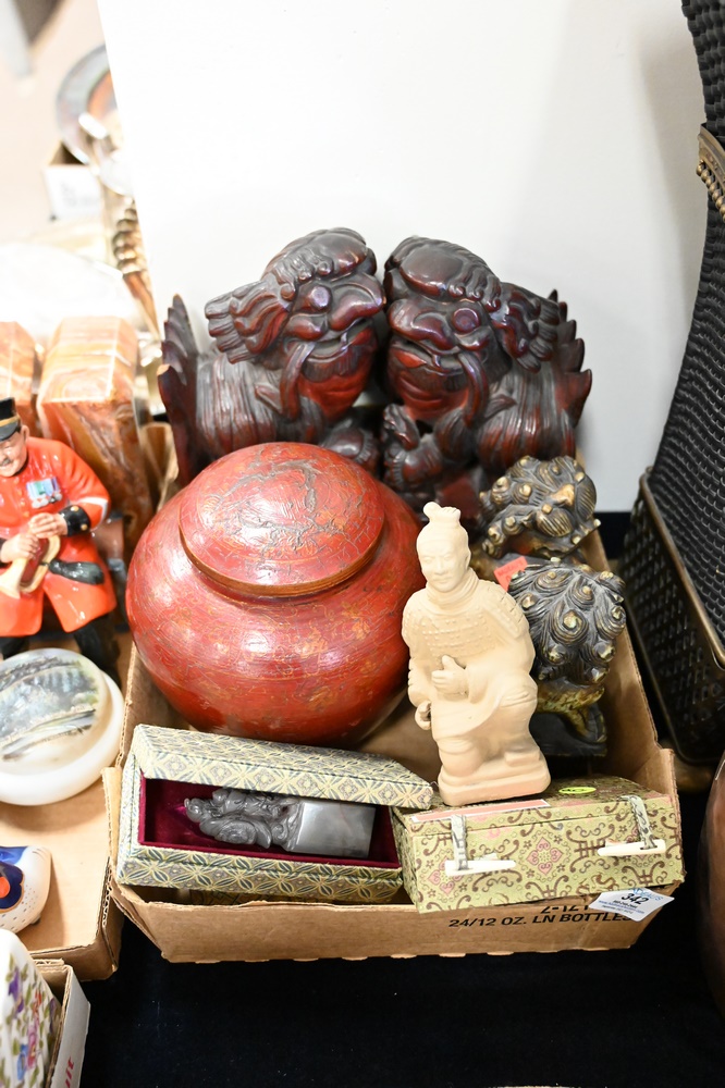 Lot 342: Eight Piece Chinese Lot, to include a pair of carved wooden foo dogs, a pair of soapstone foo dogs, terracotta kneeling army figure, wood painted lidded vessel, a small blue and white round box, along with a carved seal, tallest foo dog 10 inches.