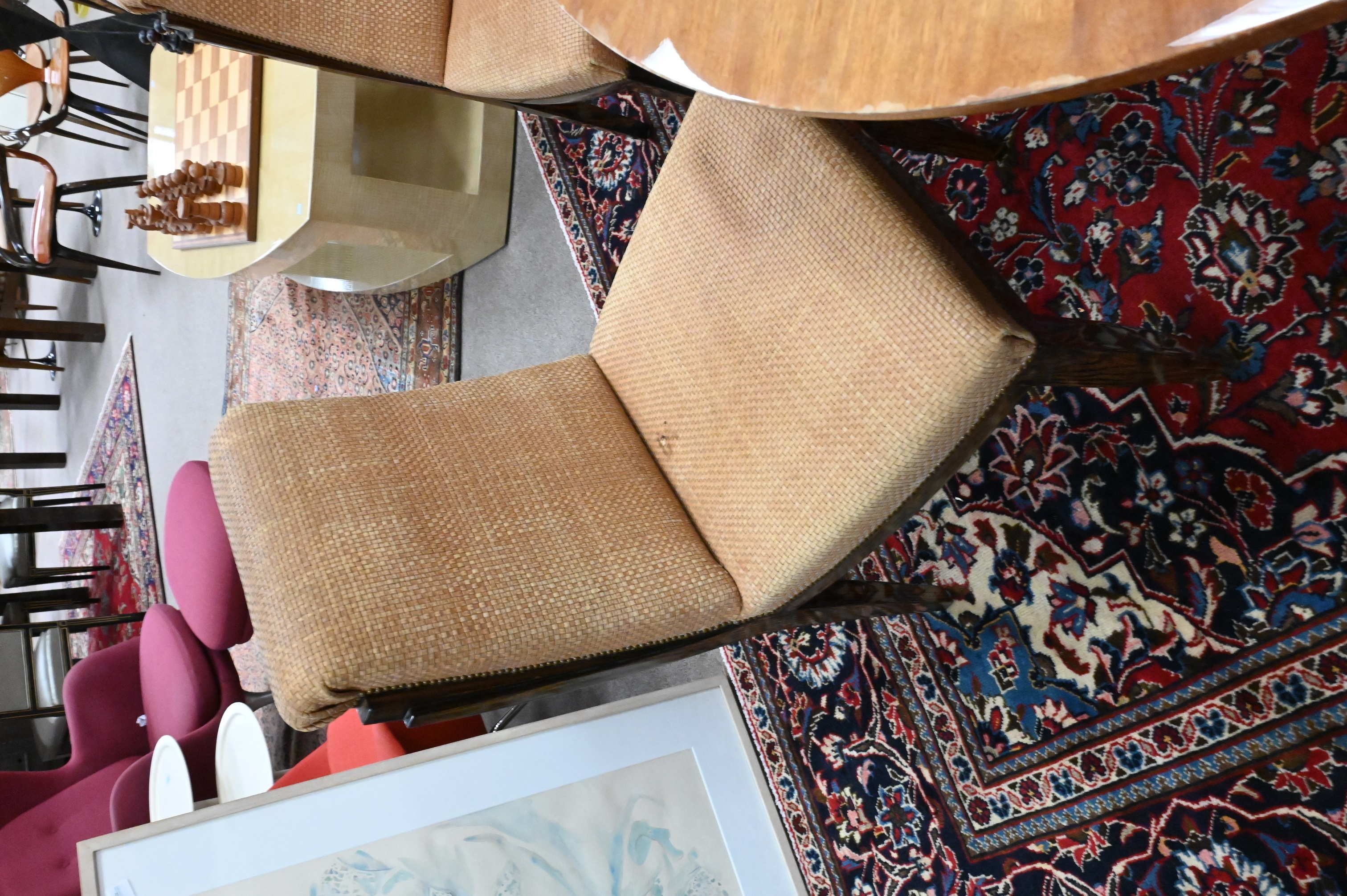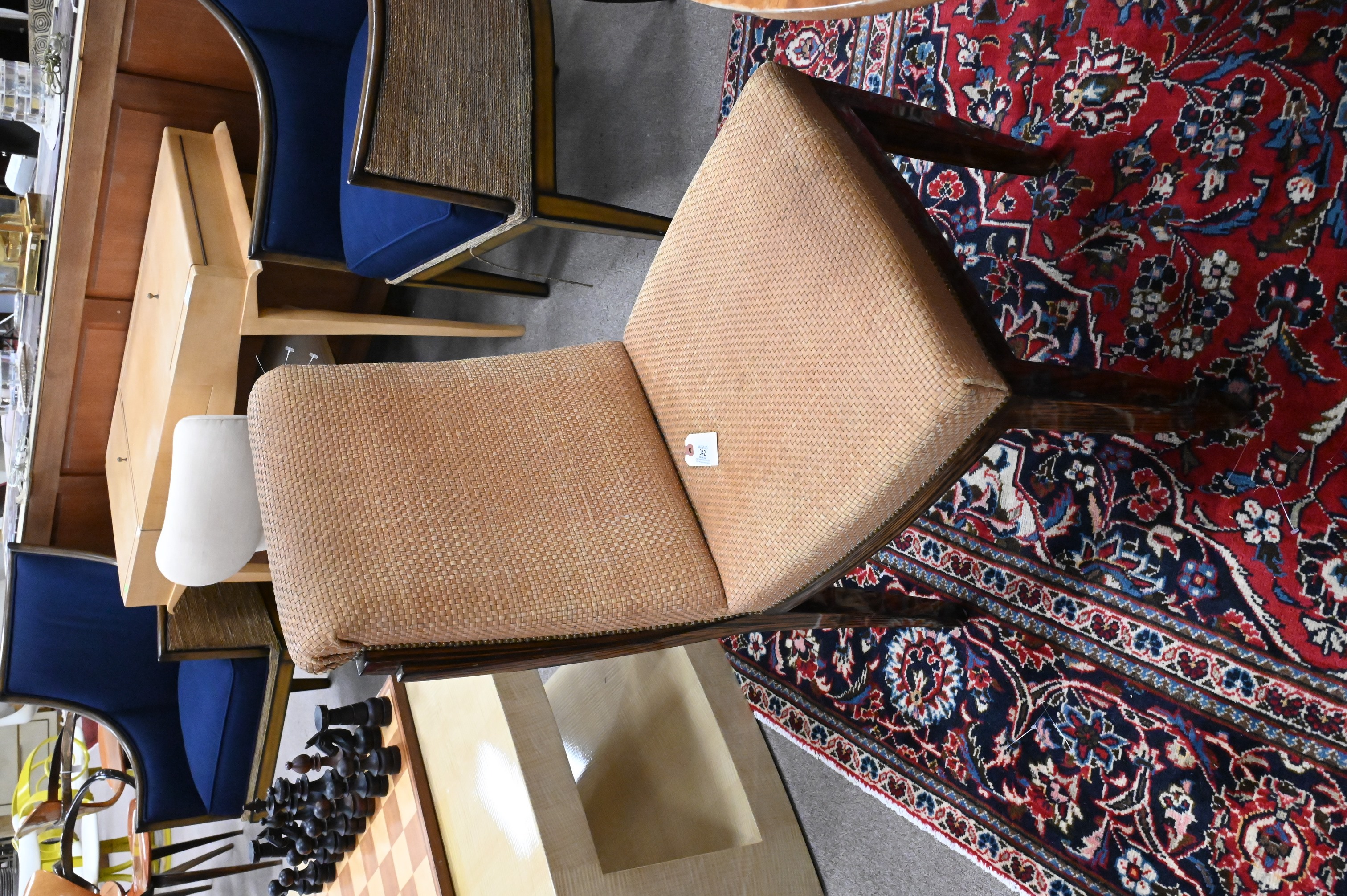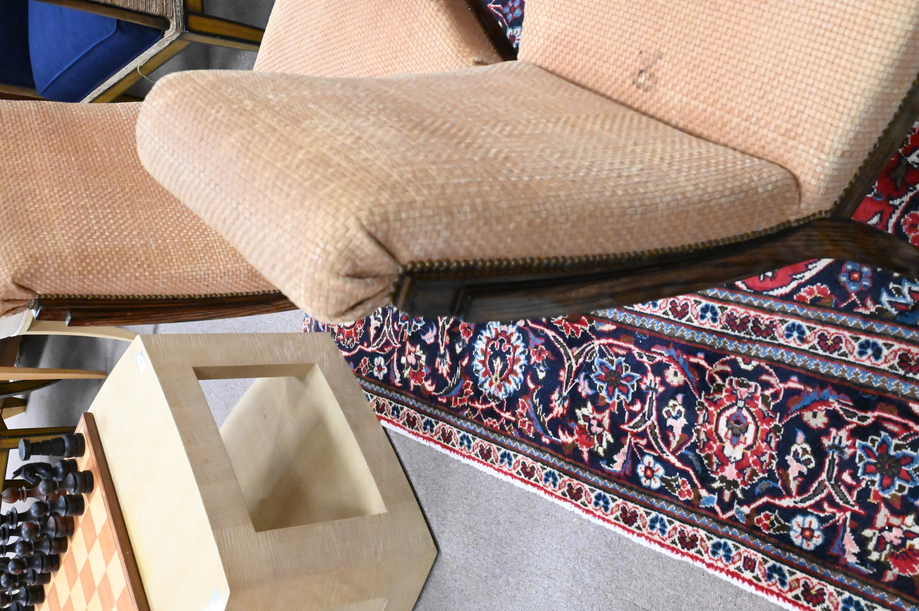 in woven leather upholstery having hobnail accents and faux Rosewood veneer