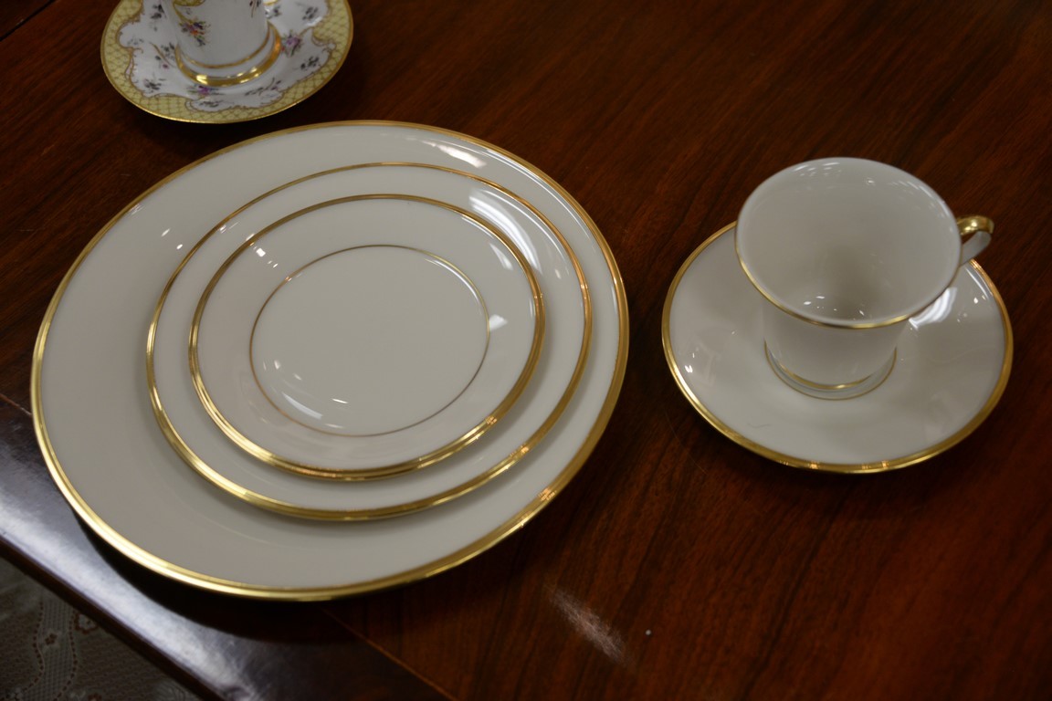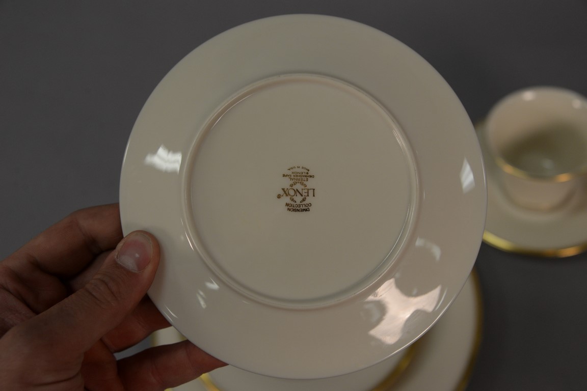 Lot 342: Group lot of Lenox Eternal dinner set, setting for eight plus sugar, creamer, serving bowl, one dinner, one salad, one lunch, and on…