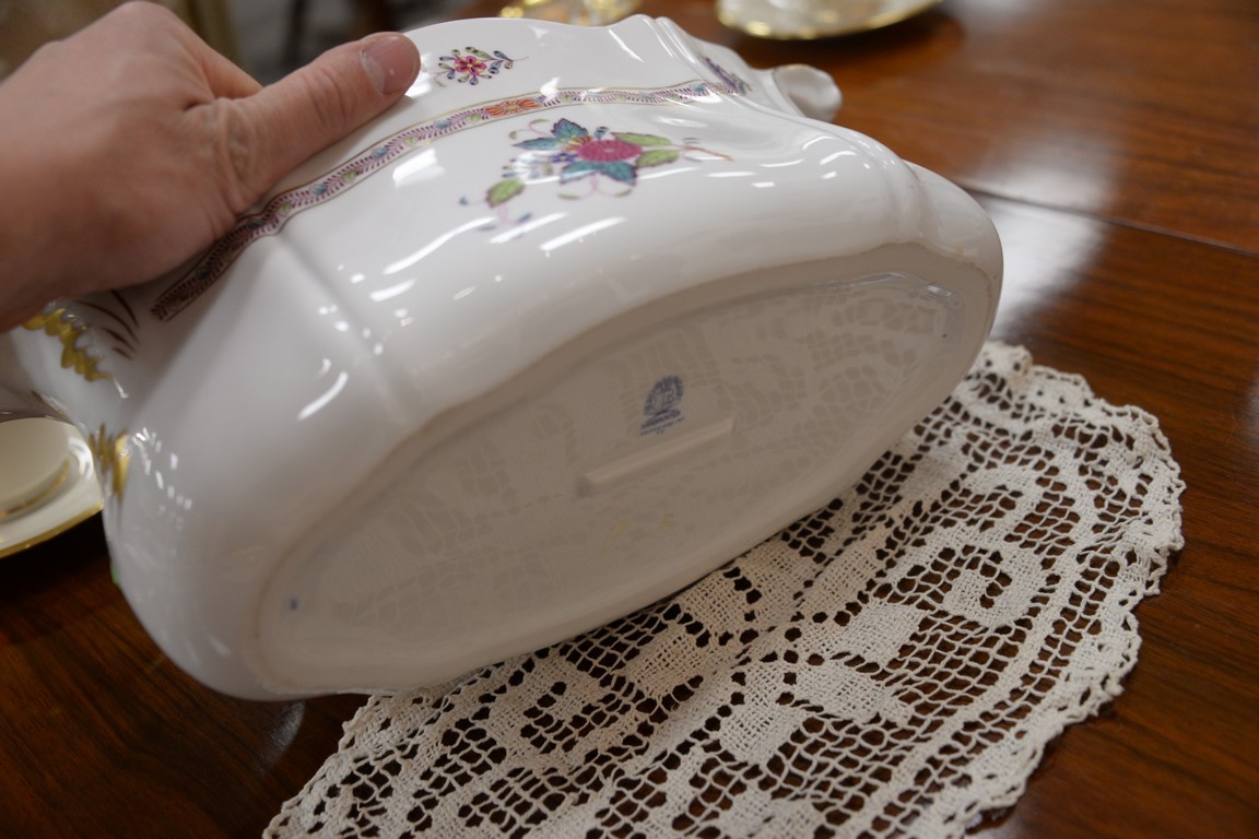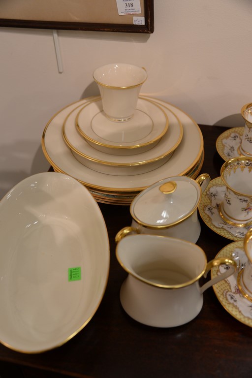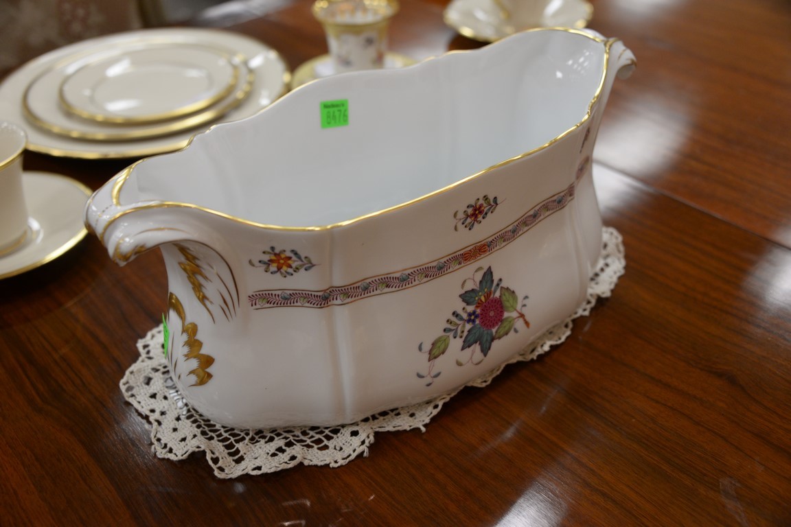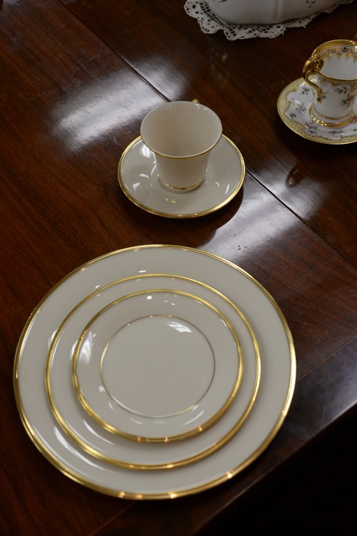 Group lot of Lenox Eternal dinner set, setting for eight plus sugar, creamer, serving bowl, one dinner, one salad, one lunch, and one cup along with plus Herend center piece and four Worcester plates, 52 pieces total.