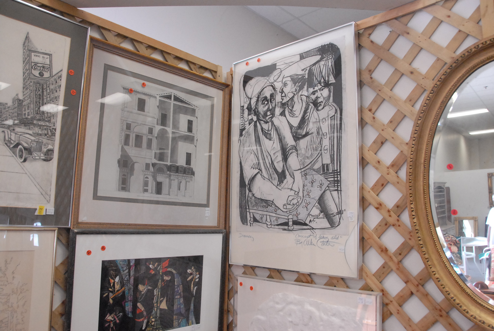 Group of eight framed pieces architectural print, 3 dimensional piece, concept of Living Old by Allen Carte, Beamer McCombs etching Street Corner etc.