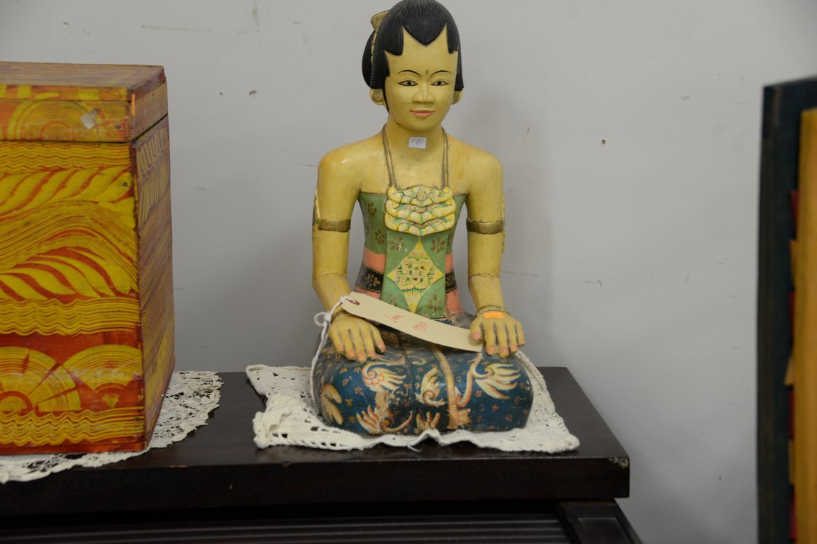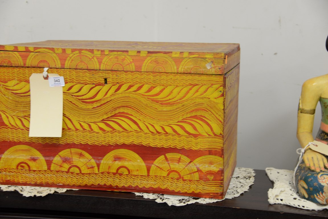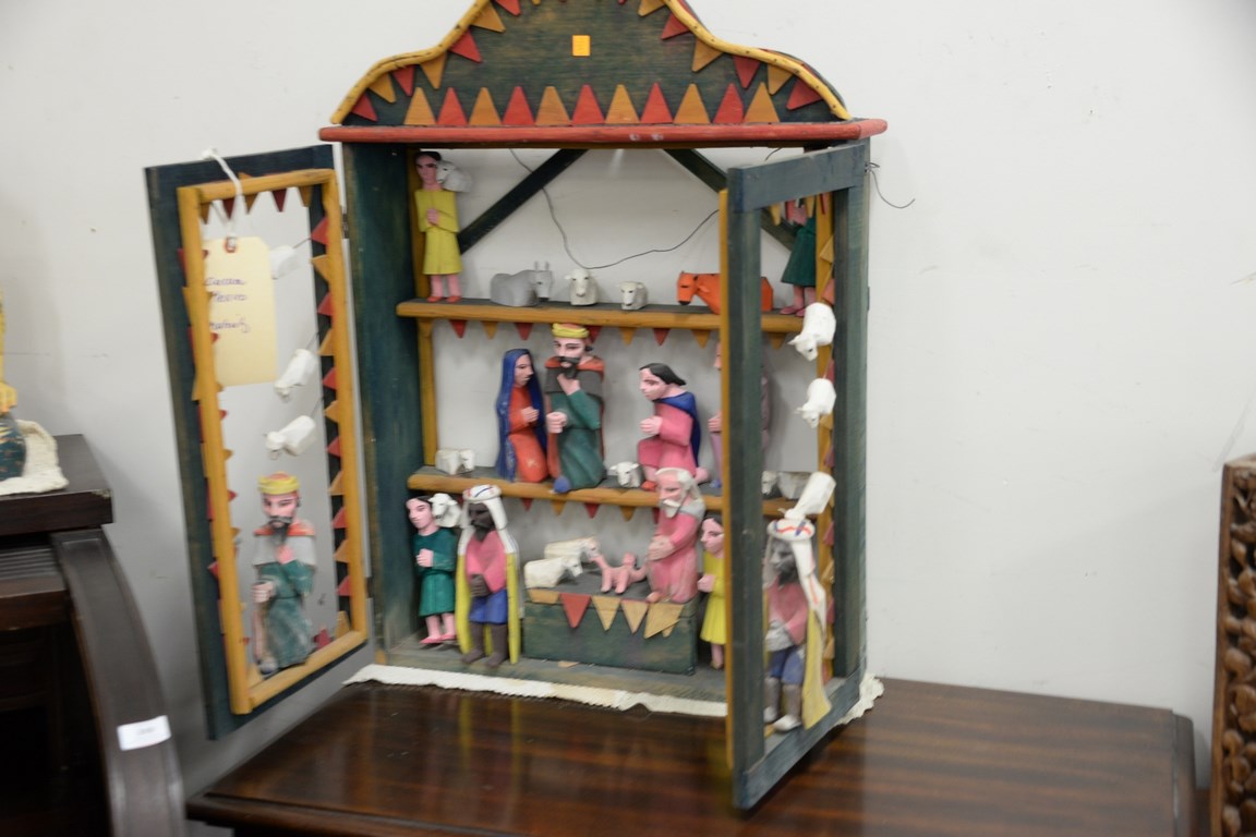 Lot 342: Large group of carved Mexican and South American pieces to include a three dimensional religious case, paint decorated lift top box,…