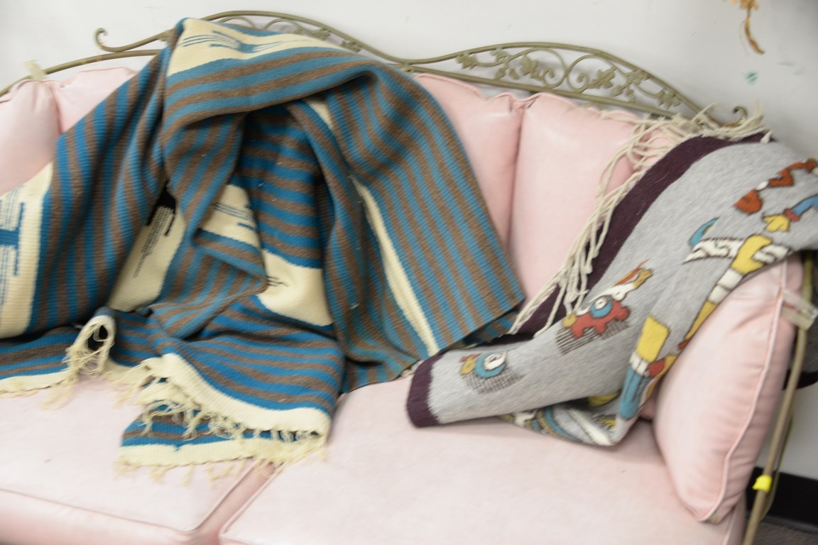 Large group of carved Mexican and South American pieces to include a three dimensional religious case, paint decorated lift top box, two carved seated figures ht. 18 & 20, three head dresses lg. 45 to 60, and two blankets.