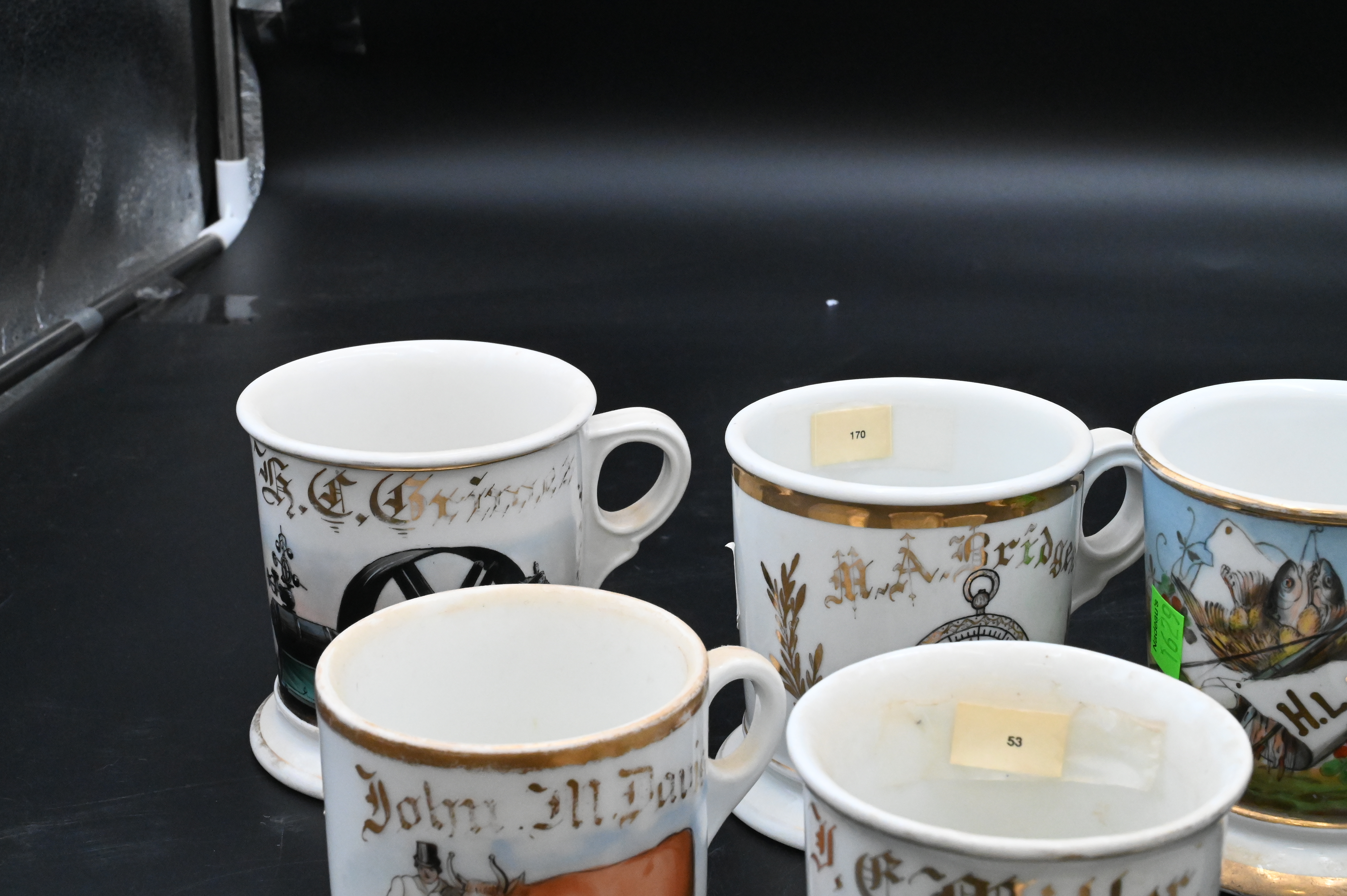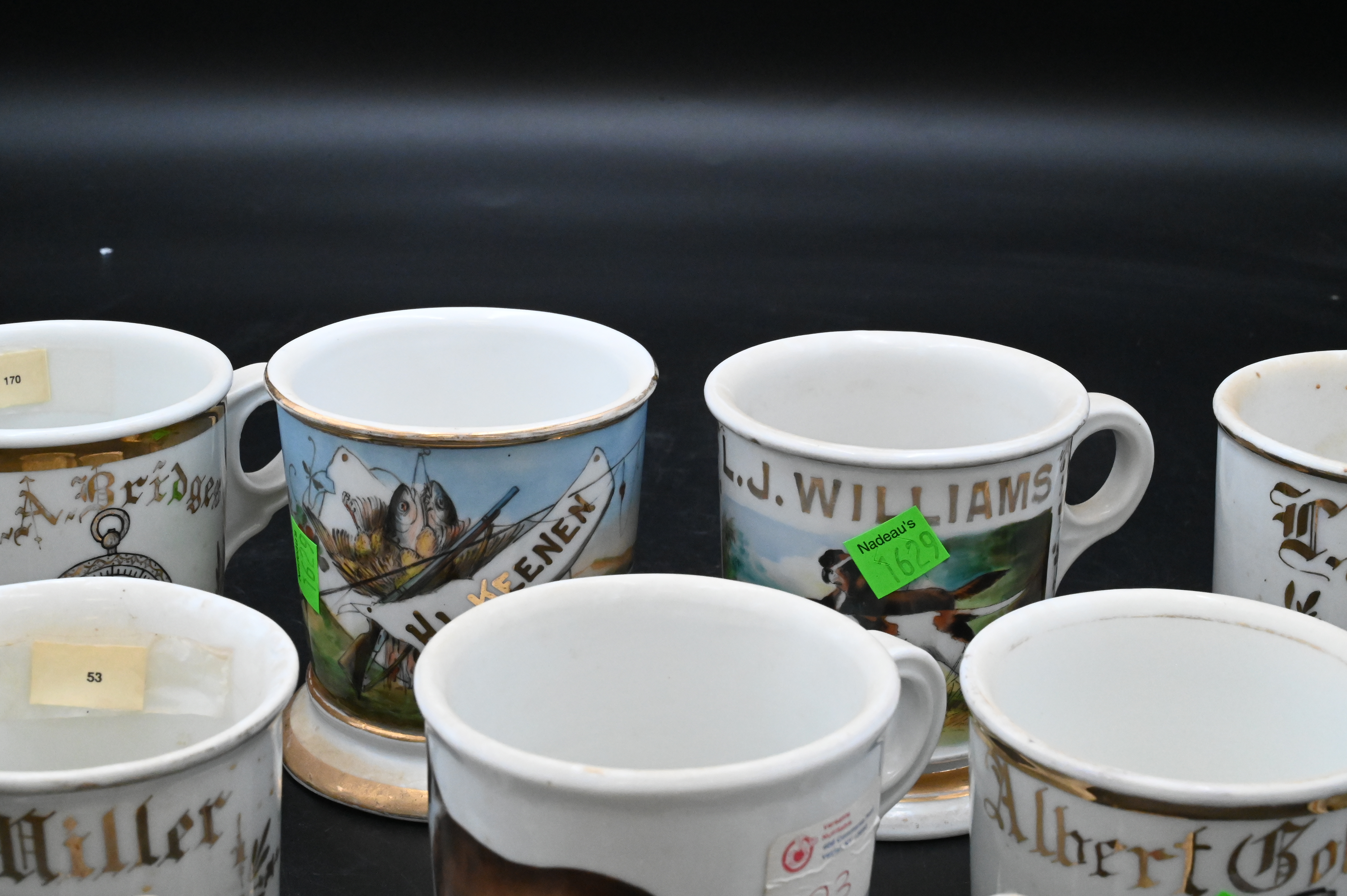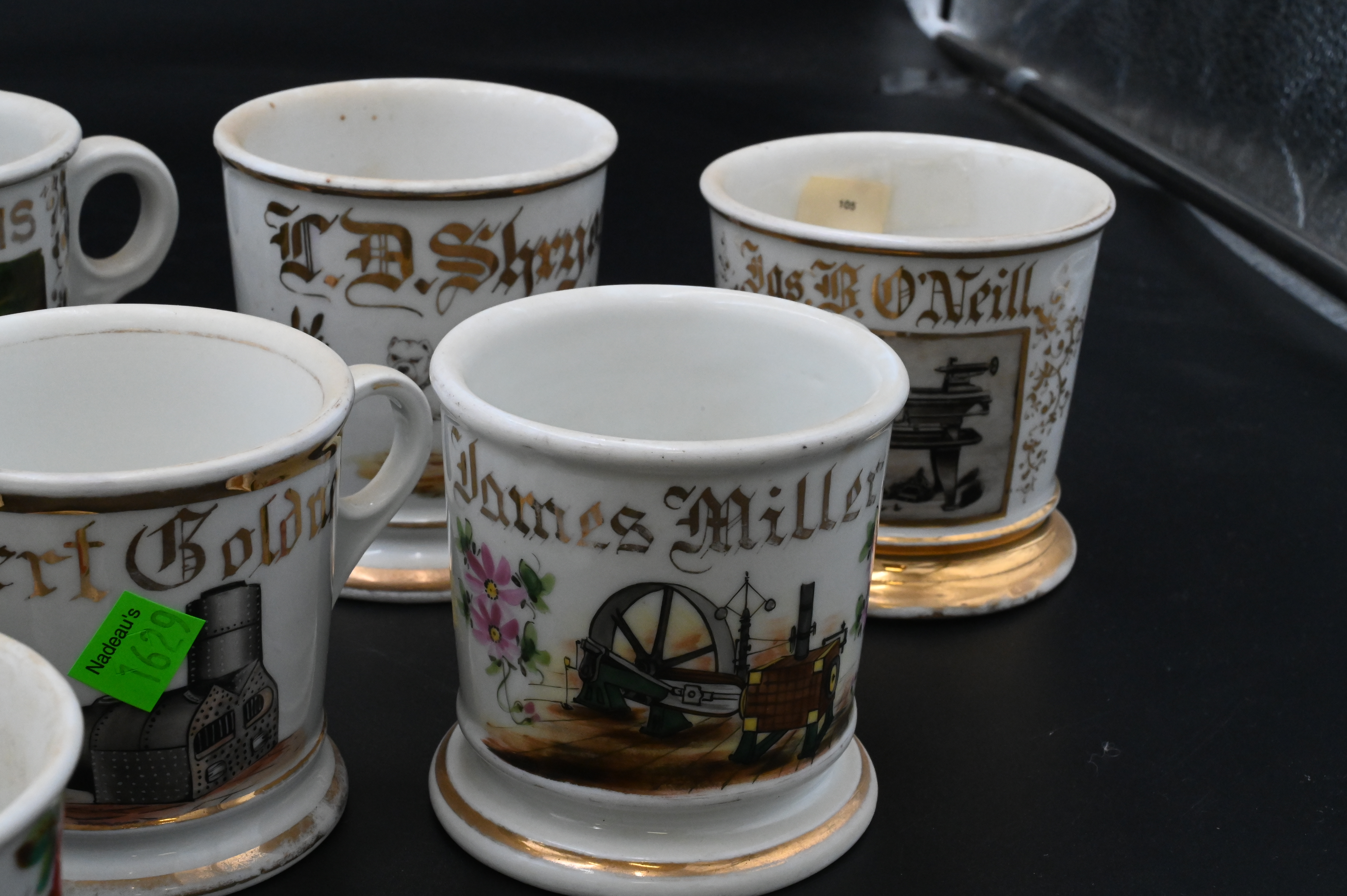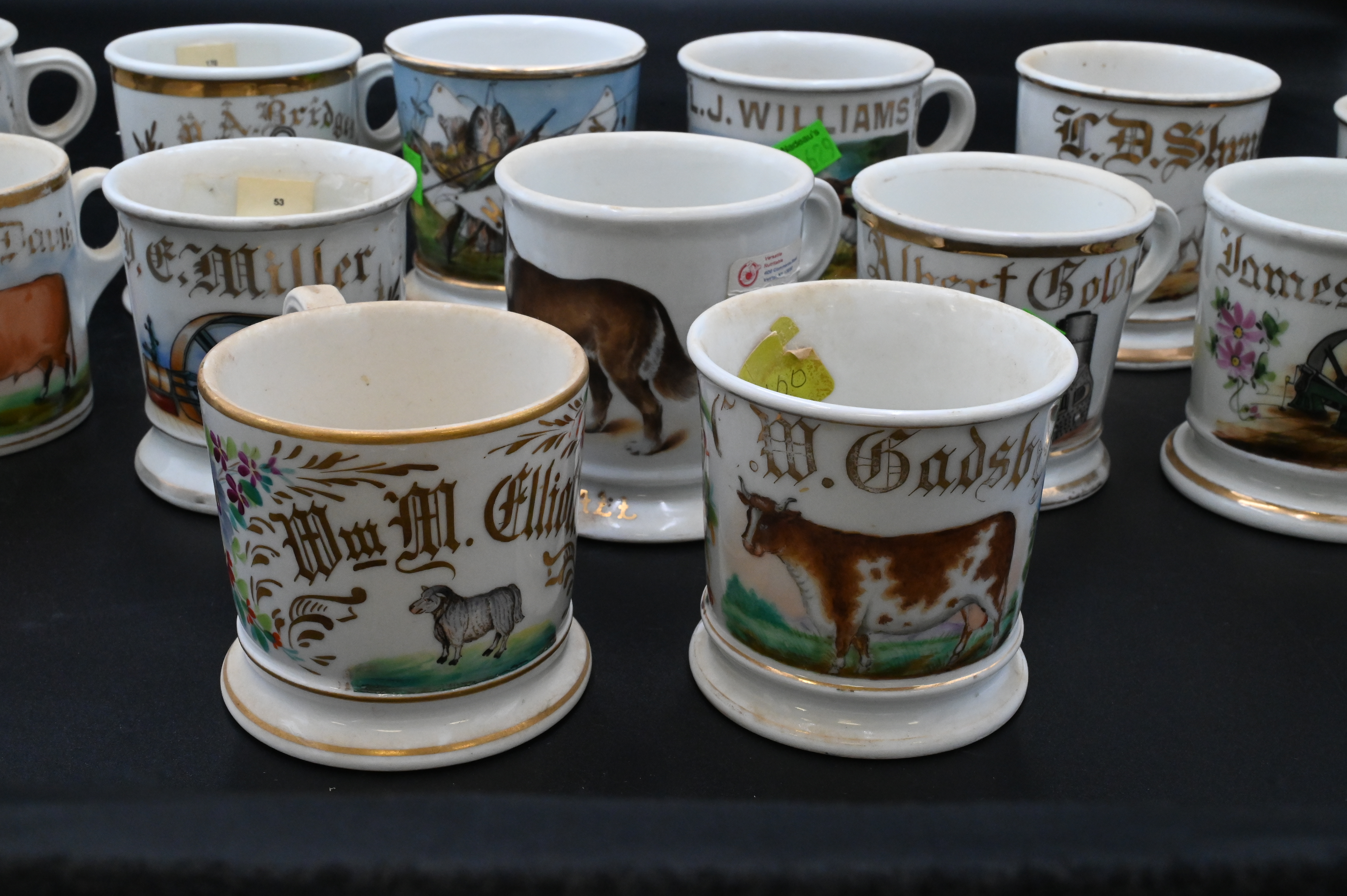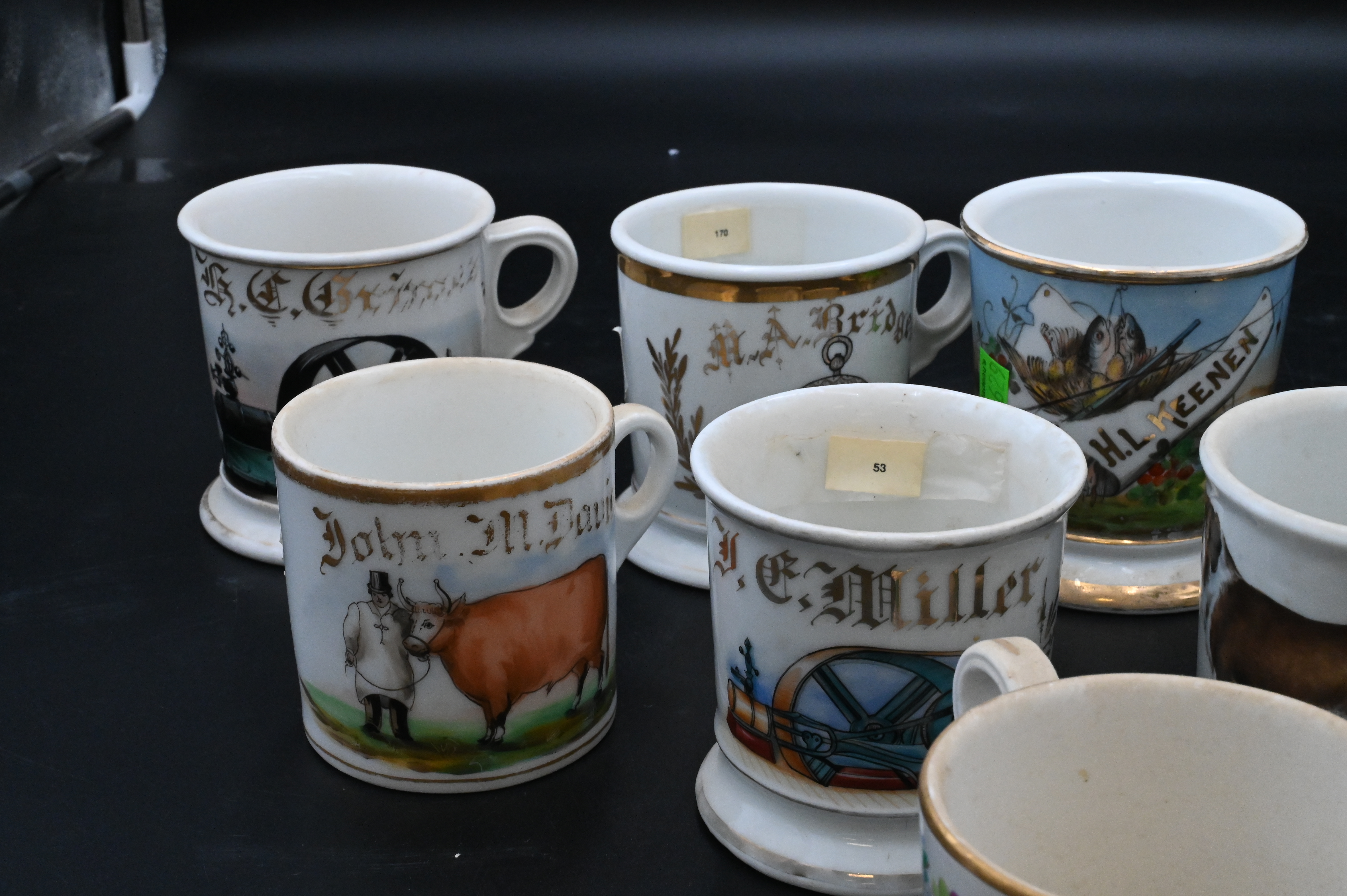 Large Grouping of 13 Occupational Shaving Mugs, having animal and machinery themes, various markings to include Limoge France and Heckel Bros. Decorators, tallest height 4 inches, diameter 3 1/2 inches, Provenance: Estate of Donald K. Huber