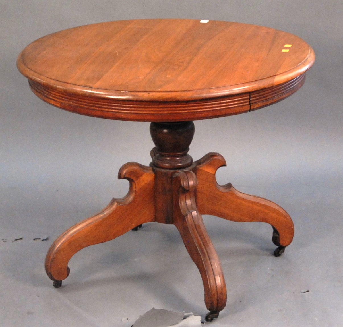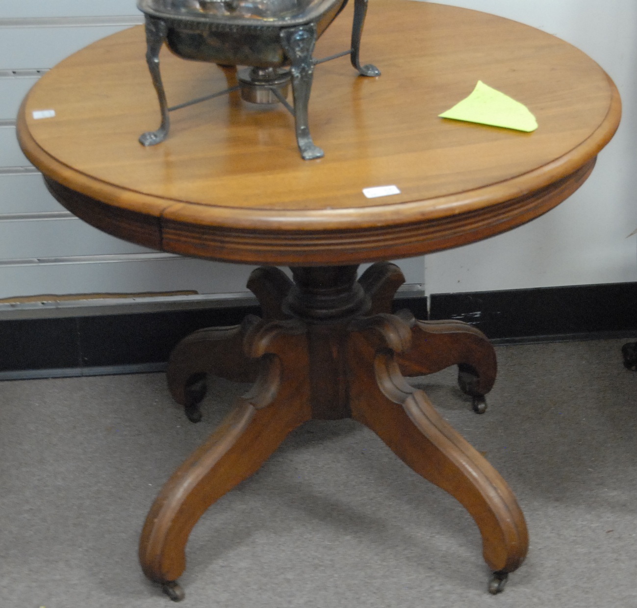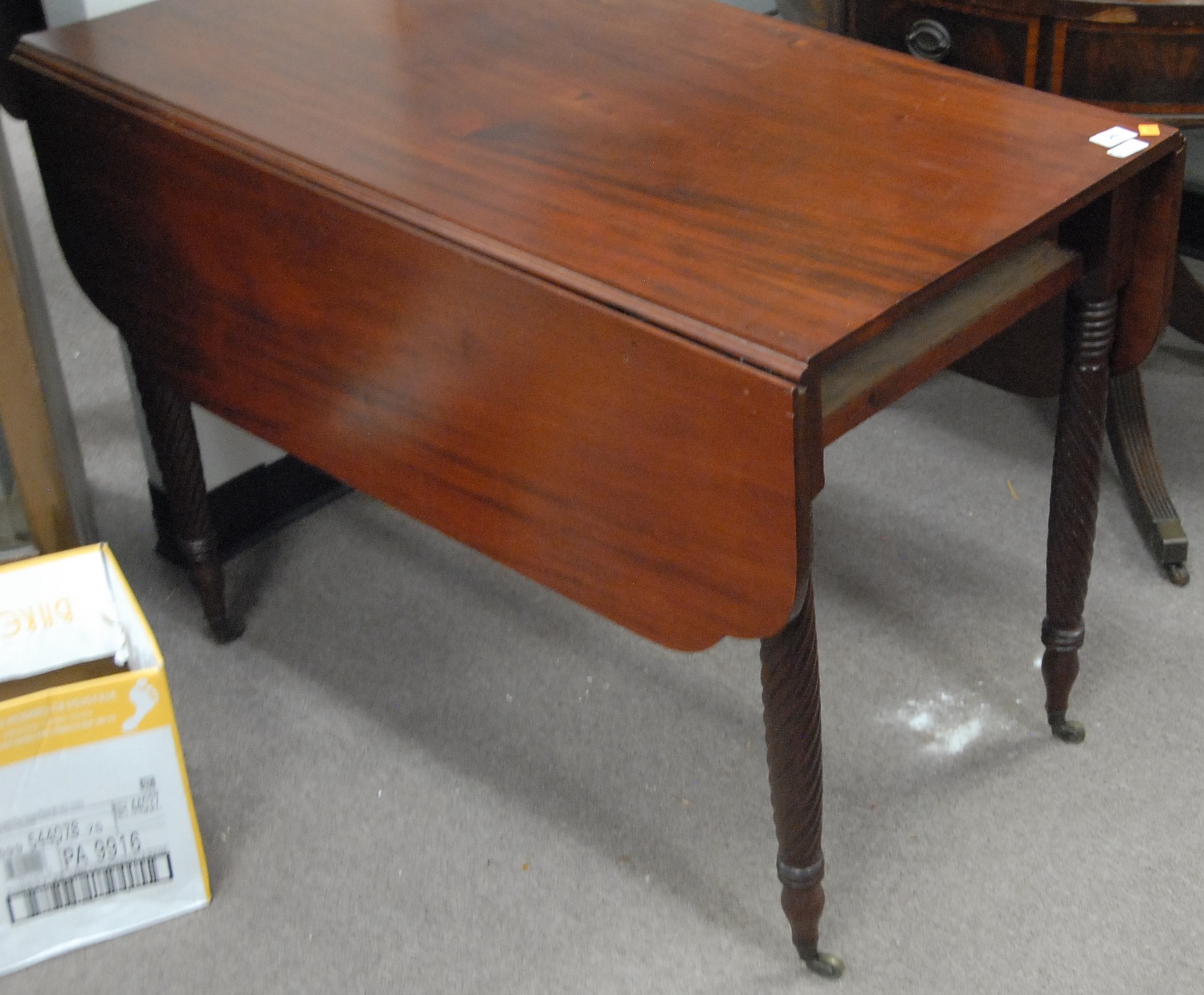 Mahogany Sheraton drop leaf table missing drawer and round Victorian table.
