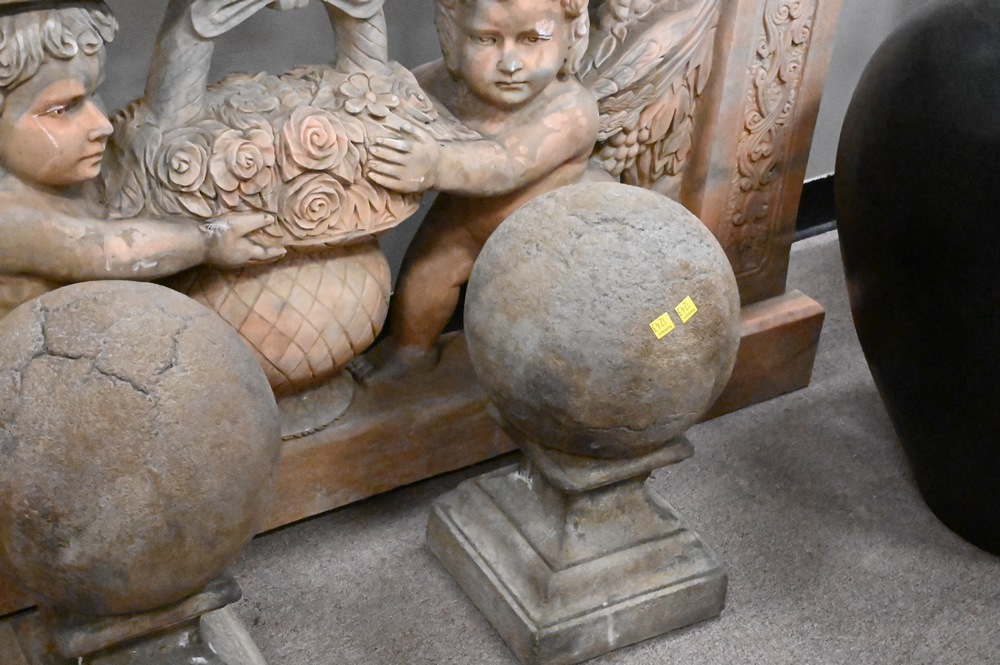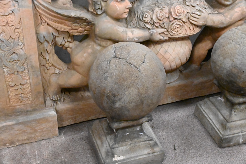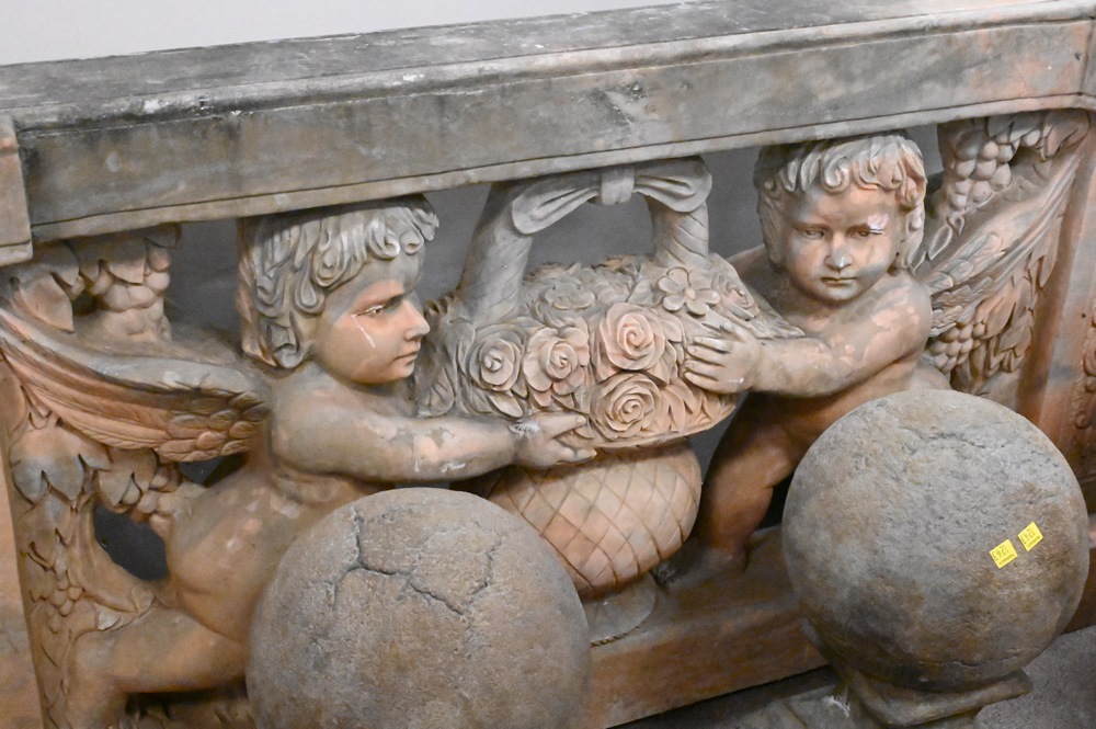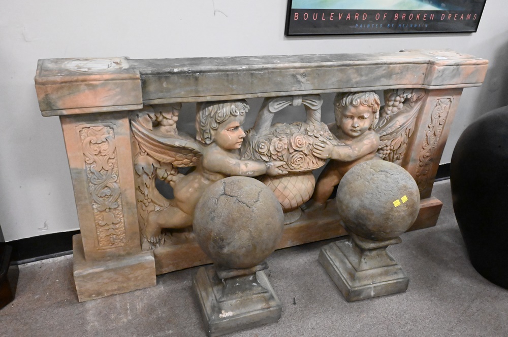 Lot 342: Marble Carved Wall, to include two ball tops, height with tops 49 inches, length 59 1/4 inches.