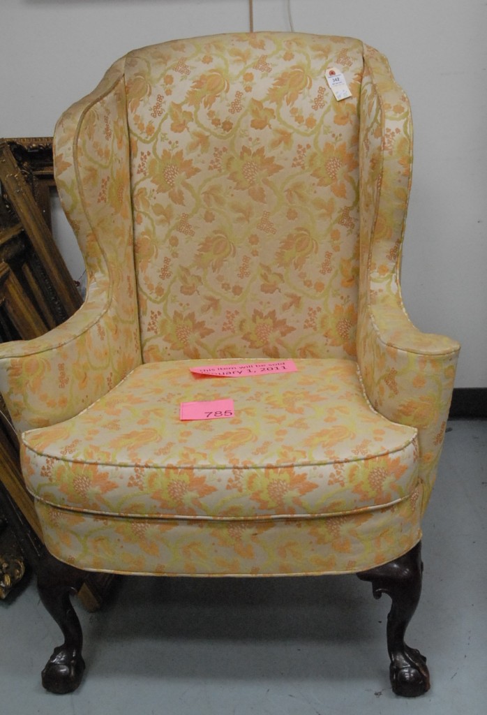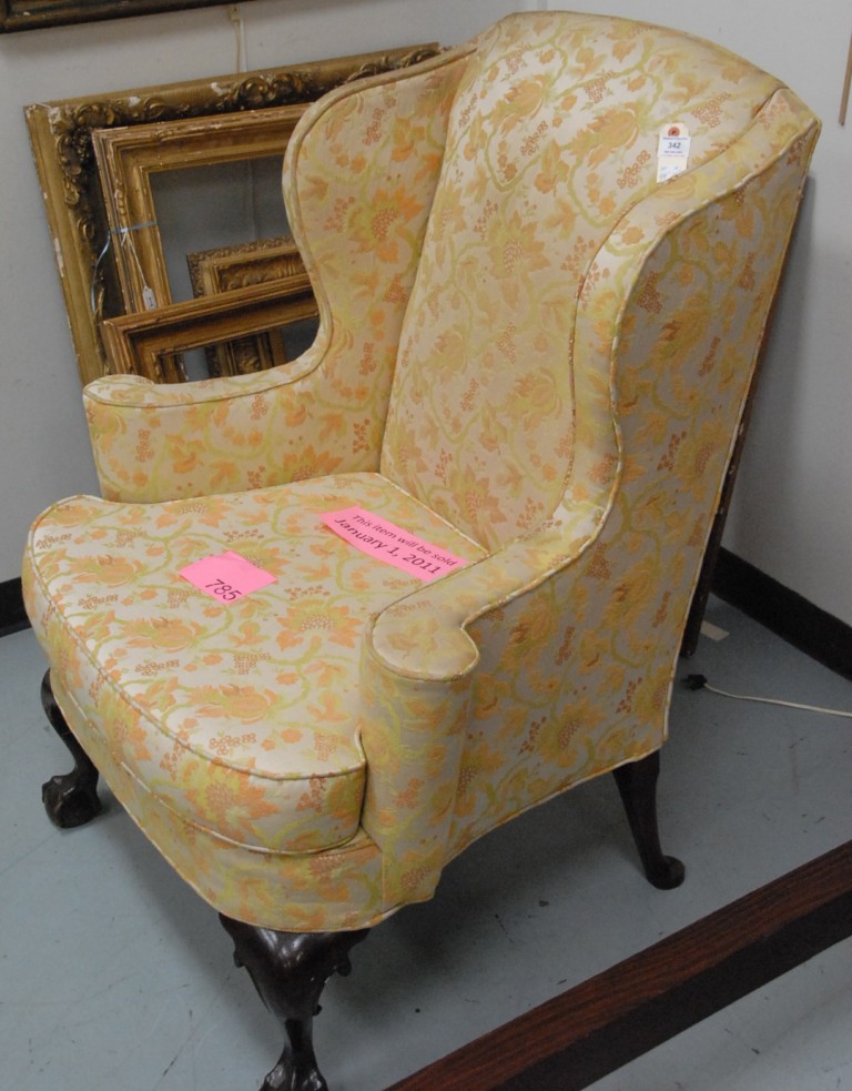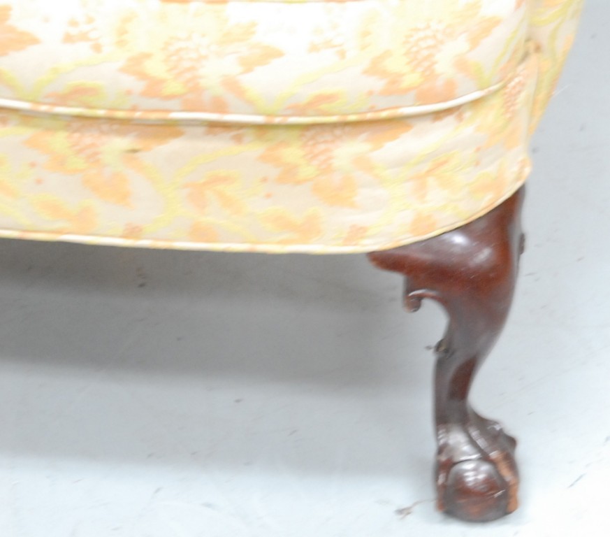 Margolis mahogany Chippendale style upholstered wing chair on cabriole legs ending in ball and claw feet. height 44in. width 35in.