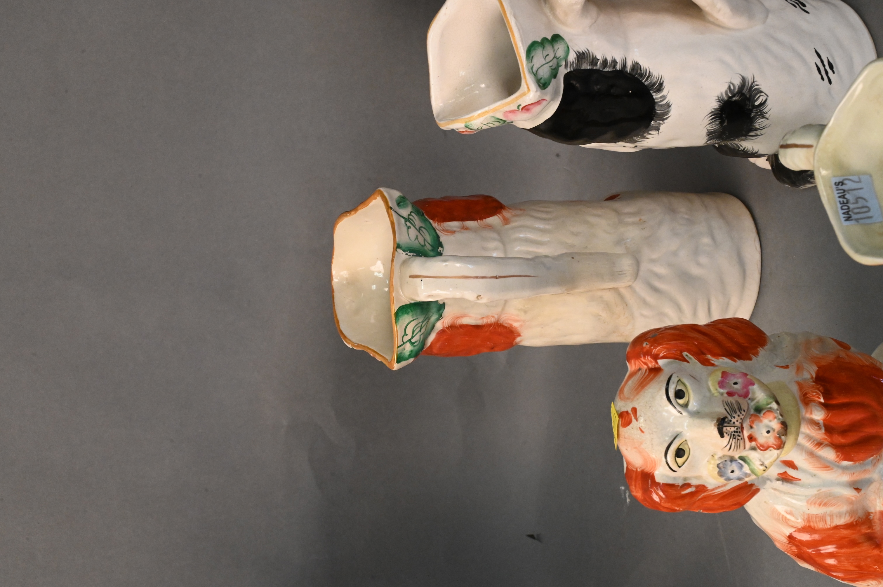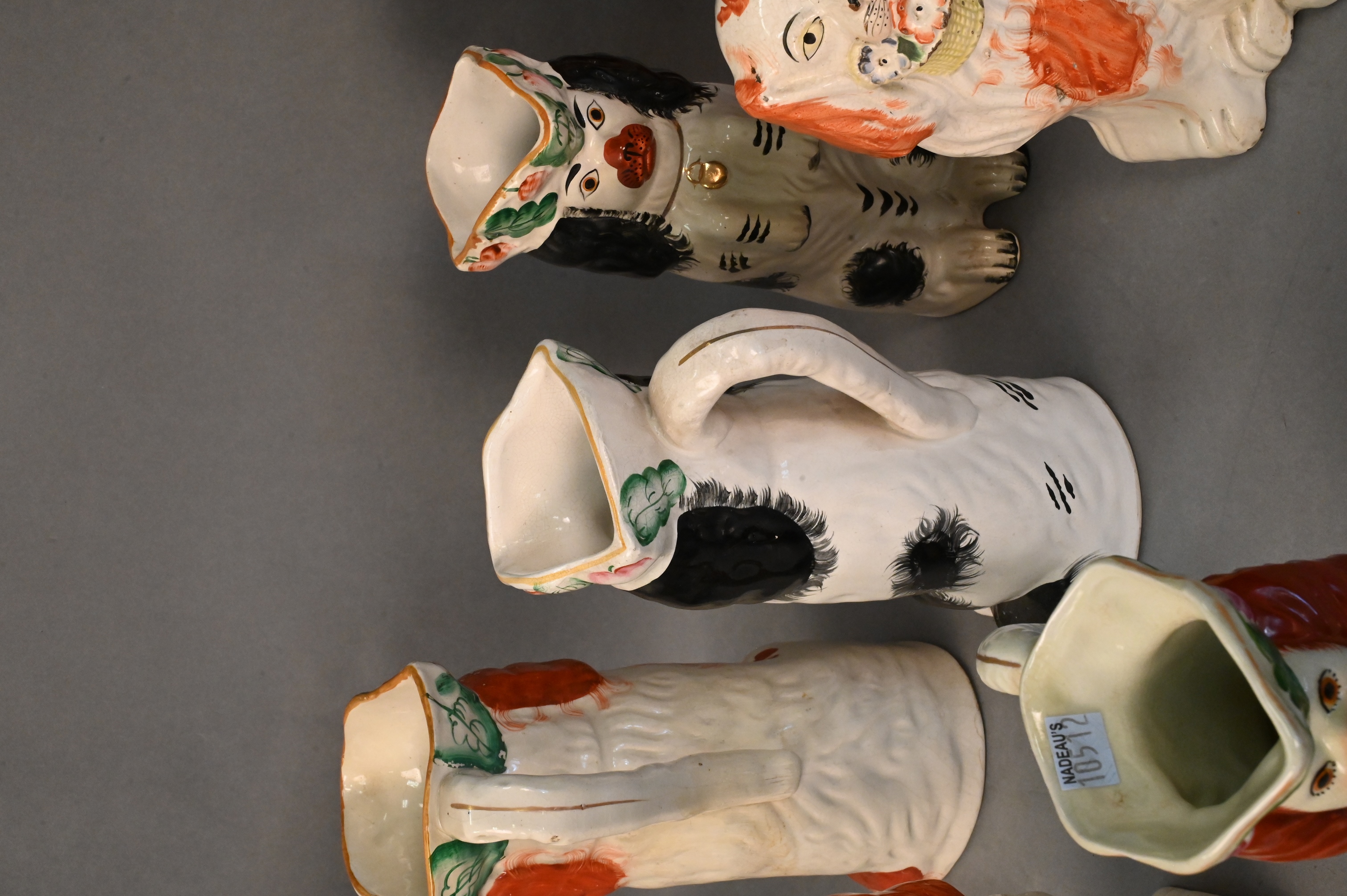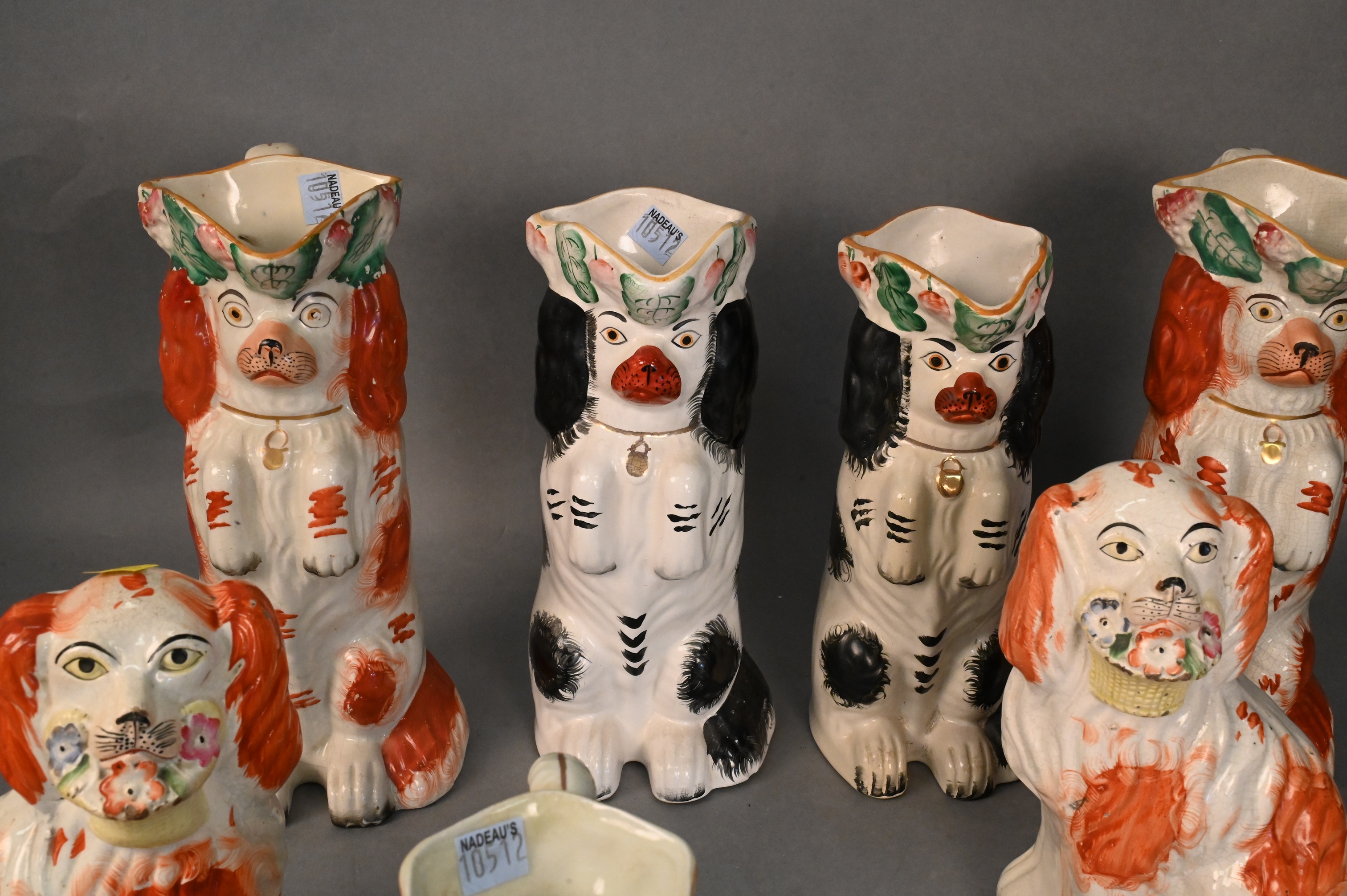 four large upright spaniel dog pitchers, one small spaniel pitcher / ewer, pair of seated dogs having basket of flowers in their mouths