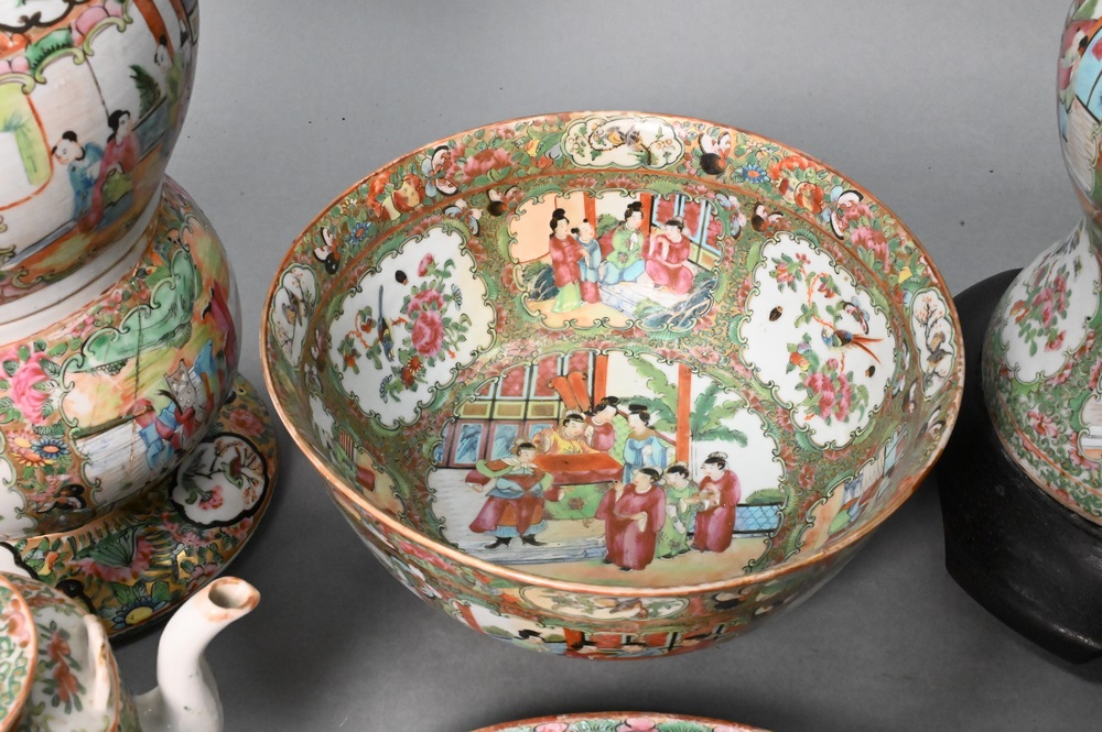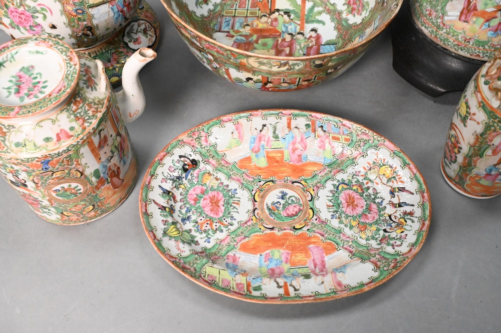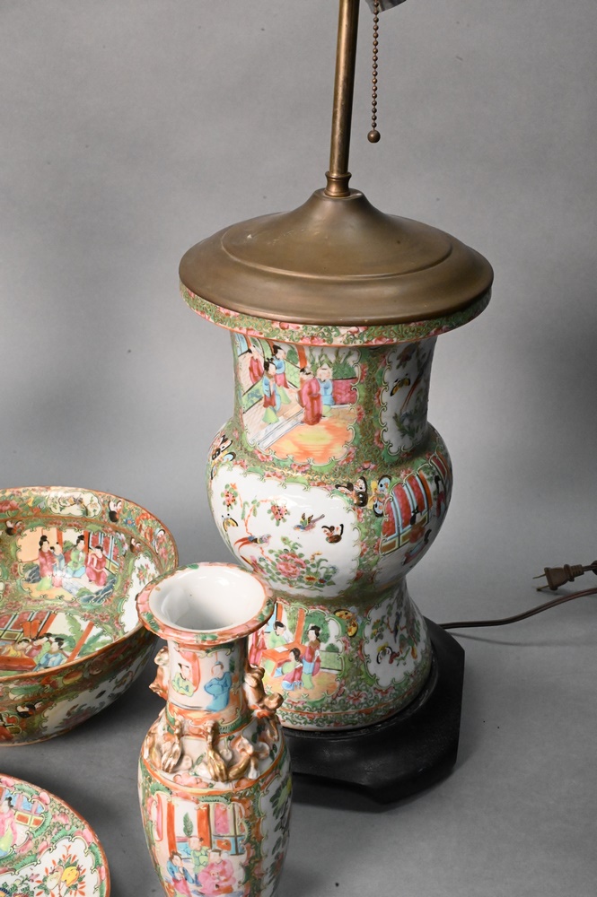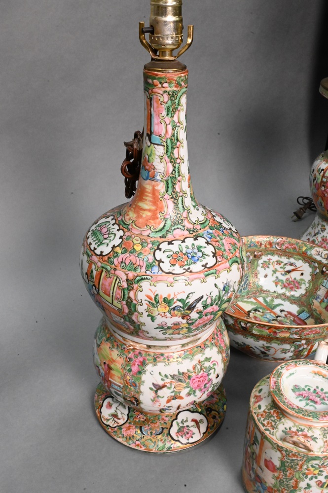 Six Piece Group of Chinese Rose Medallion Porcelain, to include a double gourd vase; beaker vase made into table lamps; small vase; oval tray; teapot; and bowl; (all as is), tallest vase 13 3/4 inches, total height 30 inches.