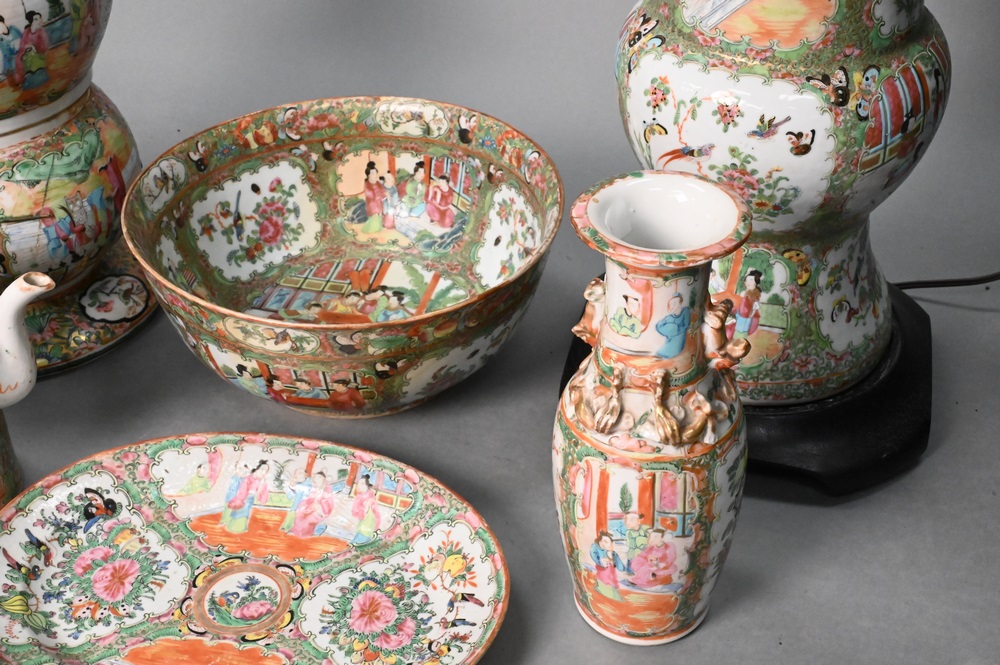 Lot 342: Six Piece Group of Chinese Rose Medallion Porcelain, to include a double gourd vase; beaker vase made into table lamps; small vase; oval tray; teapot; and bowl; (all as is), tallest vase 13 3/4 inches, total height 30 inches.