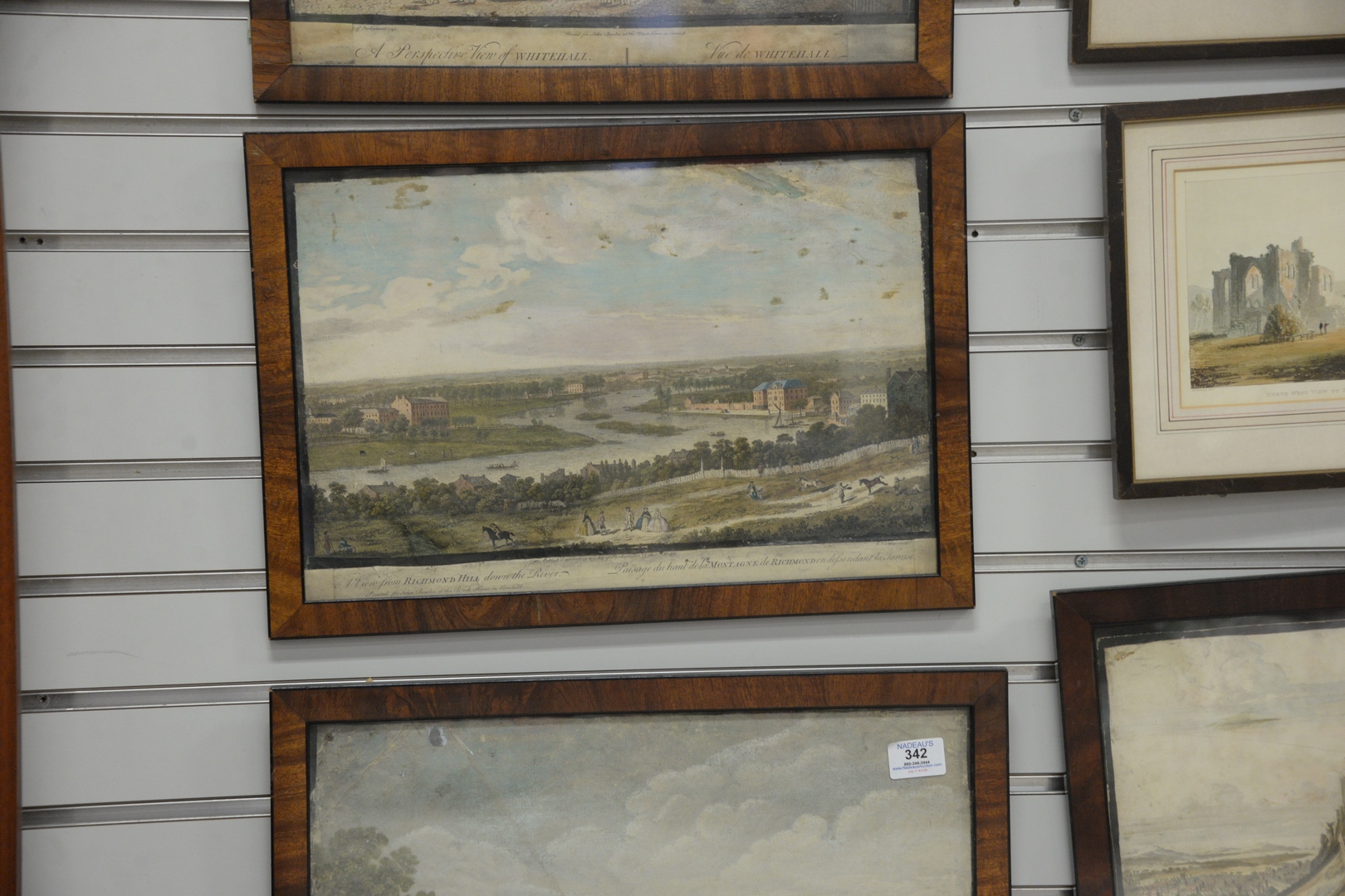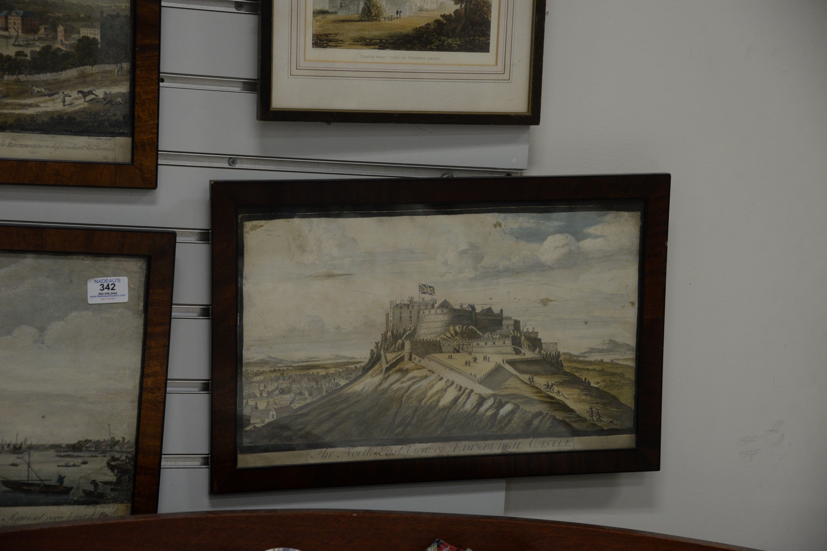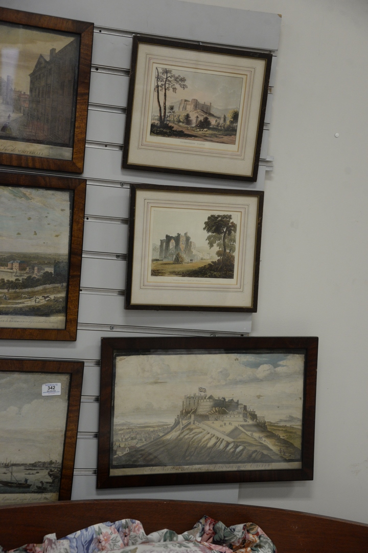 Lot 342: Six Piece Lot, to include a pair of British engravings by T.H. Fielding showing “Cockermouth Castle” and “Furness Abbey” along with four hand colored engravings of England, one by E. Vivares, each with printed titles along the lower margins, sight size 11″ x 17.5″.