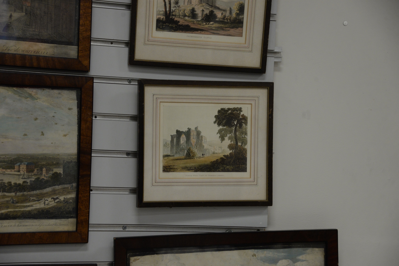Six Piece Lot, to include a pair of British engravings by T.H. Fielding showing “Cockermouth Castle” and “Furness Abbey” along with four hand colored engravings of England, one by E. Vivares, each with printed titles along the lower margins, sight size 11″ x 17.5″.