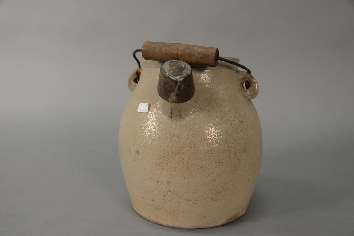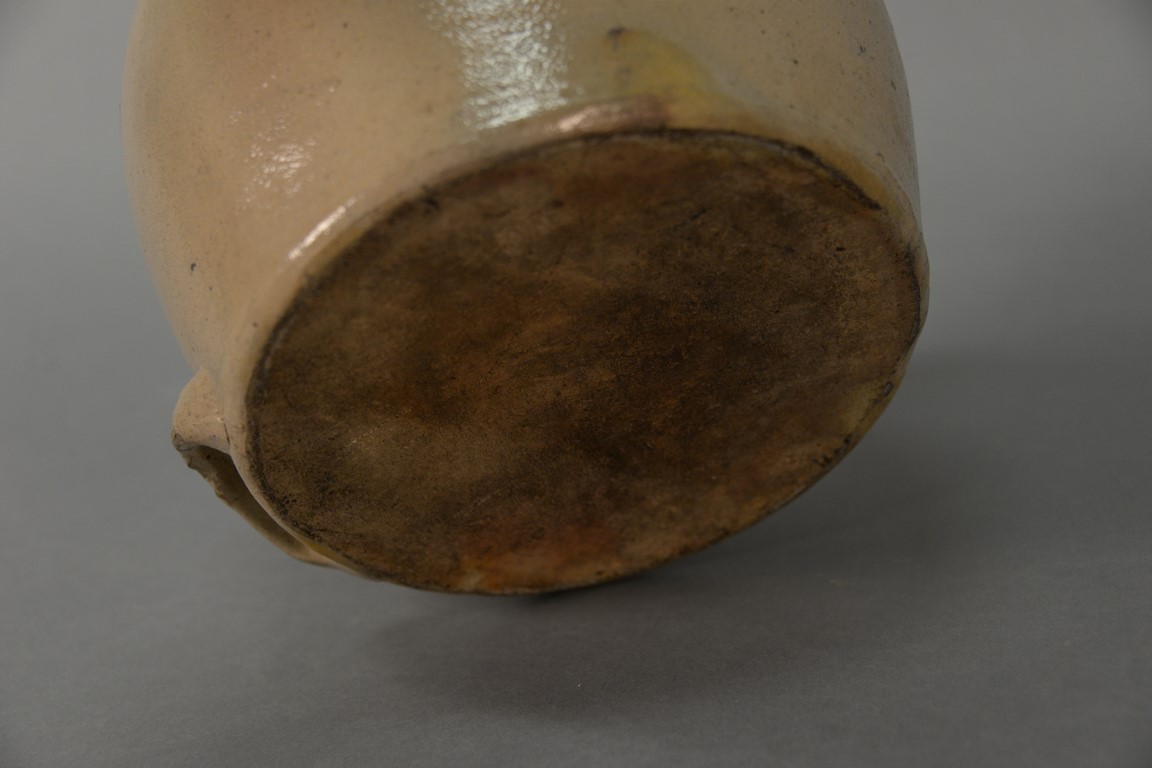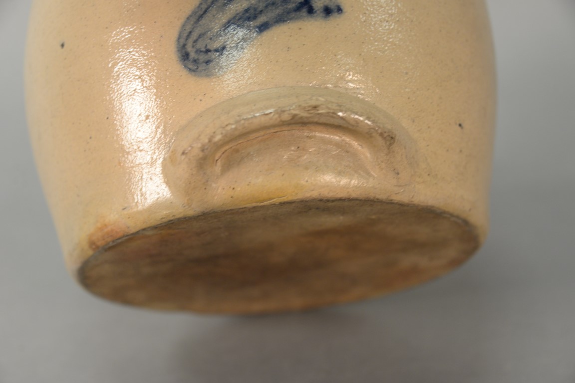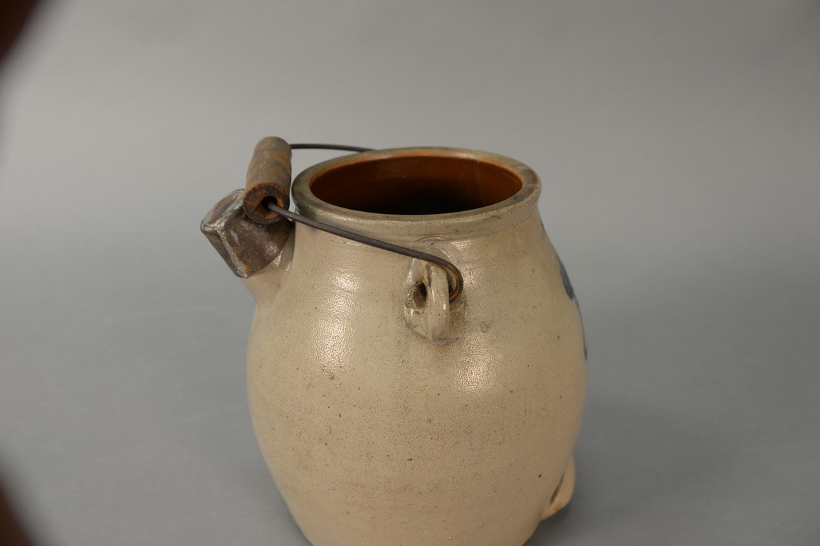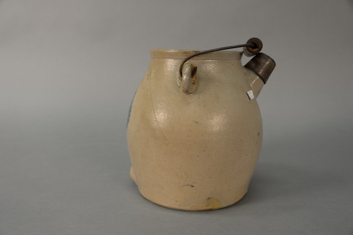 Lot 342: Stoneware cobalt blue decorated batter jug, 6 quart with handle and spout having cobalt blue slip bust portrait of a man, swing hand…