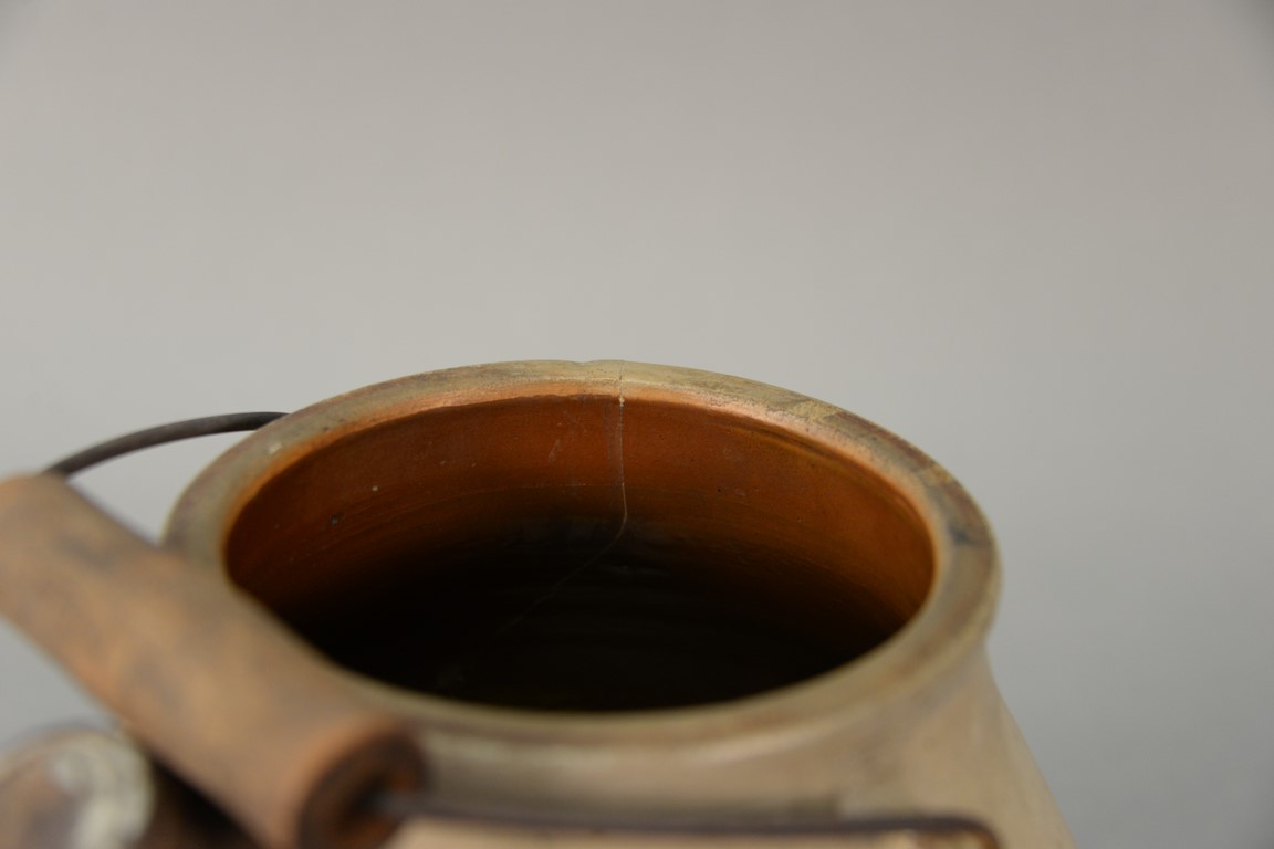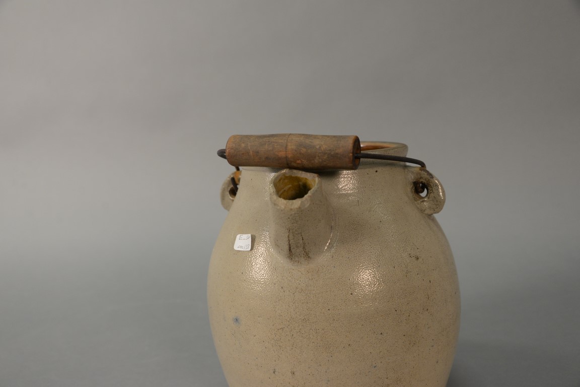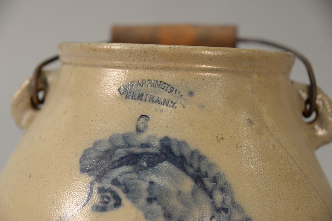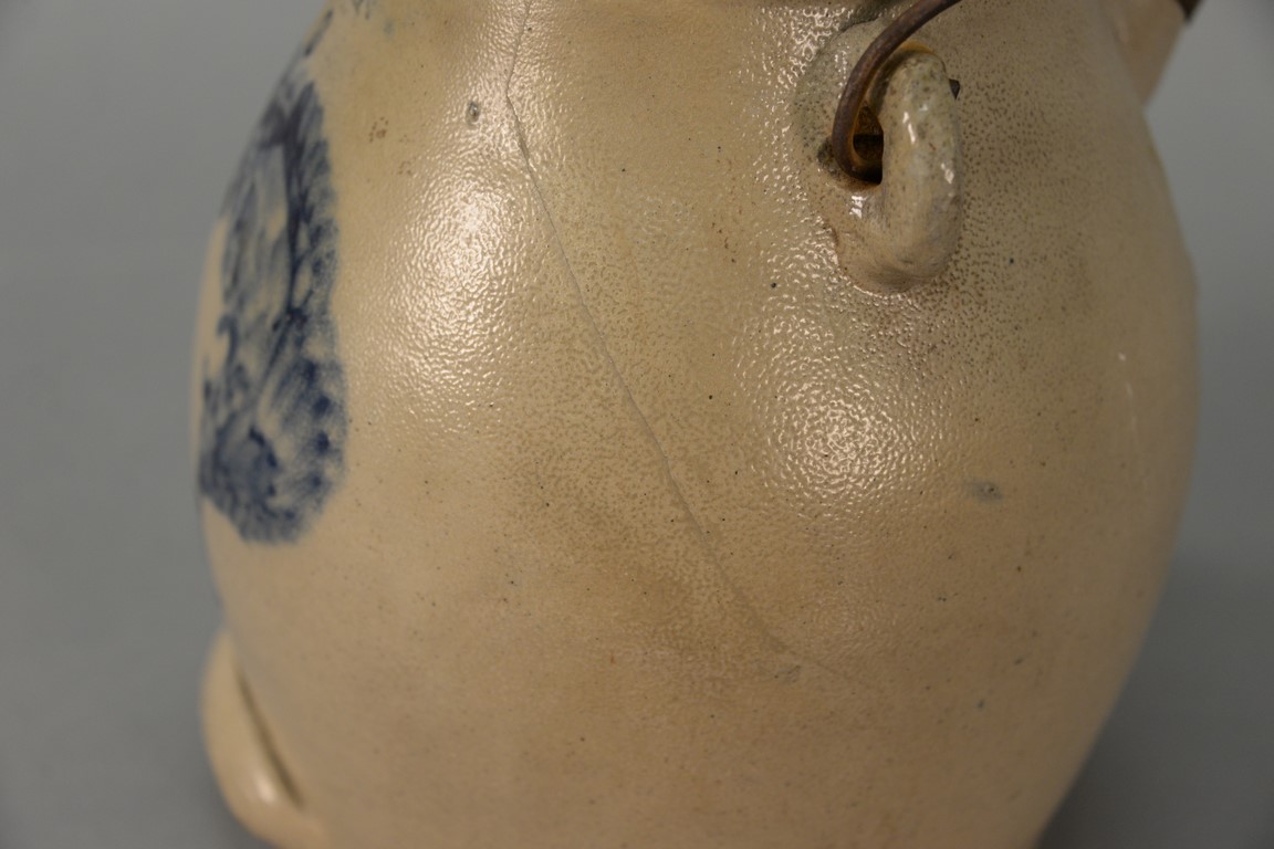 Stoneware cobalt blue decorated batter jug, 6 quart with handle and spout having cobalt blue slip bust portrait of a man, swing handle with wooden grip, stamped E.W. Farrington & Co. Elmira, N.Y. Pictured on the cover of Stoneware Collectors Journal Vol. 5, No. 2. crack and spout chips height 9 1/4 inches, top opening diameter 5 inches Provenance: Estate of Dr. Steve Leder