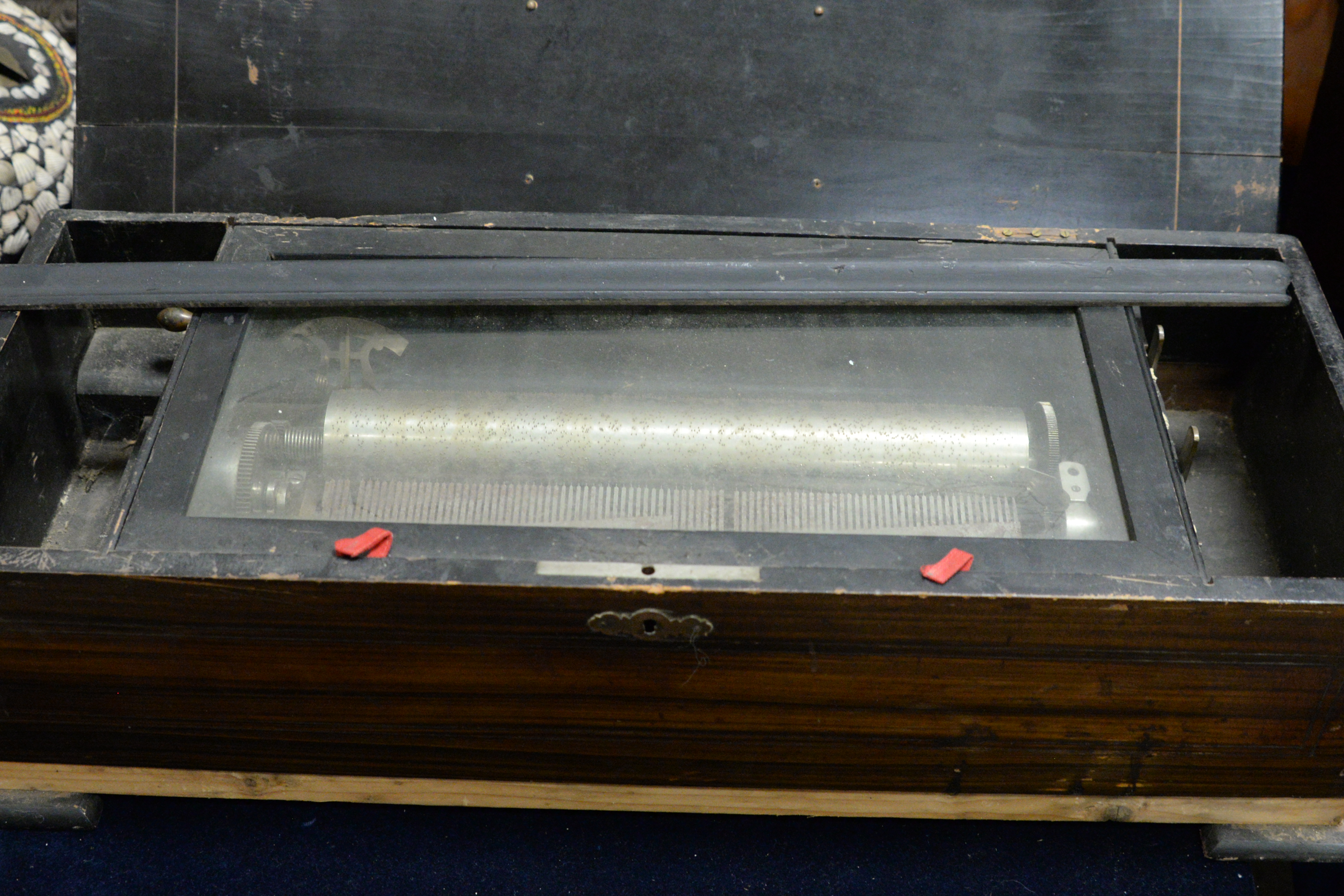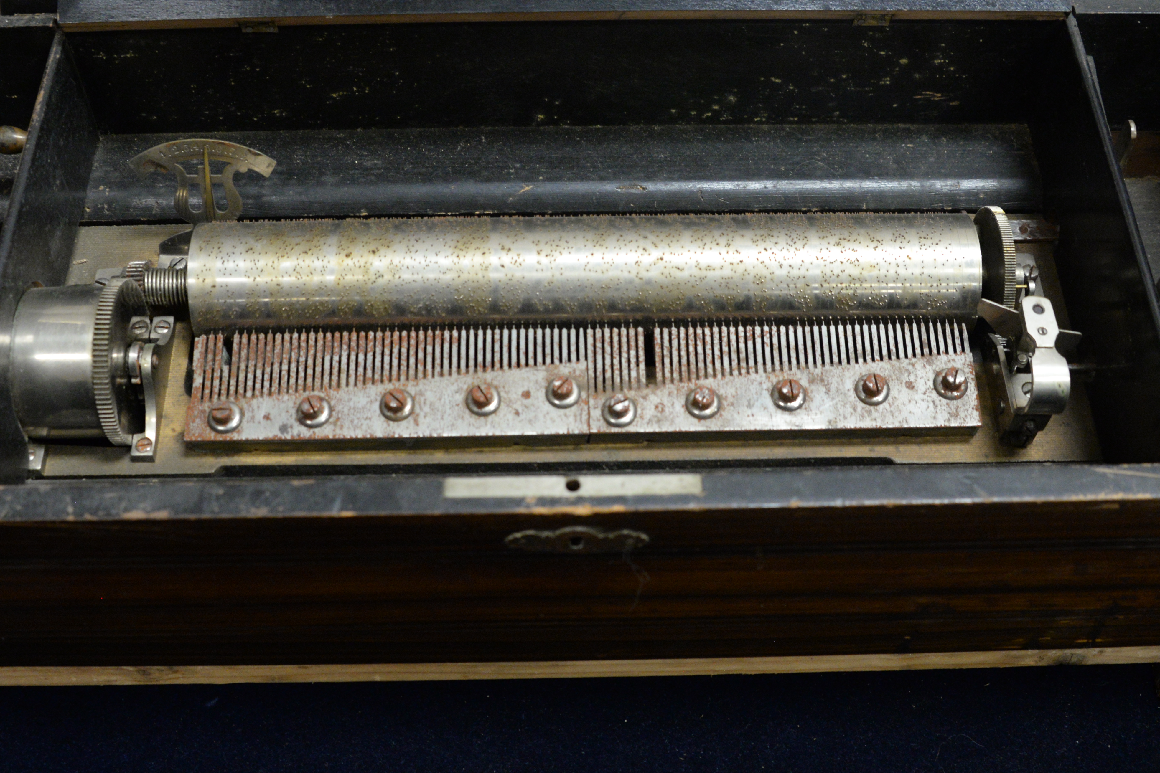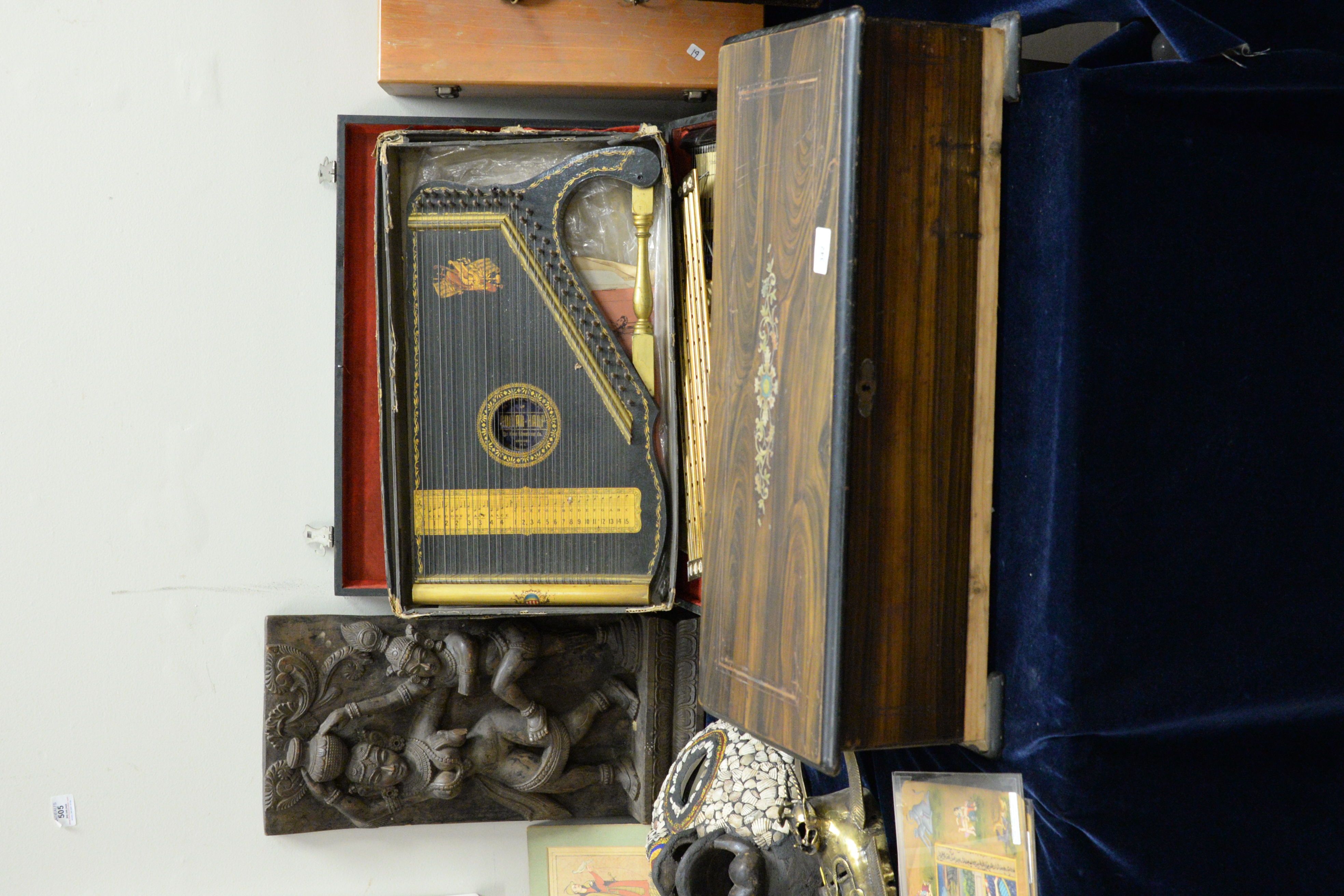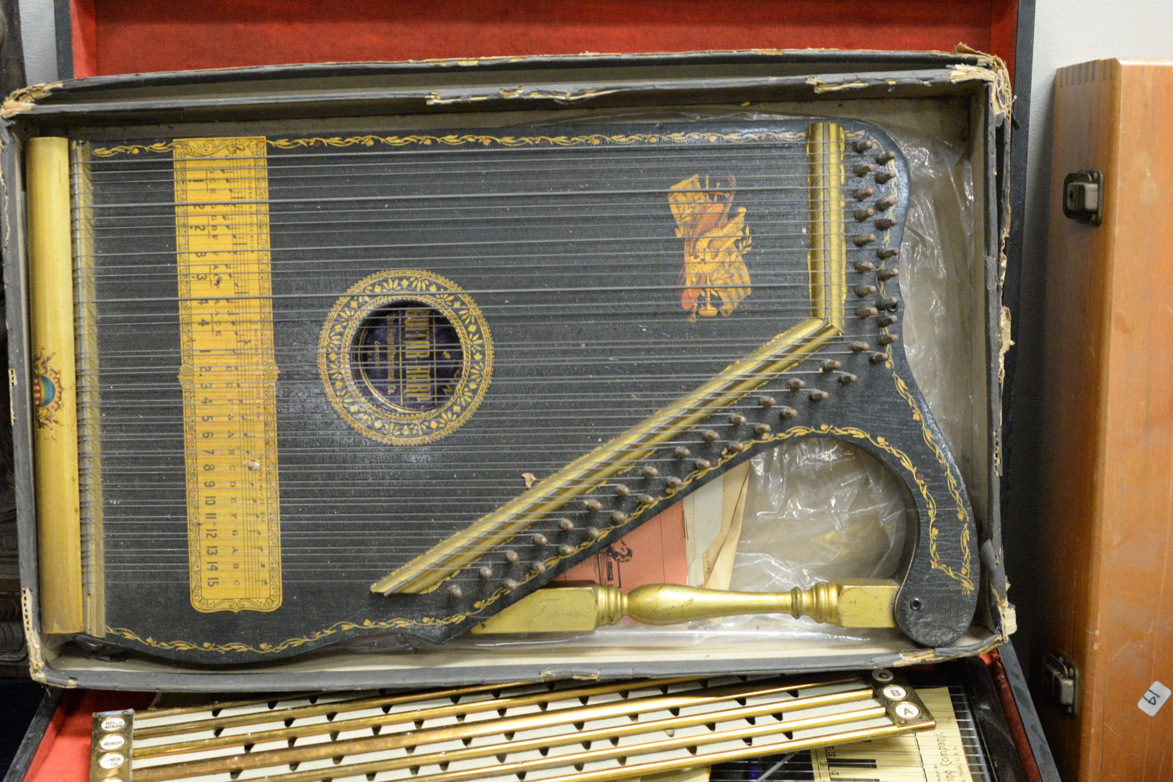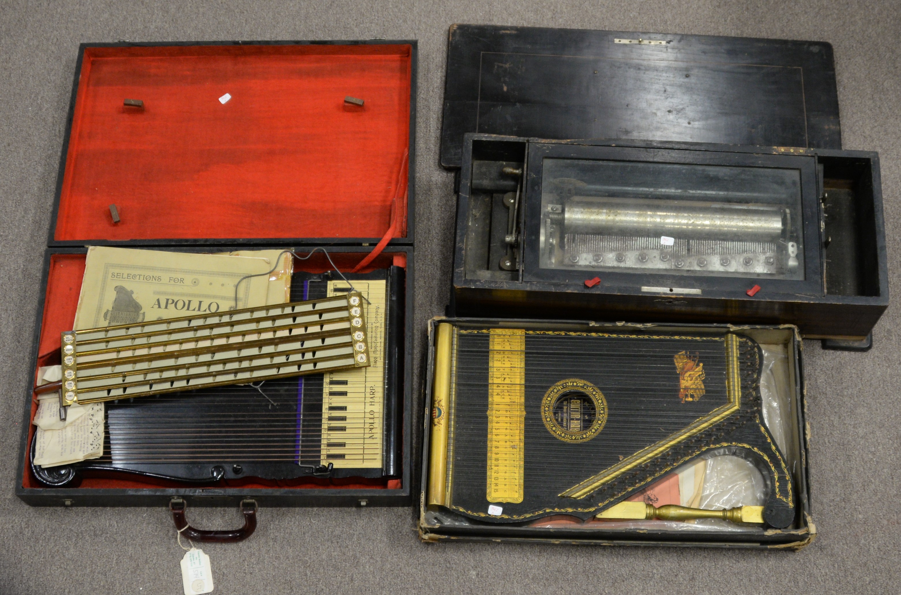 Three Piece Antique Instrument Group, to include, two mandolins, one an “Apollo Harp” circa 1895 the other “Guitar Harp” circa 1912, as well as a cylinder music box, height 6 inches, length 25 inches