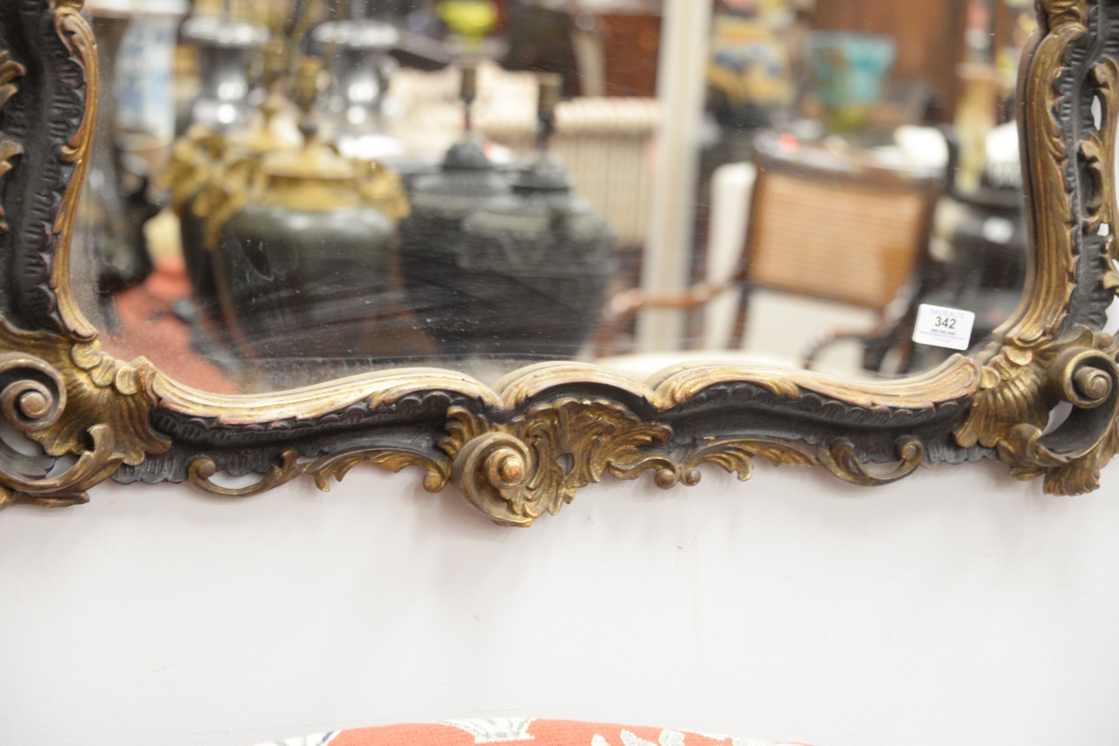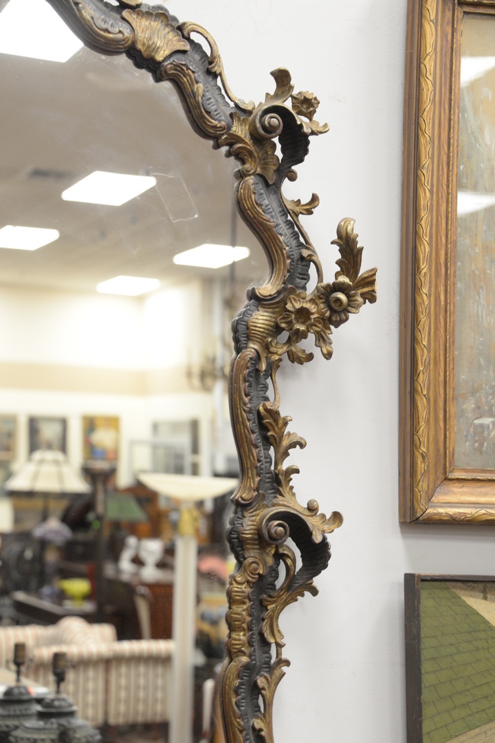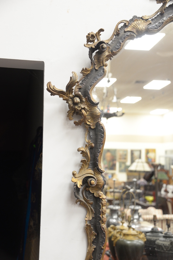 Lot 342: Venetian Black and Gilt Mirror, having three dimensional carving, 19th century, height 50 inches, width 36 inches.