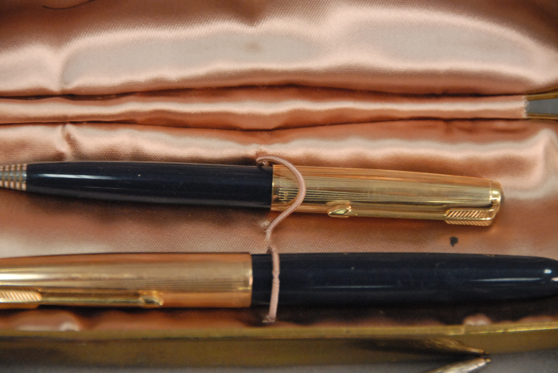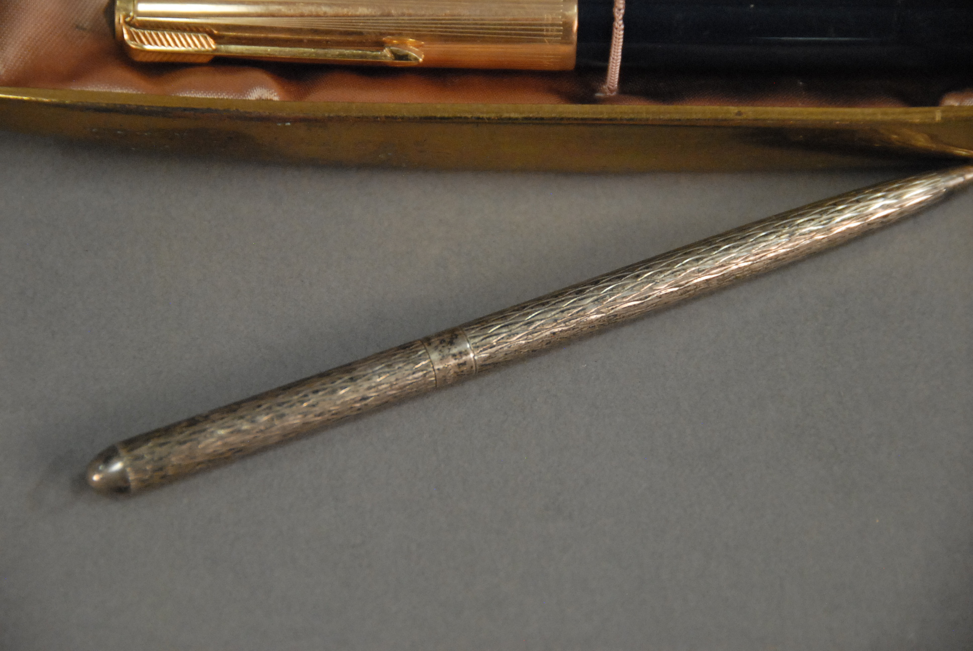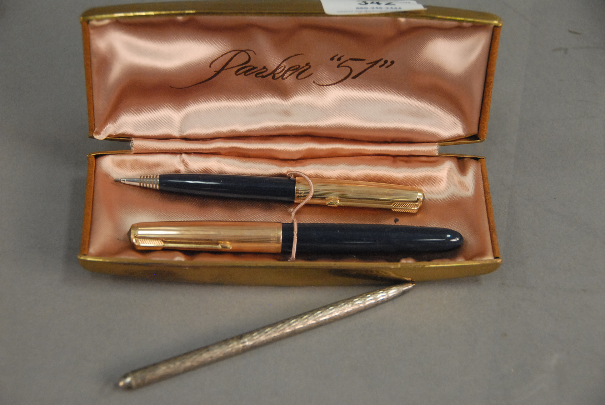 Lot 342: Vintage Parker 51 gold filled pen and pencil set in original box along with a Tiffany sterling diamond cut pen.
