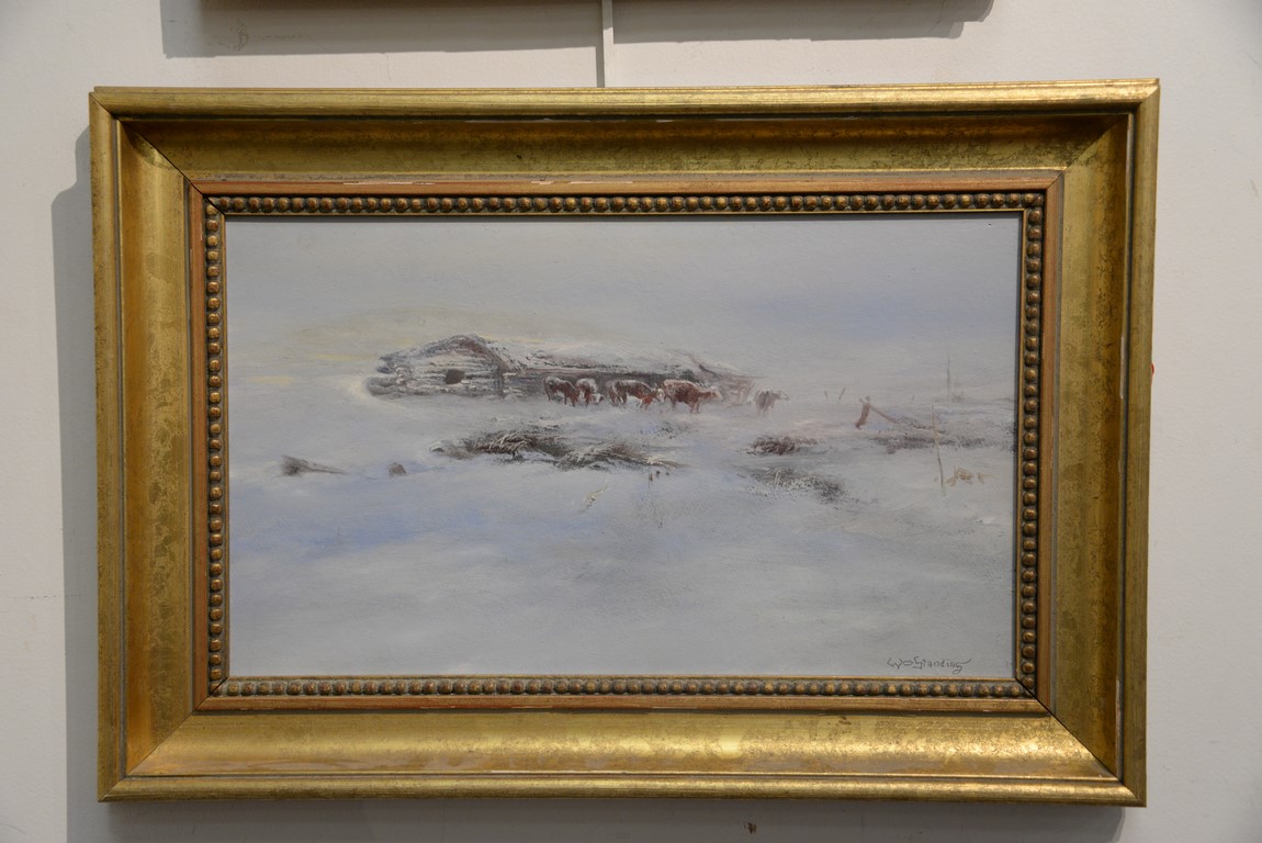 Lot 342: WILLIAM STANDING 1904-1951 In Need of a Line Rider oil on board signed lower right Wm Standing Gallery letter and postcard on reverse 12 x 20 Provenance: GAllery 85 Billings, MT 1968