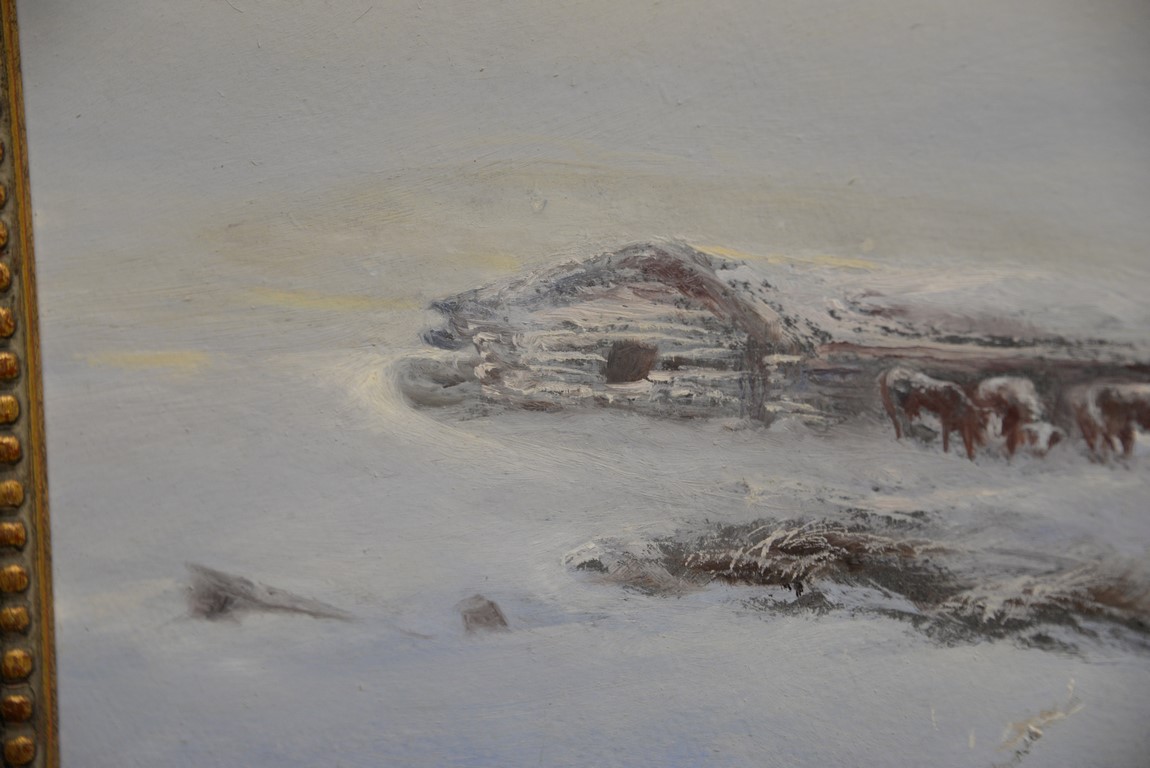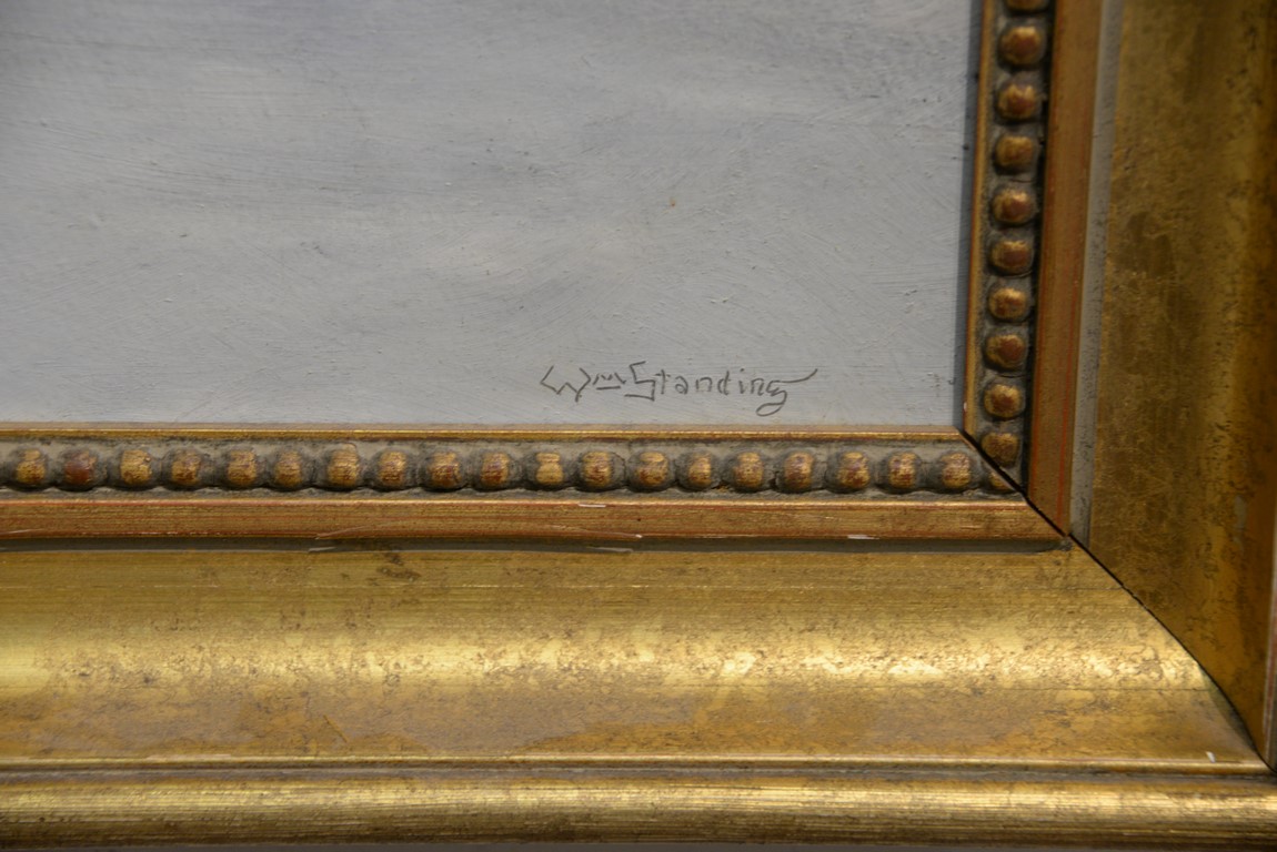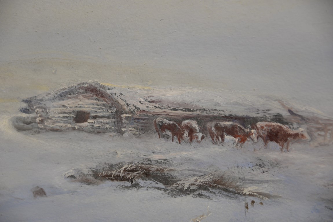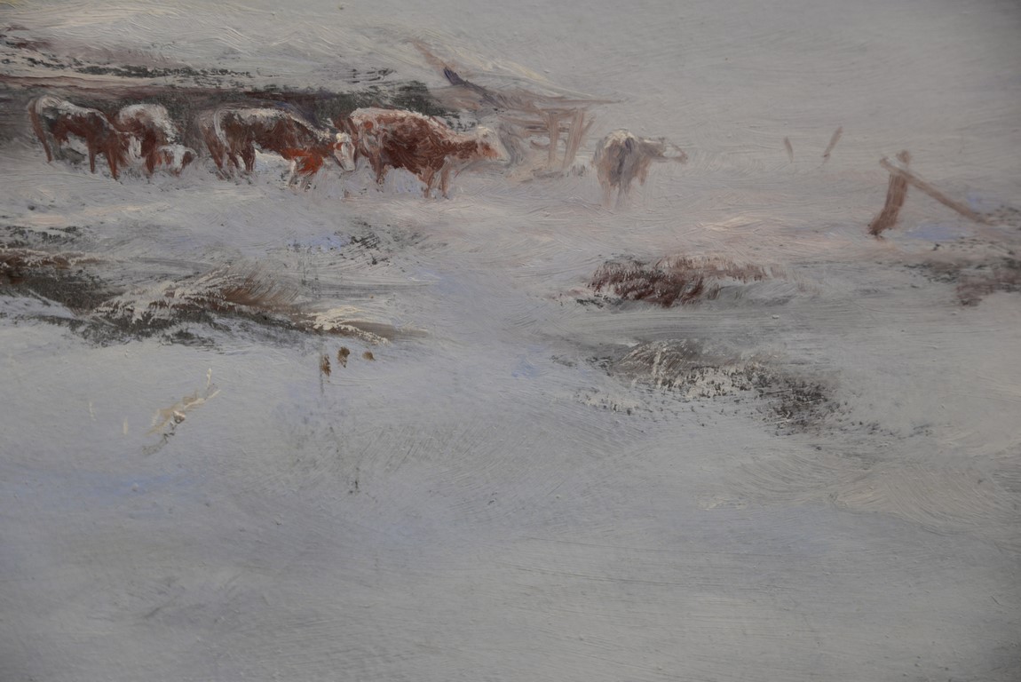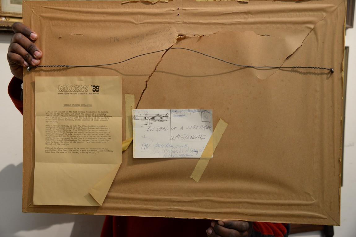 WILLIAM STANDING 1904-1951 In Need of a Line Rider oil on board signed lower right Wm Standing Gallery letter and postcard on reverse 12 x 20 Provenance: GAllery 85 Billings, MT 1968 Current Private Collection Included Documentation: Gallery 85′ letter and postcard stating that the previous owner bought this painting the summer of 1968 at Gallery 85, Billings, Montana