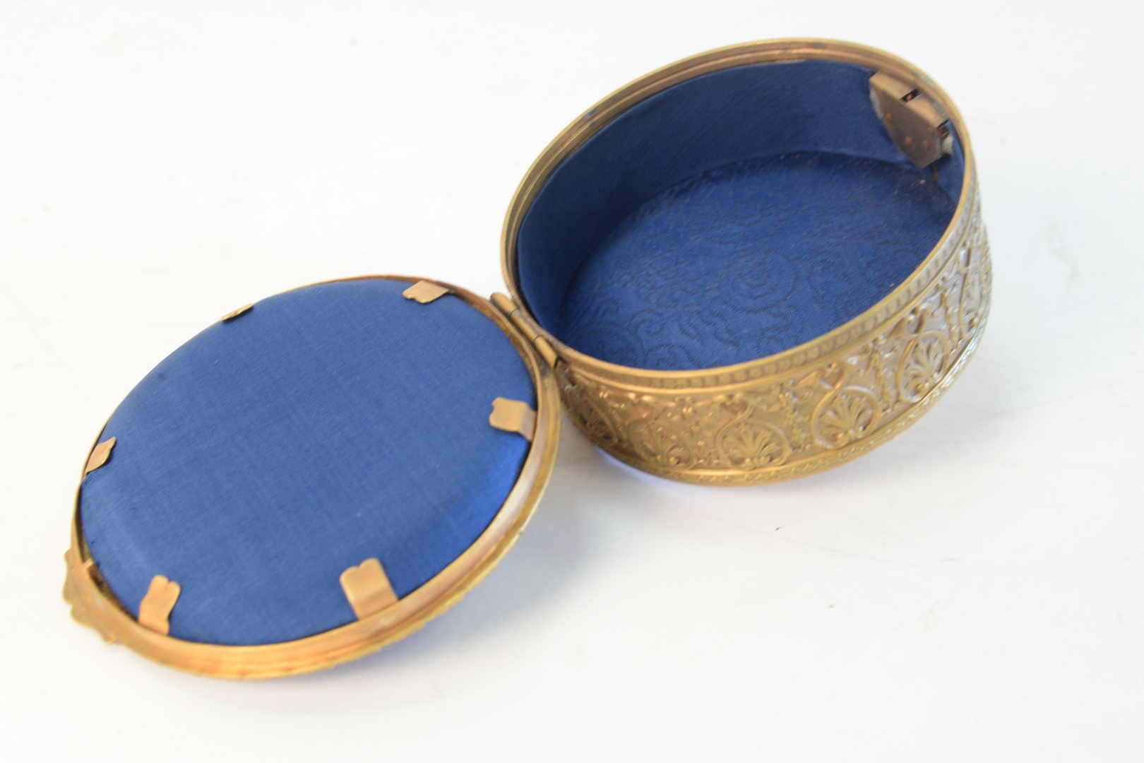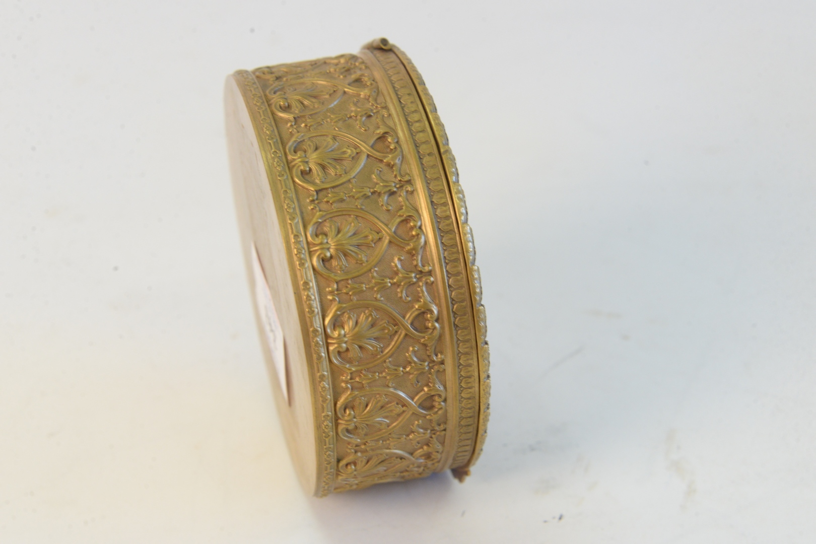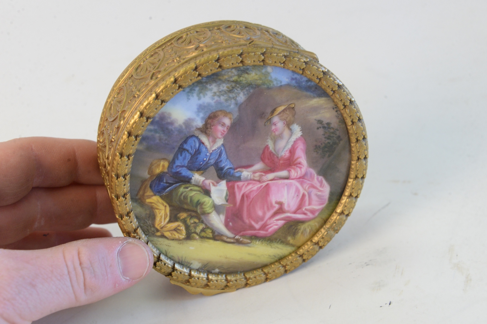 Brass Jewel Box, with painted porcelain top, height 1 5/8 inches, diameter 4 1/4 inches.