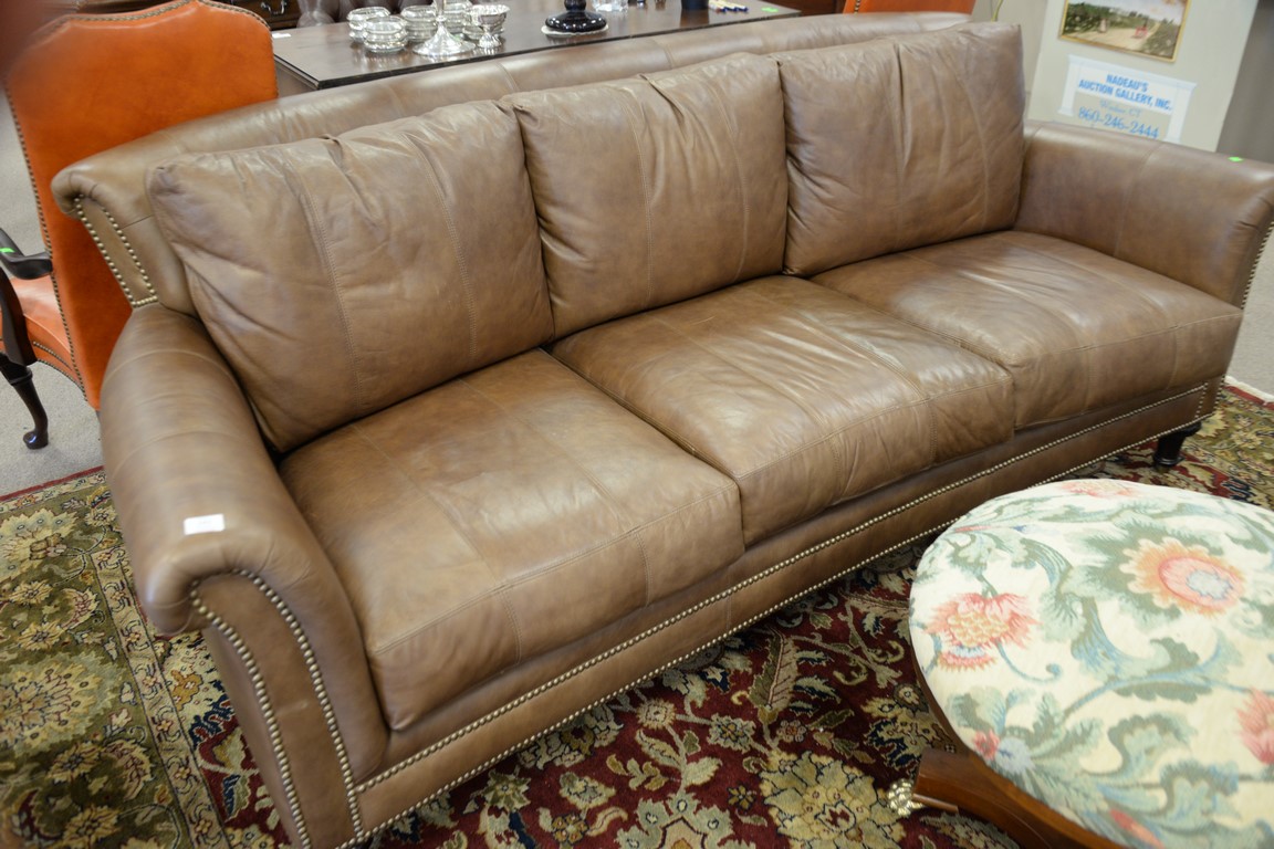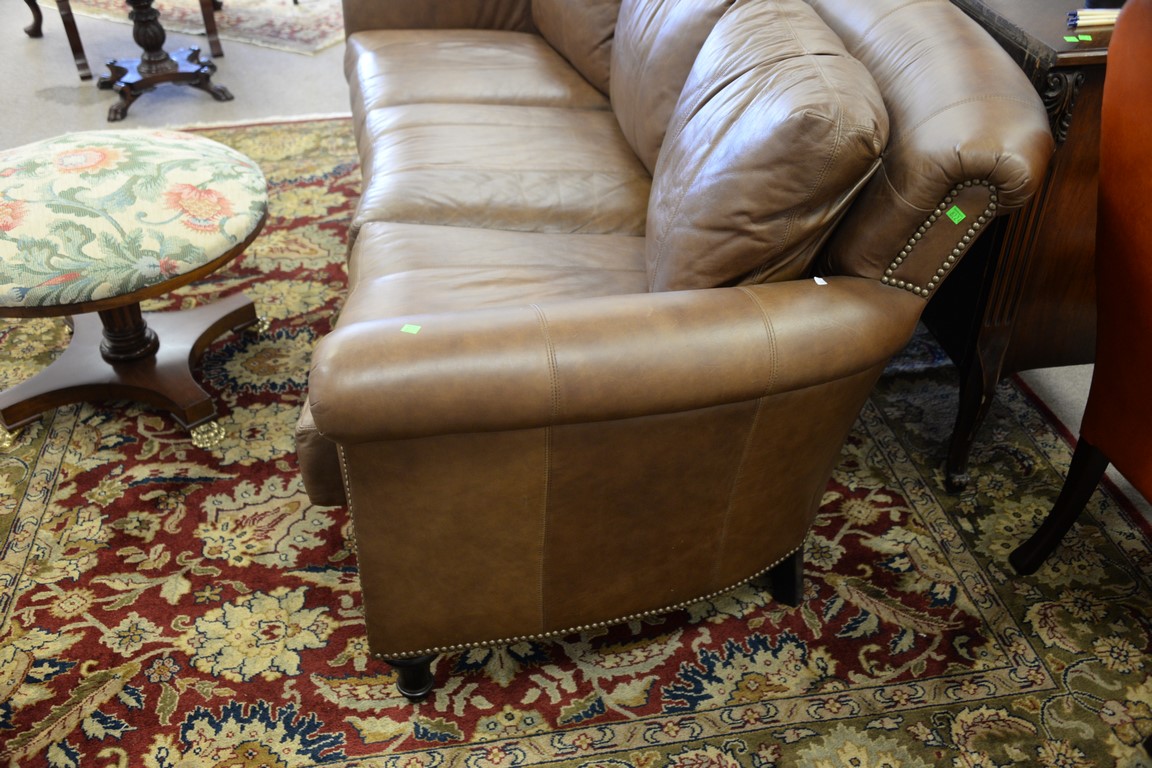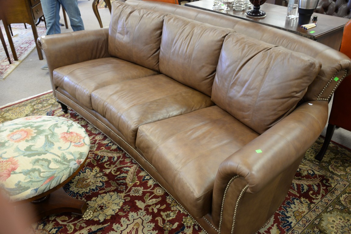 Brown leather upholstered sofa marked Ferguson Copeland Ltd. wd. 88in.