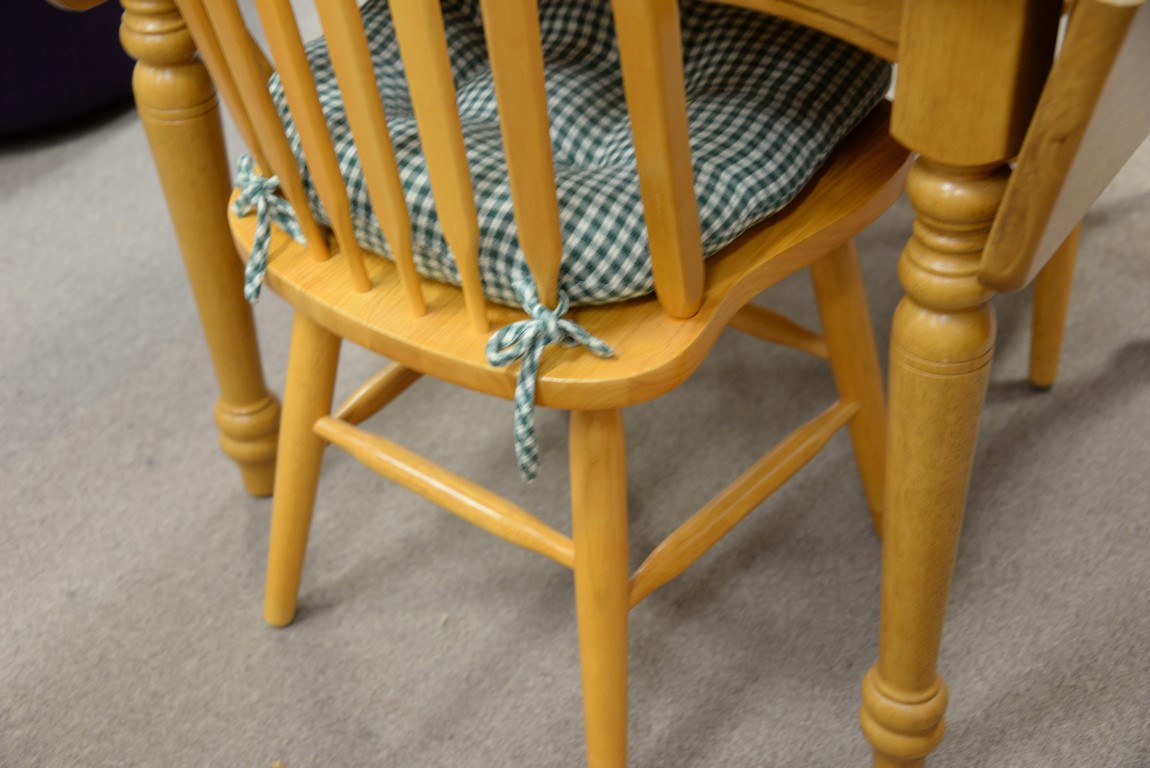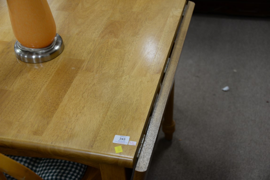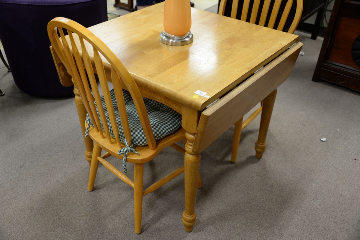 Lot 343: Butcher block style drop leaf table and two chairs. top: 32 x 32 opens to 48