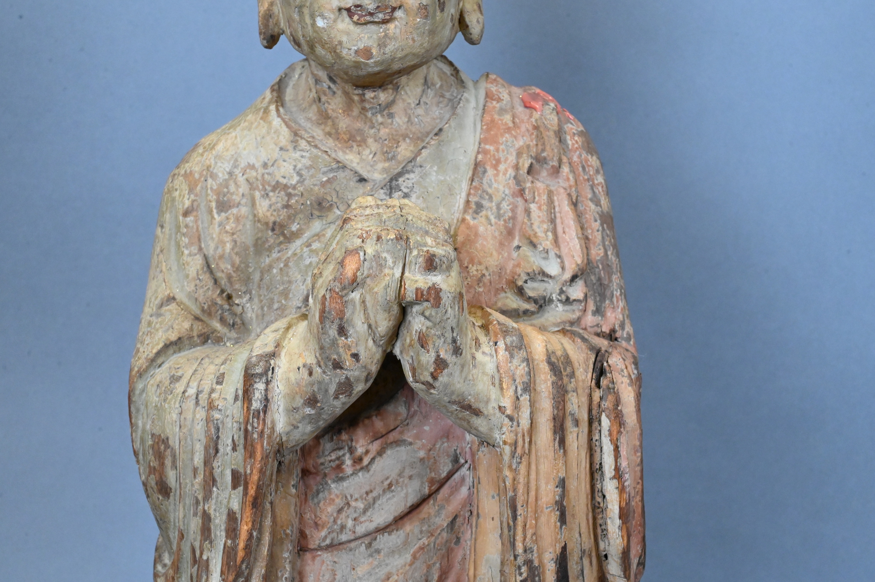 A carved wooden standing figure of a Buddhist monk, hands clasped in front, wearing layered robes with traces of original polychrome decoration, raised on a lotus base.