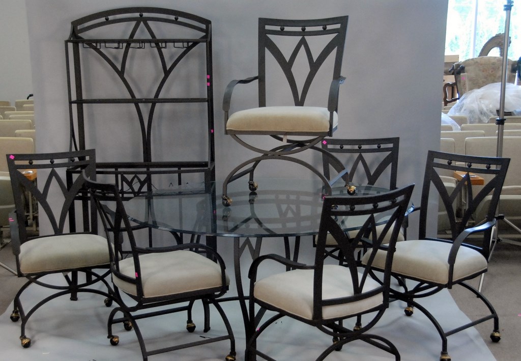 Contemporary glass top table, etegere, and six armchairs, dia. 60in.