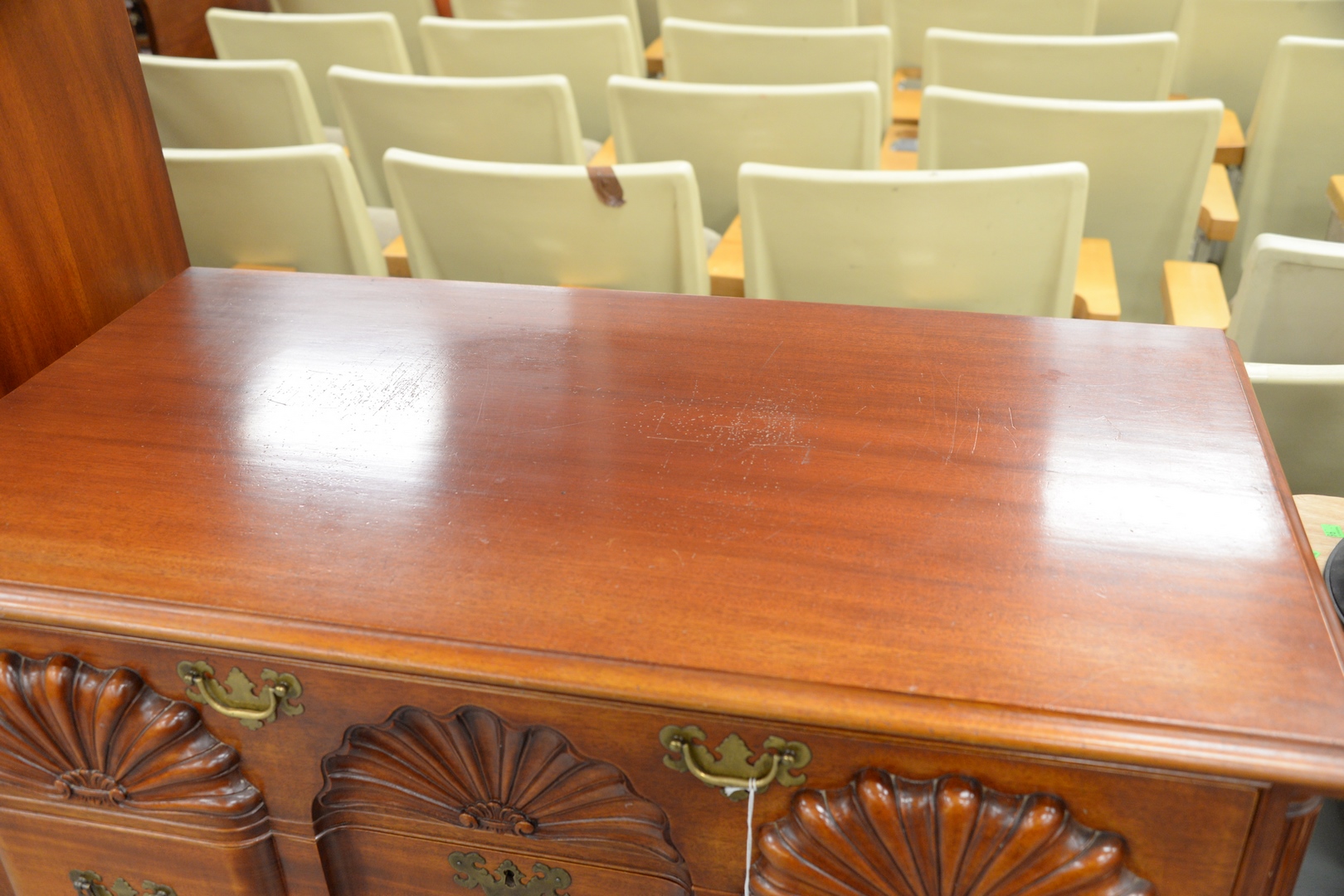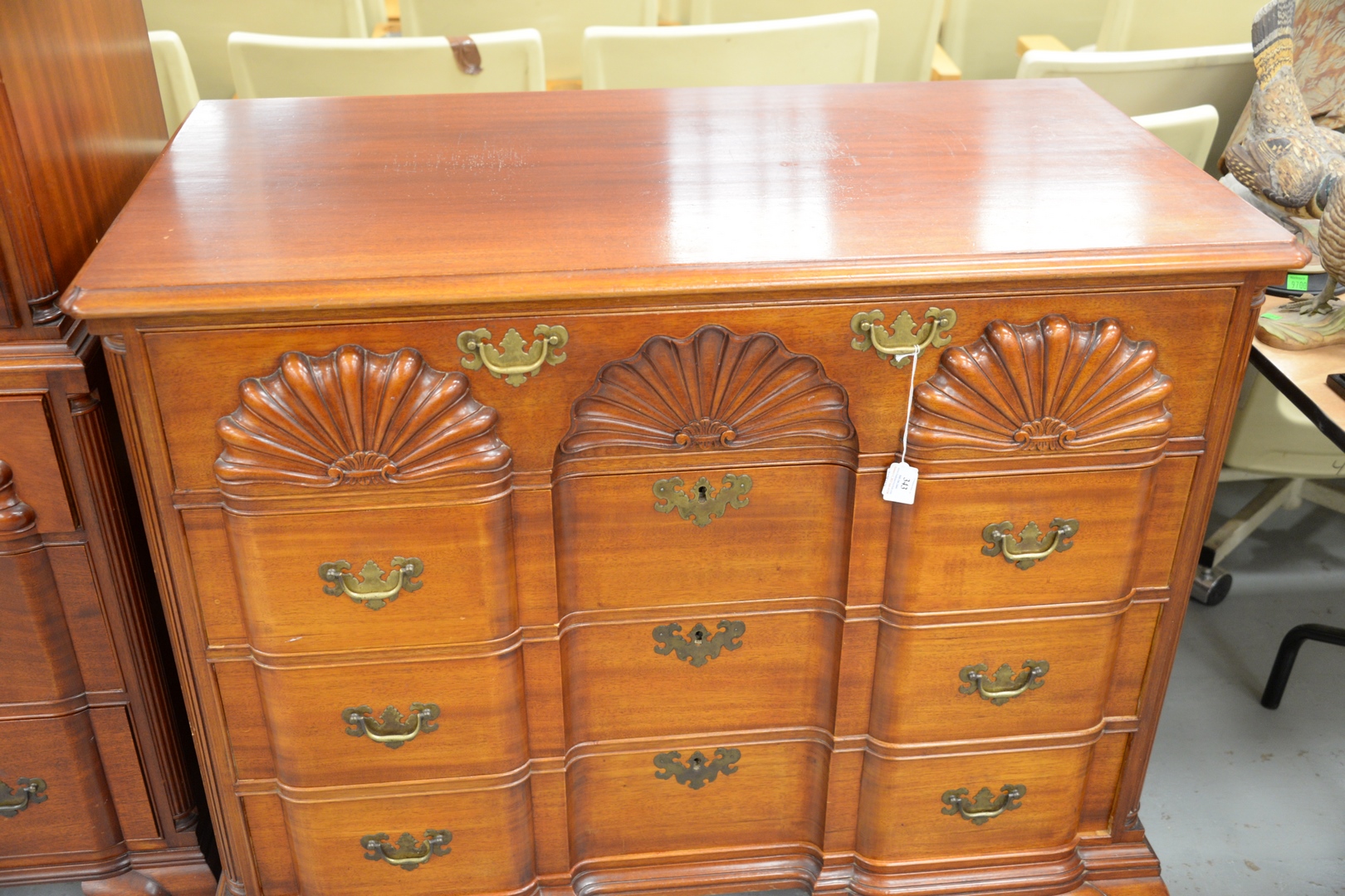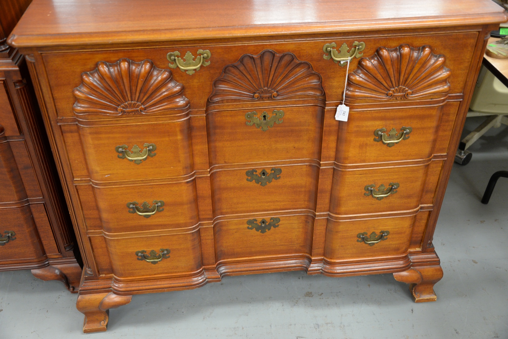 having triple shell carved block front flanked by quarter columns set on ogee feet