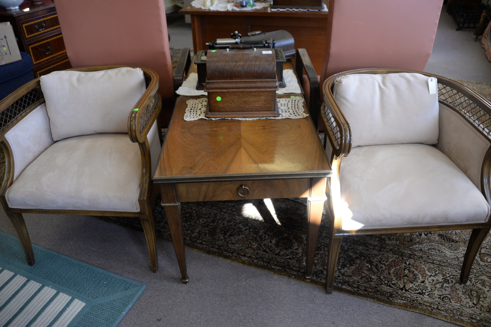 Lot 343: Four piece lot including a pair of Baker end tables and pair of microfiber upholstered armchairs. tables: ht. 23in., top: 24 x 27
