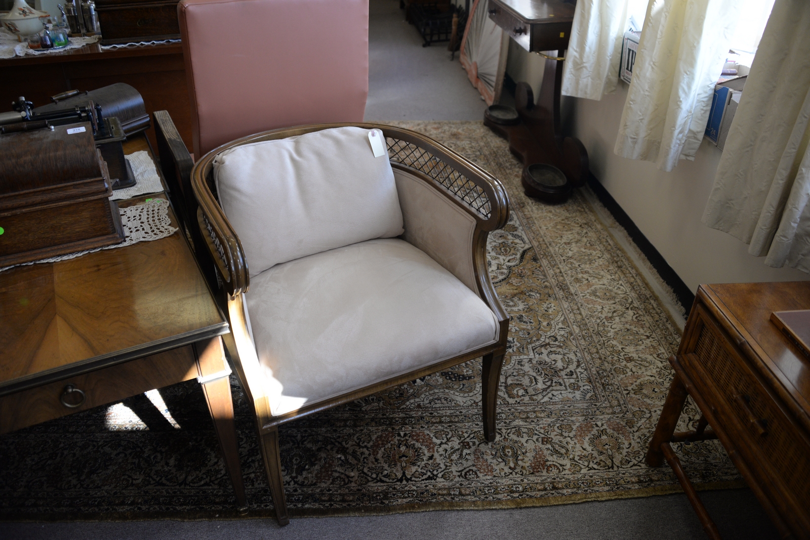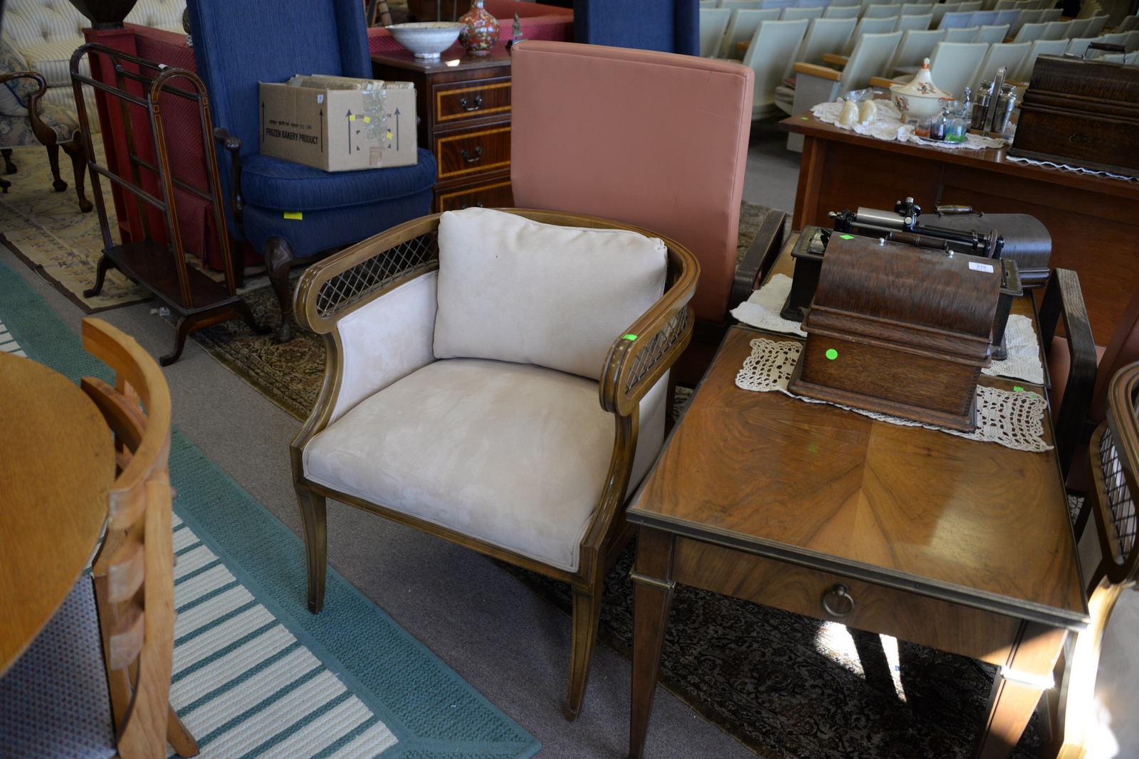 Four piece lot including a pair of Baker end tables and pair of microfiber upholstered armchairs. tables: ht. 23in., top: 24 x 27