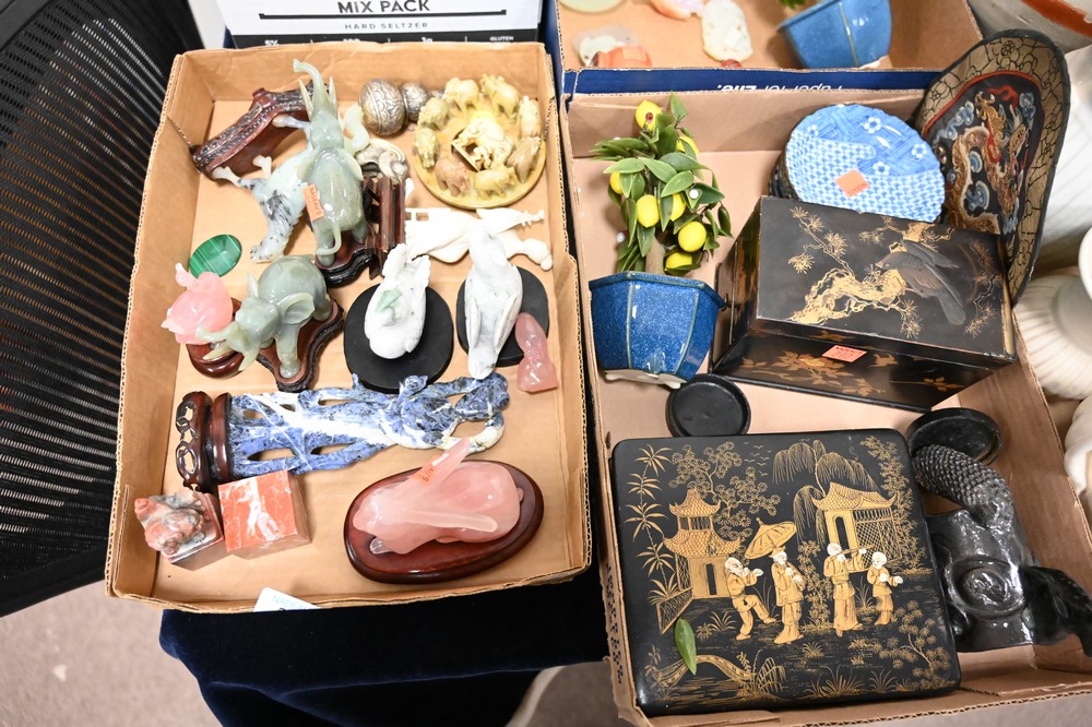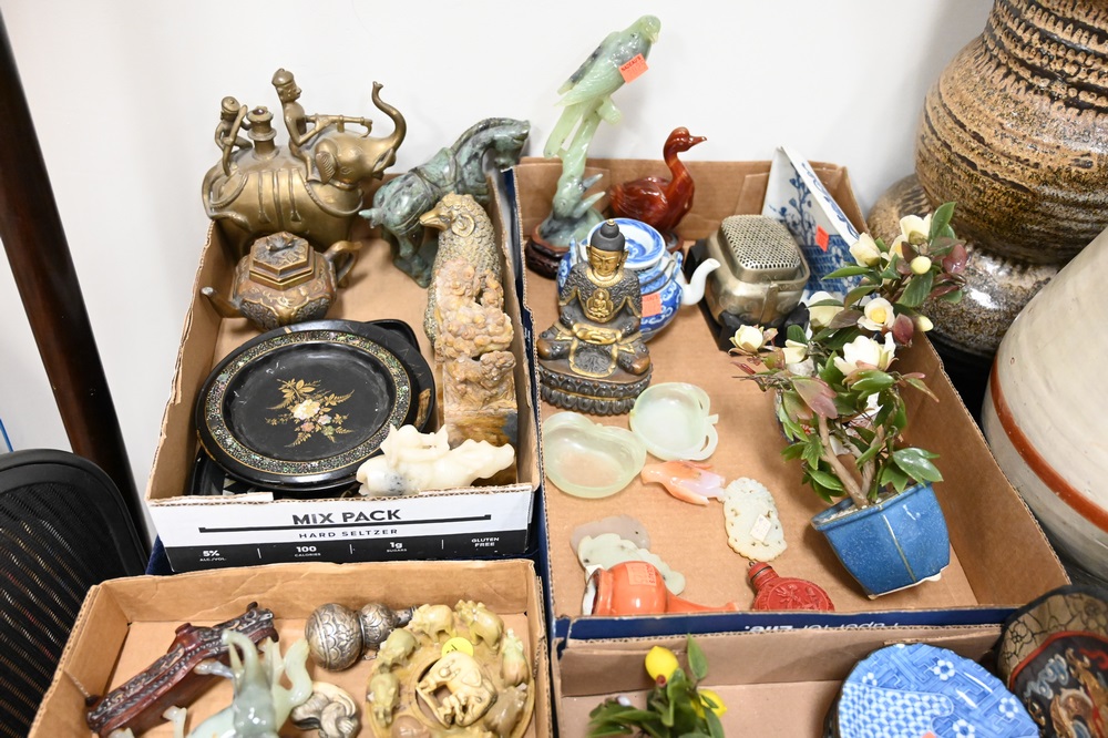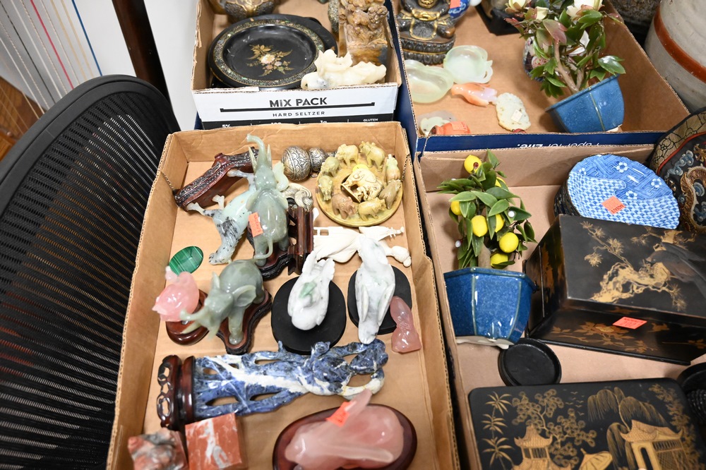 Lot 343: Four Tray Lots of Small Chinese Items, to include several hardstone animals, a pair of foo lion bookends, a brass ram, a brass and bronze Buddha, a set of small blue and white plates, a painted porcelain cow. Provenance: Waterfront Estate, Stamford, CT.
