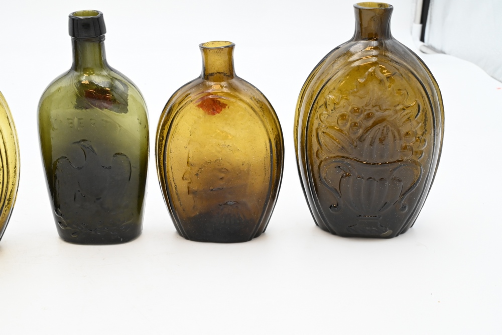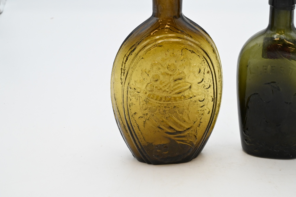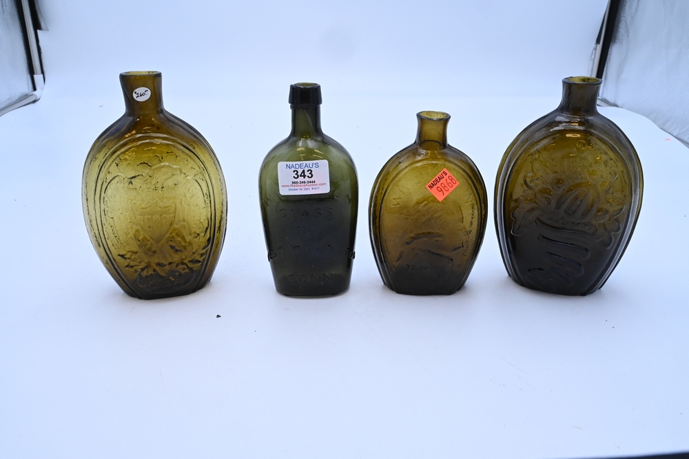 Lot 343: Four Various Flasks to include one having Jackson and George Washington, one WIllington Glass Company along with one cornucopia, etc. tallest 7 inches Provenance: Estate of Bruce Sasalla, East Hartford, Connecticut