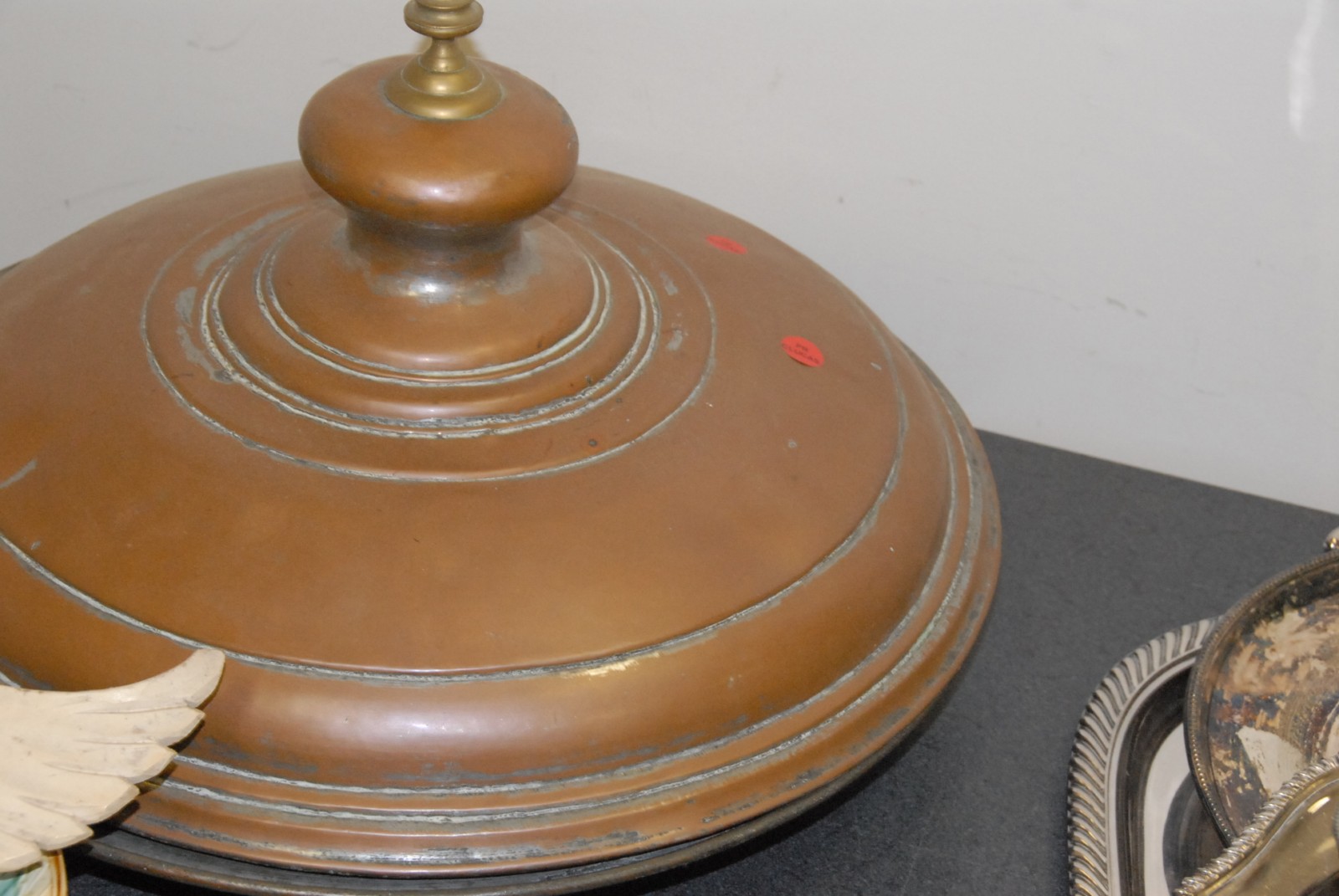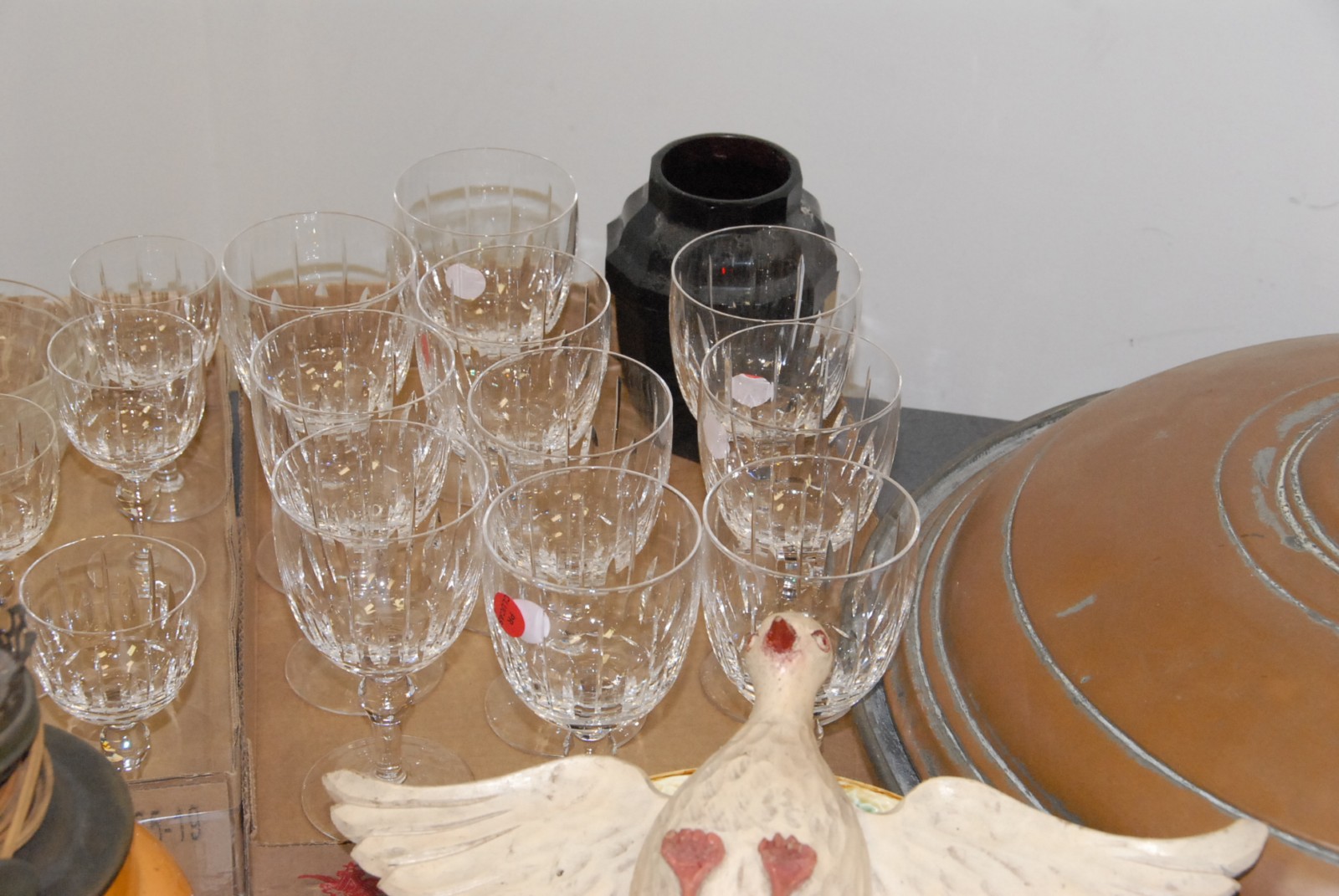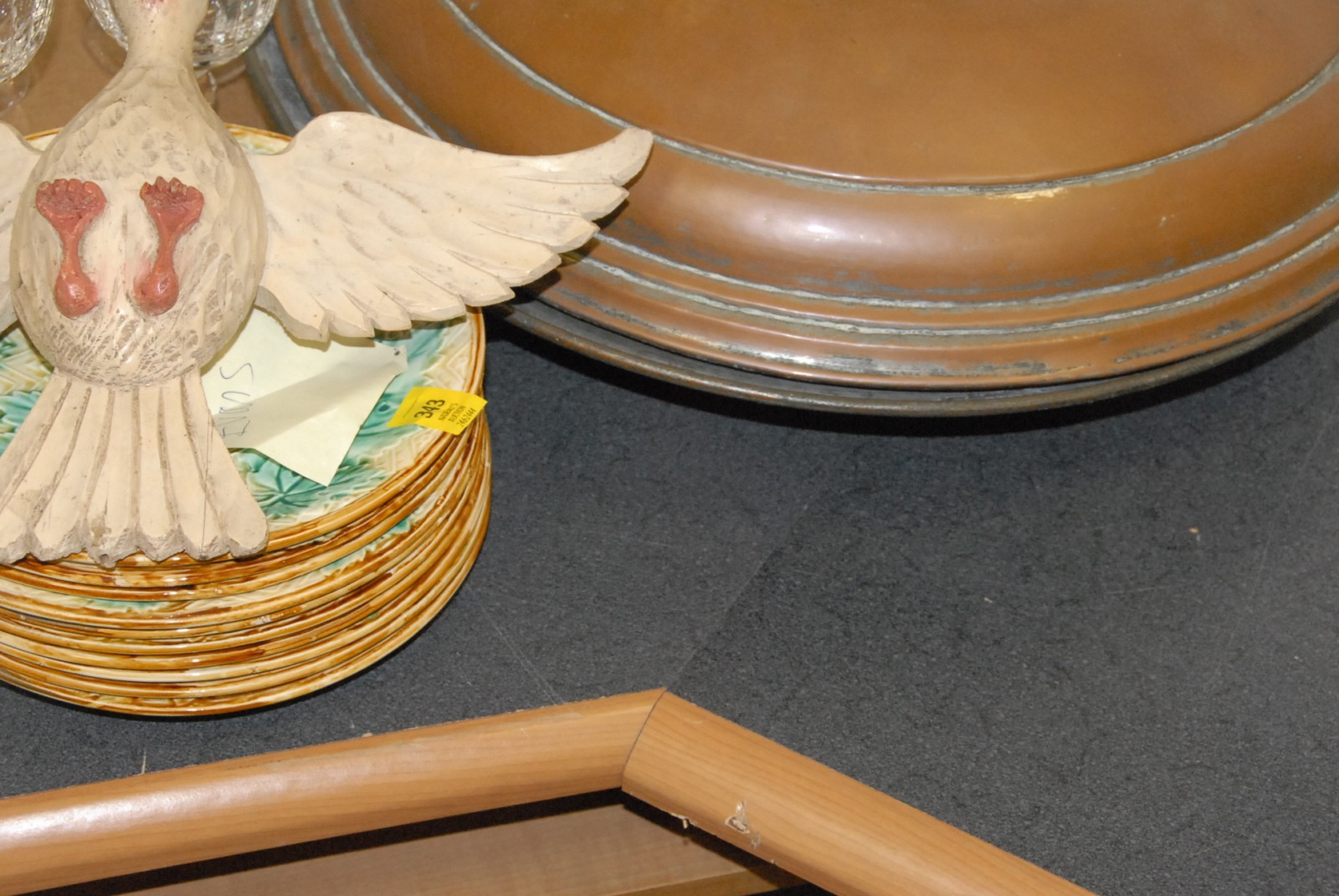 Group lot, including a group of 10 Majolica plates, crystal stems, amethyst vase, covered copper piece, a lamp, 2 wood carving, one a bird, and one a three dimensional plaque with a man