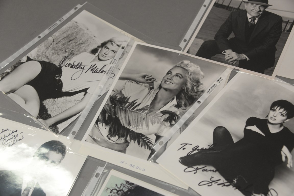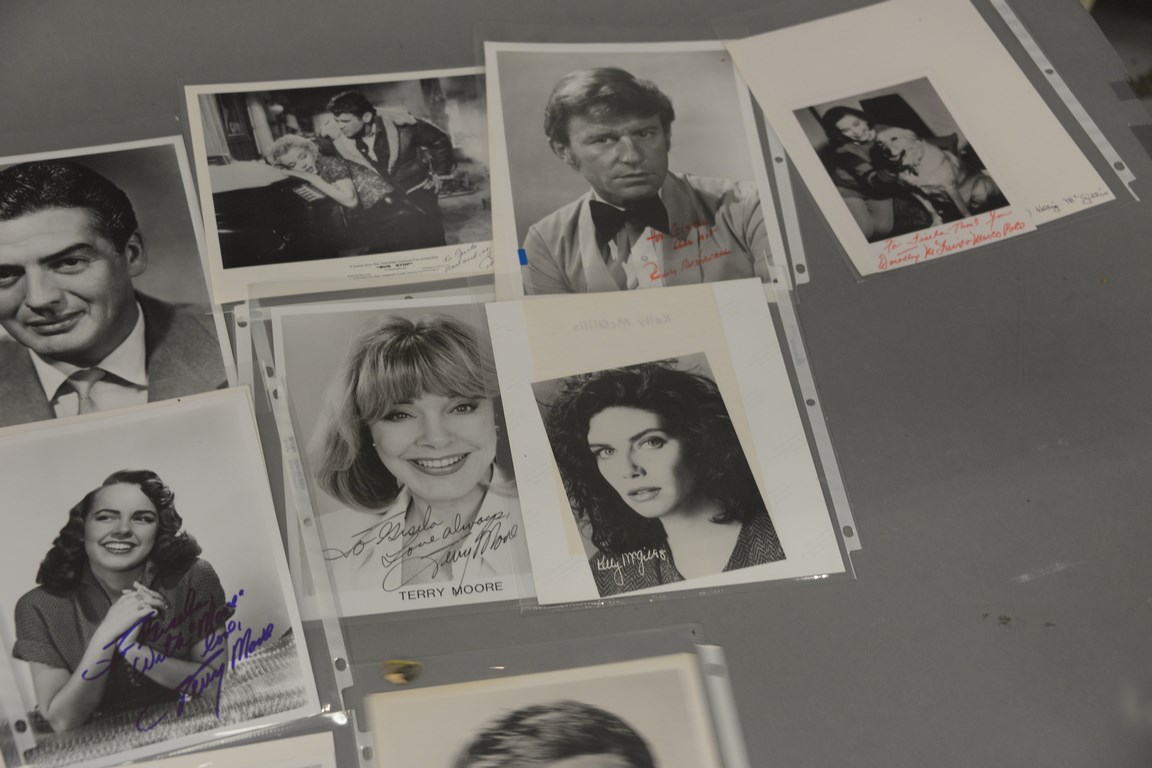 Group of 34 photographs, 29 are autographed including 1 donna Mills, 2 Mary Tyler Moore, 1 Kelly McGillis, 2 Dorothy McGuire, 2 Roddy MacDowall, 1 Ali Macgraw, 3 Shirley Maclaine, 1 Andie Macdowell, 3 Ricardo Montalban, 1 Dorothy Malone, 1 Liza Minnelli, 4 Terry Moore,1 Don Murray, 2 Victor Mature, 1 Karl Malden, 1 George Maharis, 1 Helen Mirren, and 1 illegible and 5 unsigned photographs including 1 Kelly McGillis, 1 Steve McQueen, and 3 Dorothy Malone.