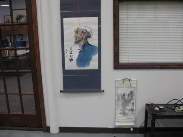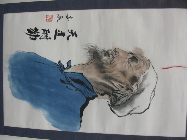 Group of four Oriental scrolls Asian warrior figure, still life of flowers, bust of scholar, and black and white landscape.