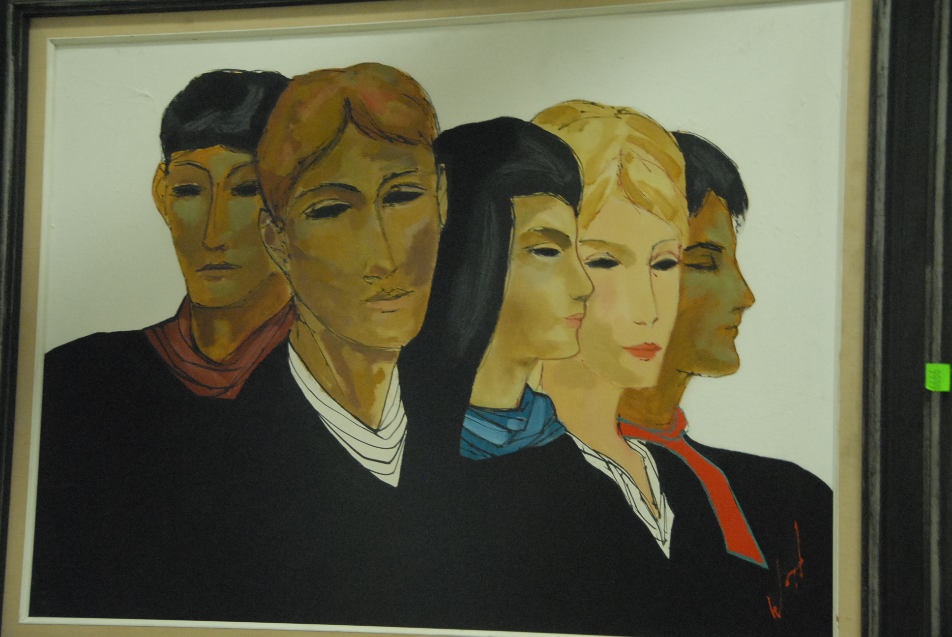 Lot 343: Group of four paintings and prints to include abstract of woman with child, boy with flowers, group of people, etc.