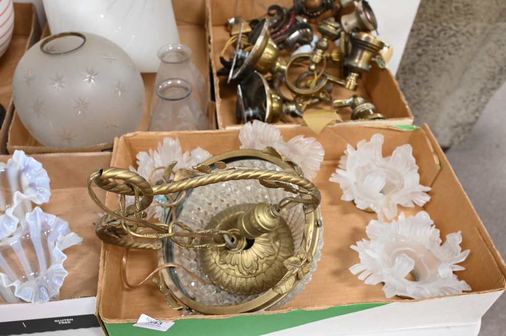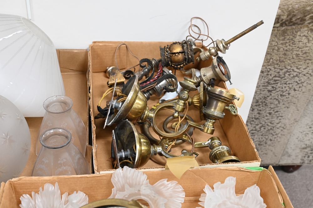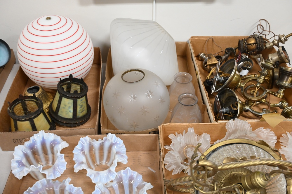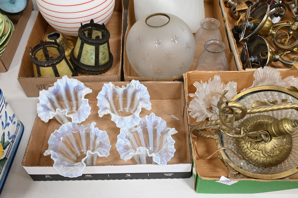 Group of Lighting, to include frosted shades, wall sconces, hanging lights, set of four art glass shades, pair of slag glass shades, gone with the wind lamp shade, etc.