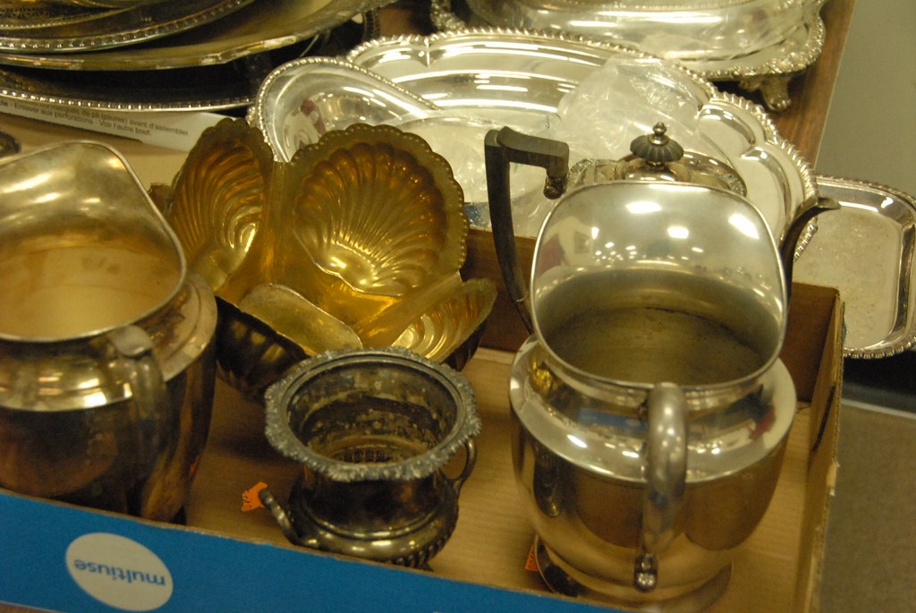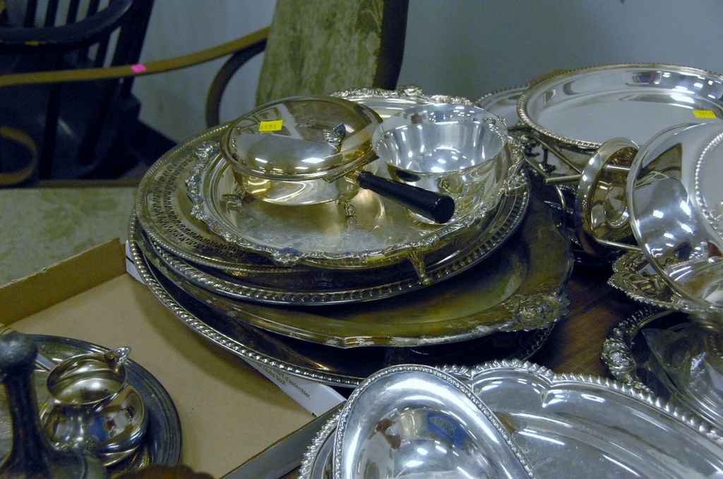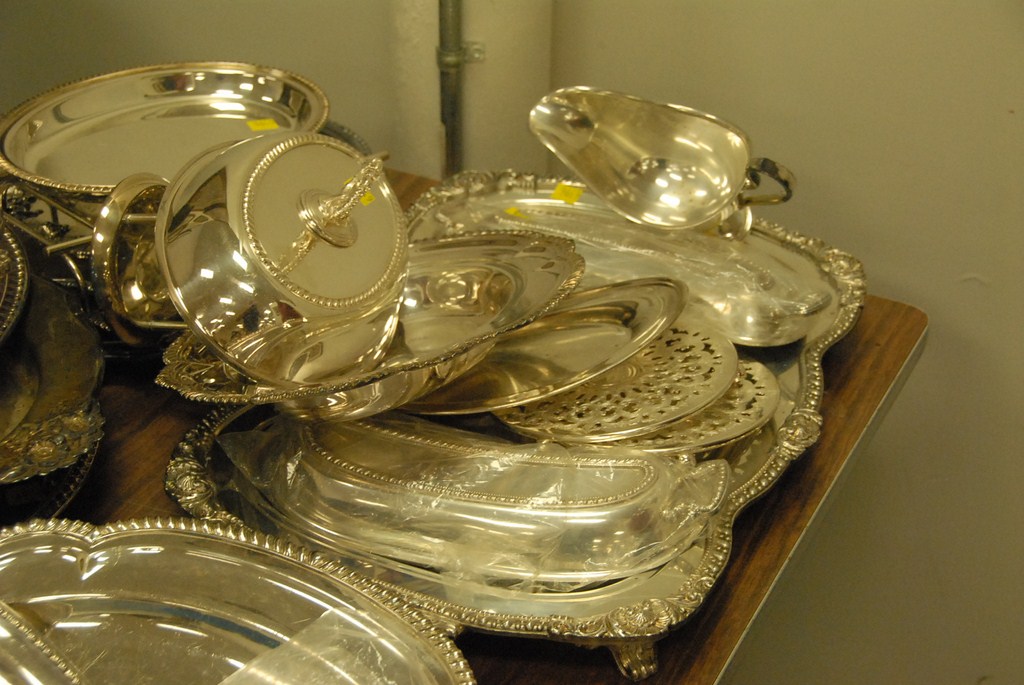 Lot 343: Large group of silverplate two pitchers, tea pot, several trays, covered dish, cologne bottle, etc.