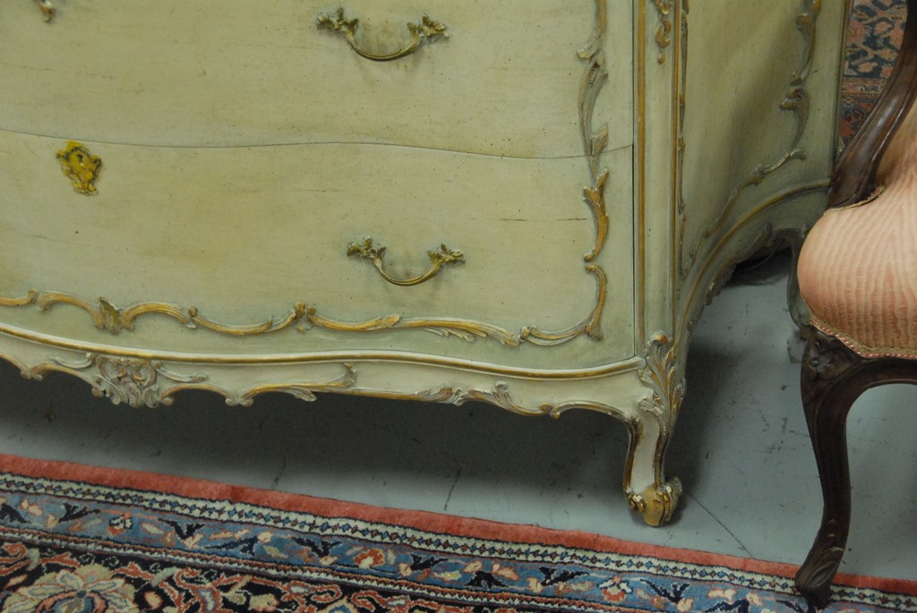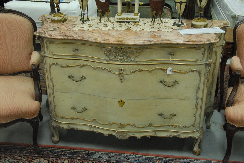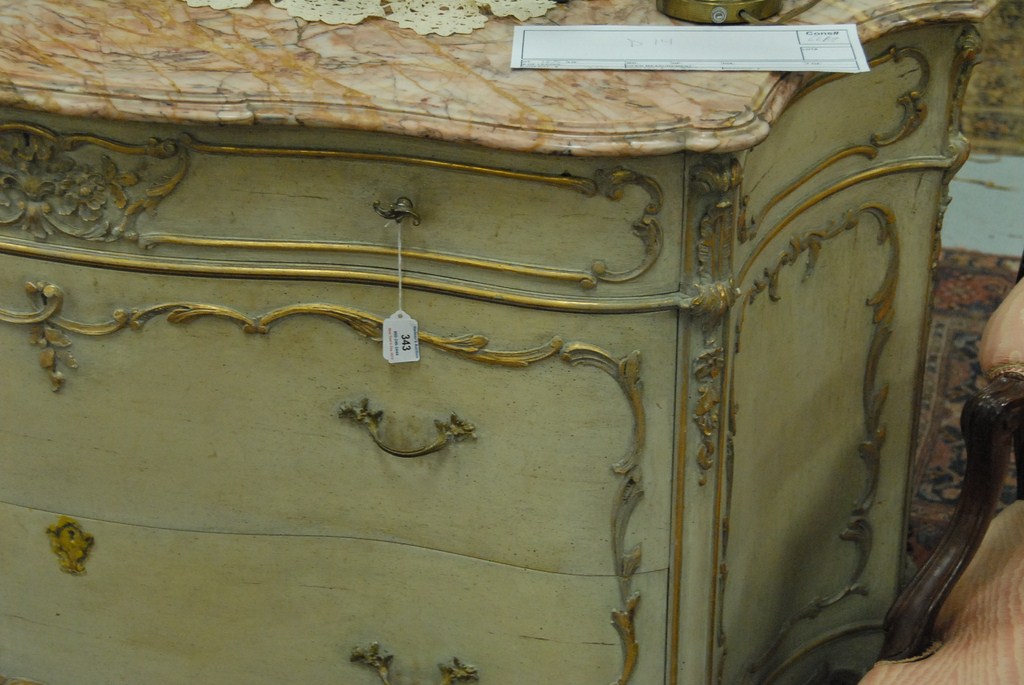 Lot 343: Louis XV style commode, top with pink shaped marble over conforming case of three drawers in white with gilt trim on short cabriole …