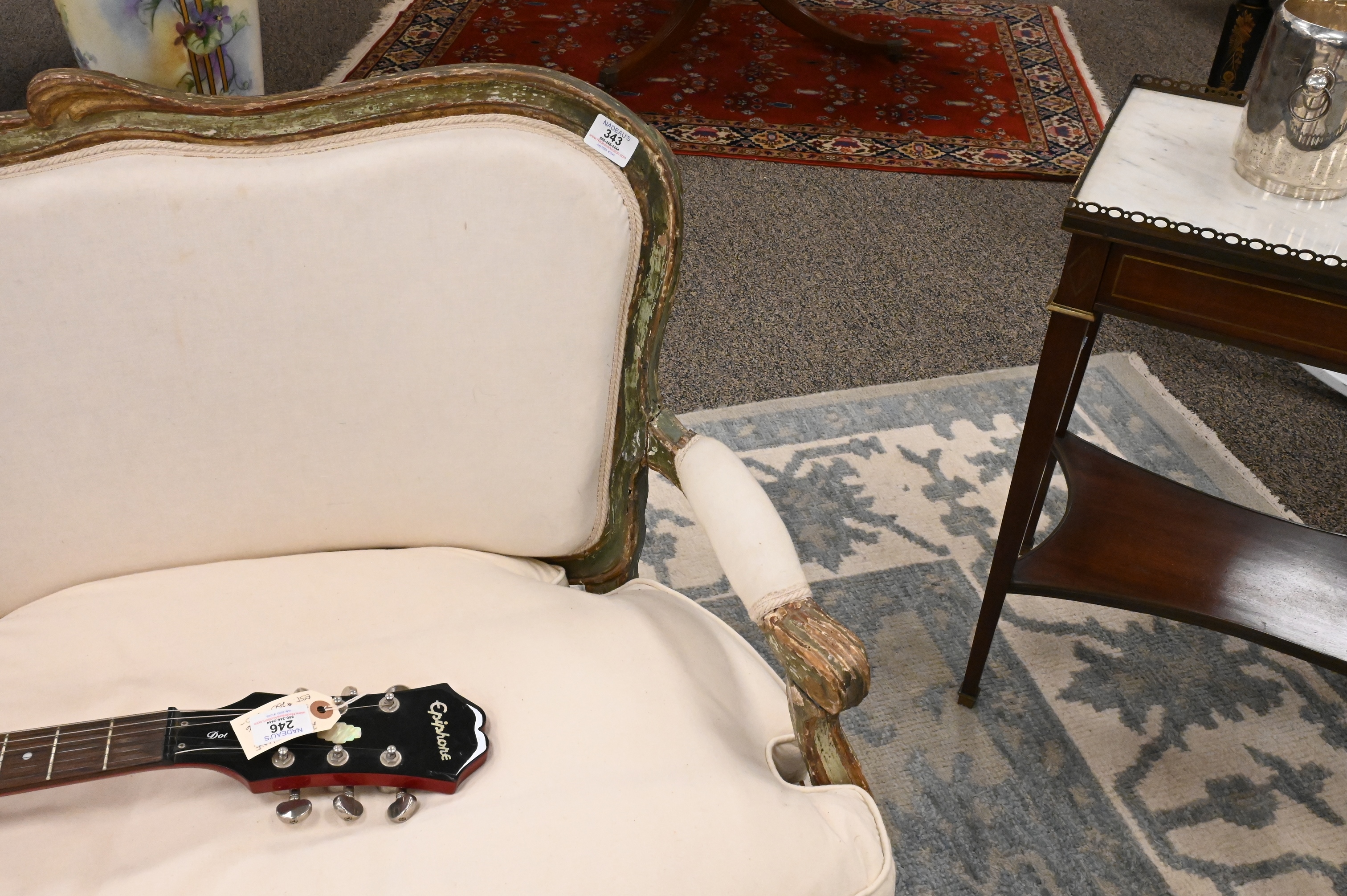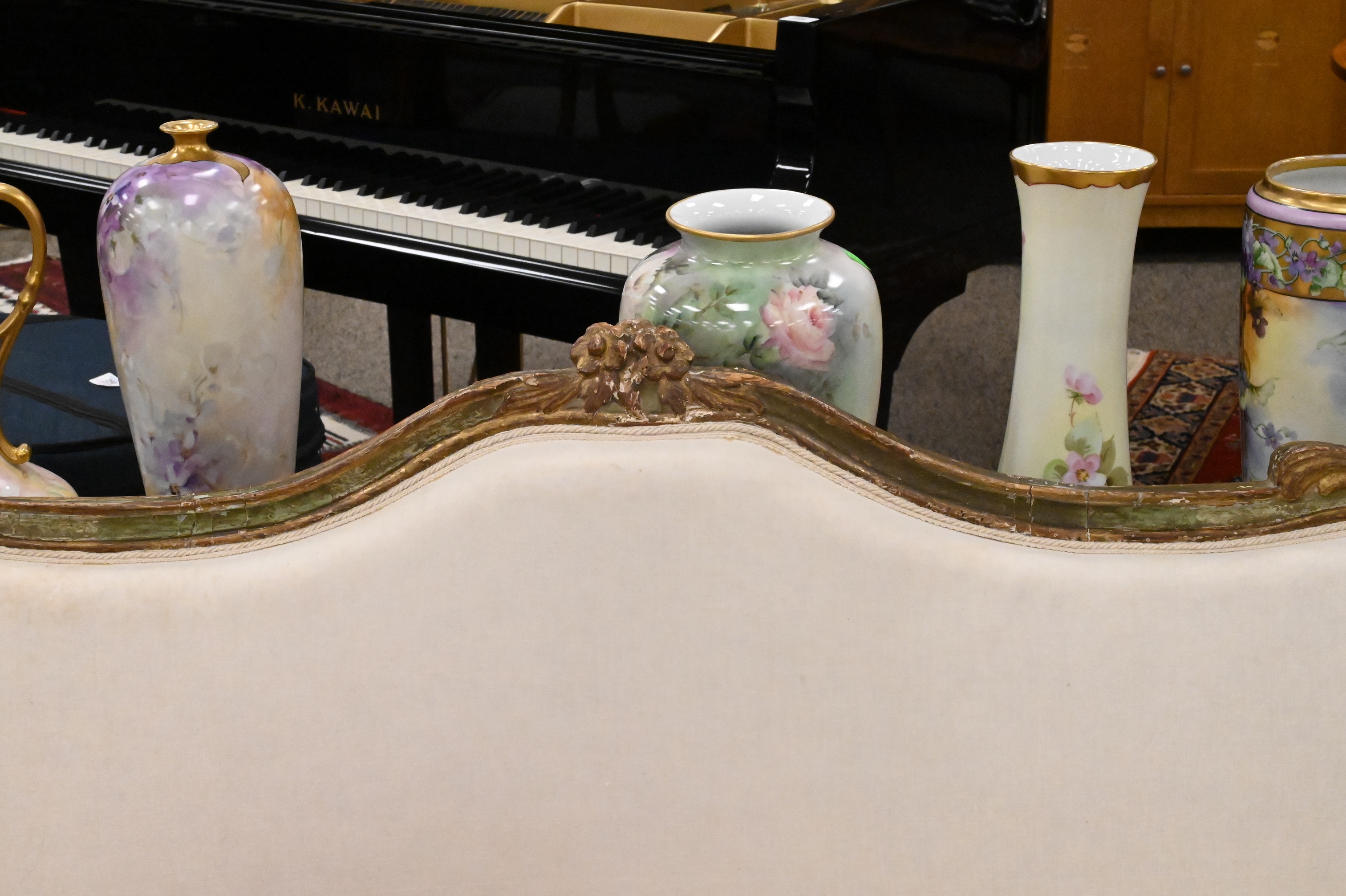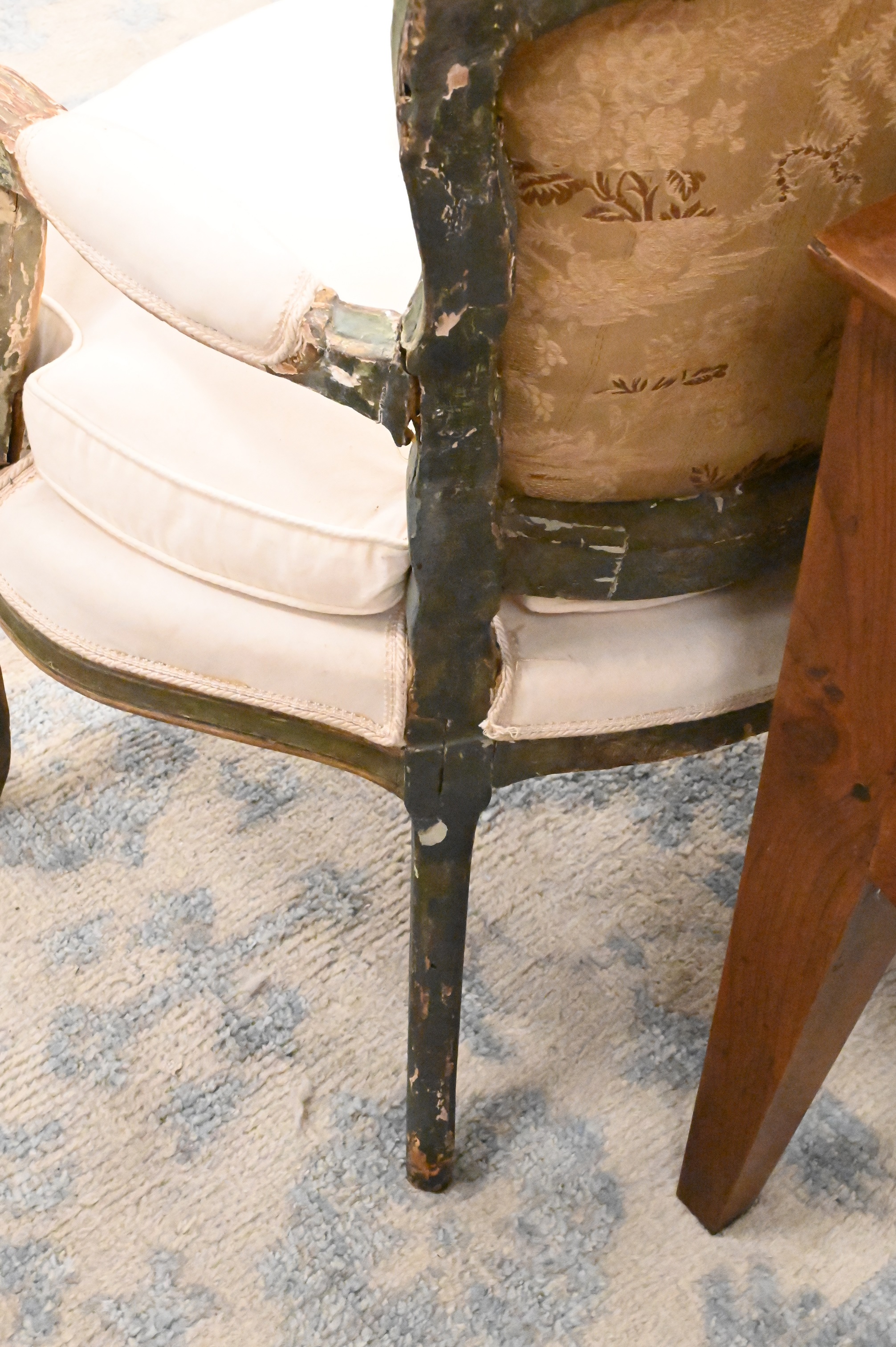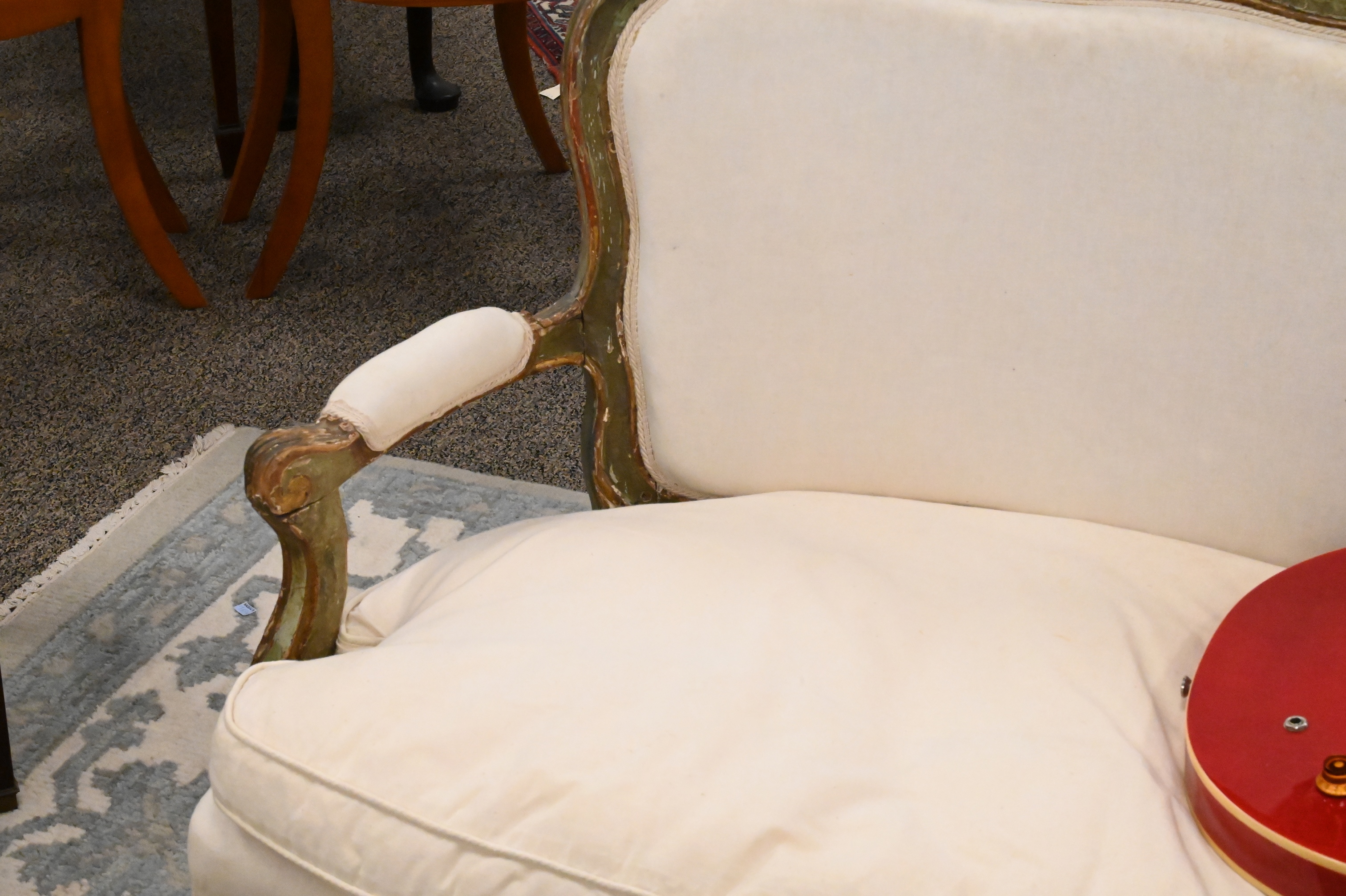 Louis XV Upholstered Canape, having some repairs and restoration, (seat height 18 inches, width 72 inches, diameter 20 inches), height 39 inches, length 76 inches.