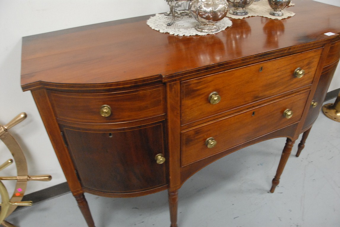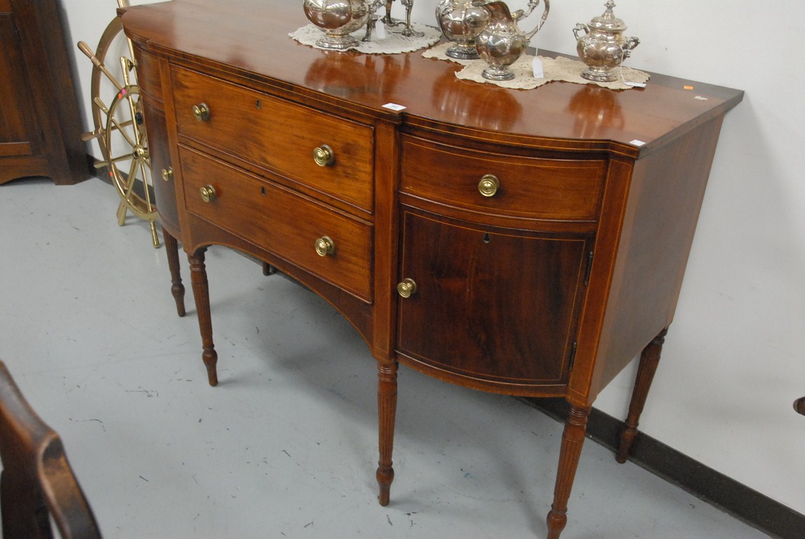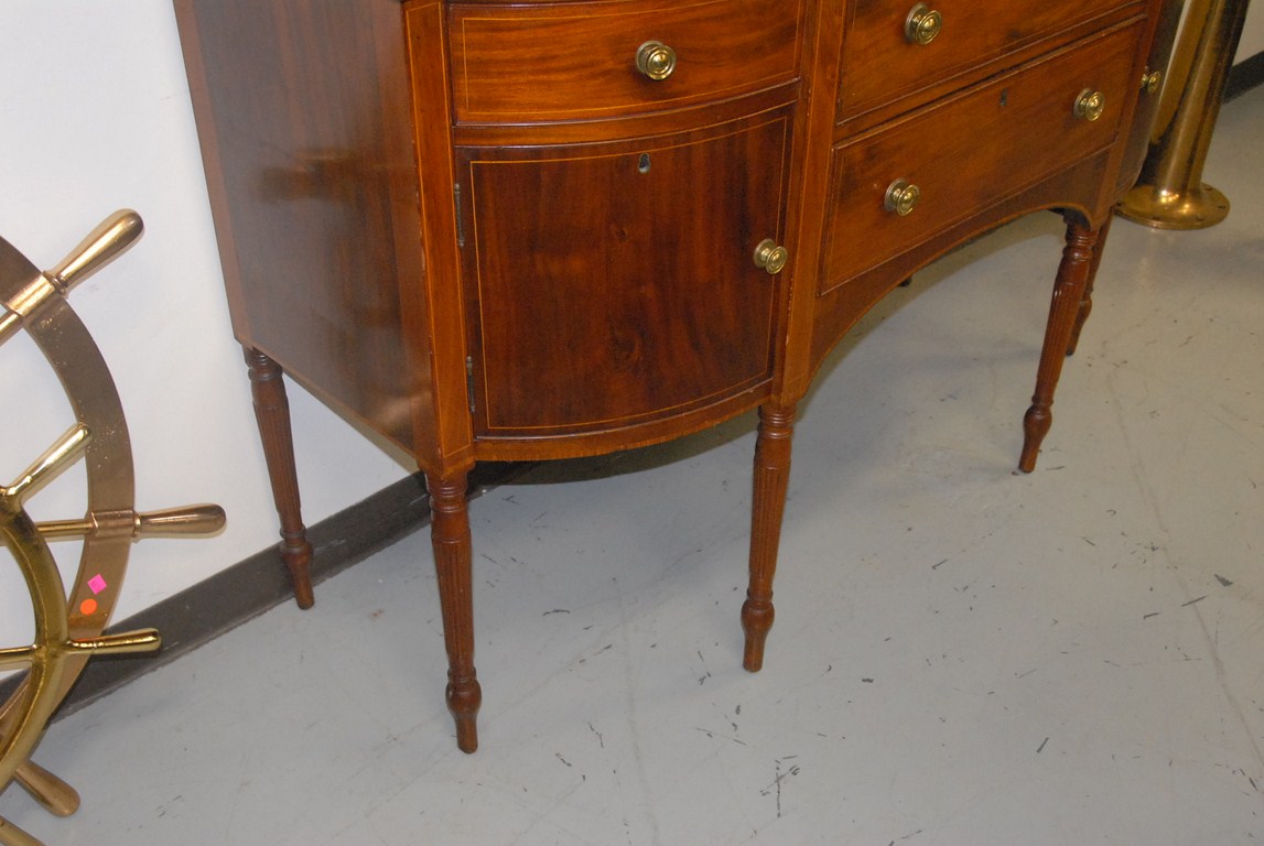 Lot 343: New England Sheraton mahogany small sideboard having a straight front with curved ends, modified D form, fitted w/a variety of d…