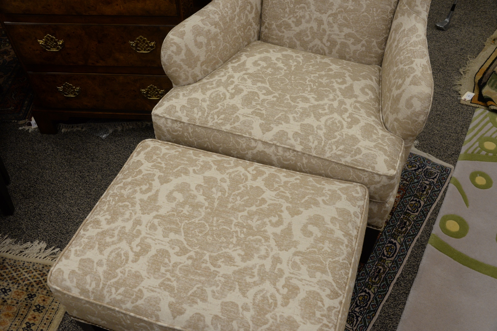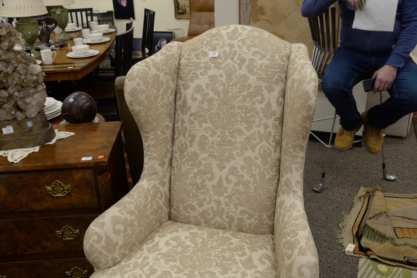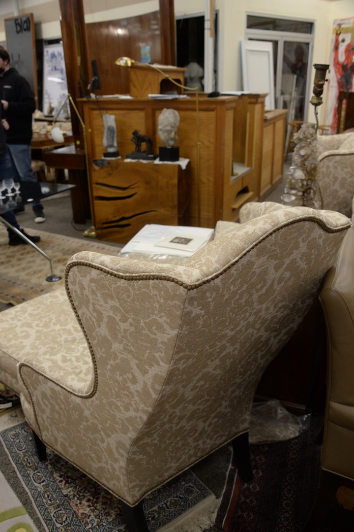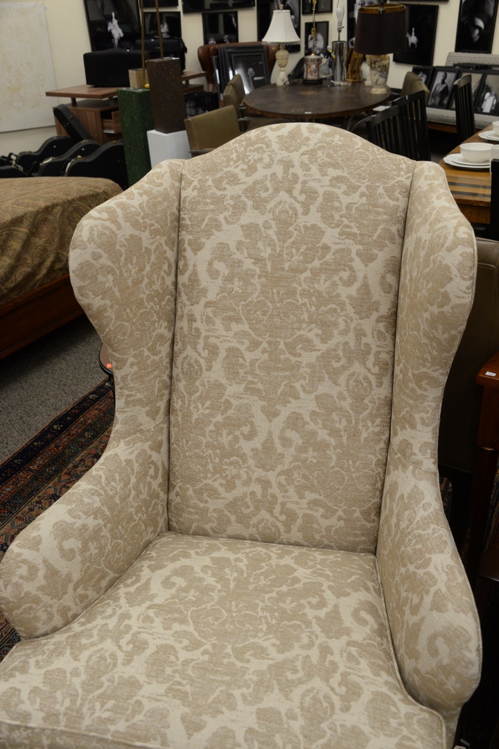 Lot 343: Pair of Ethan Allen Selby Wing Back Chairs, along with two ottomans, $3,200 retail, height 48 inches, width 32 inches.
