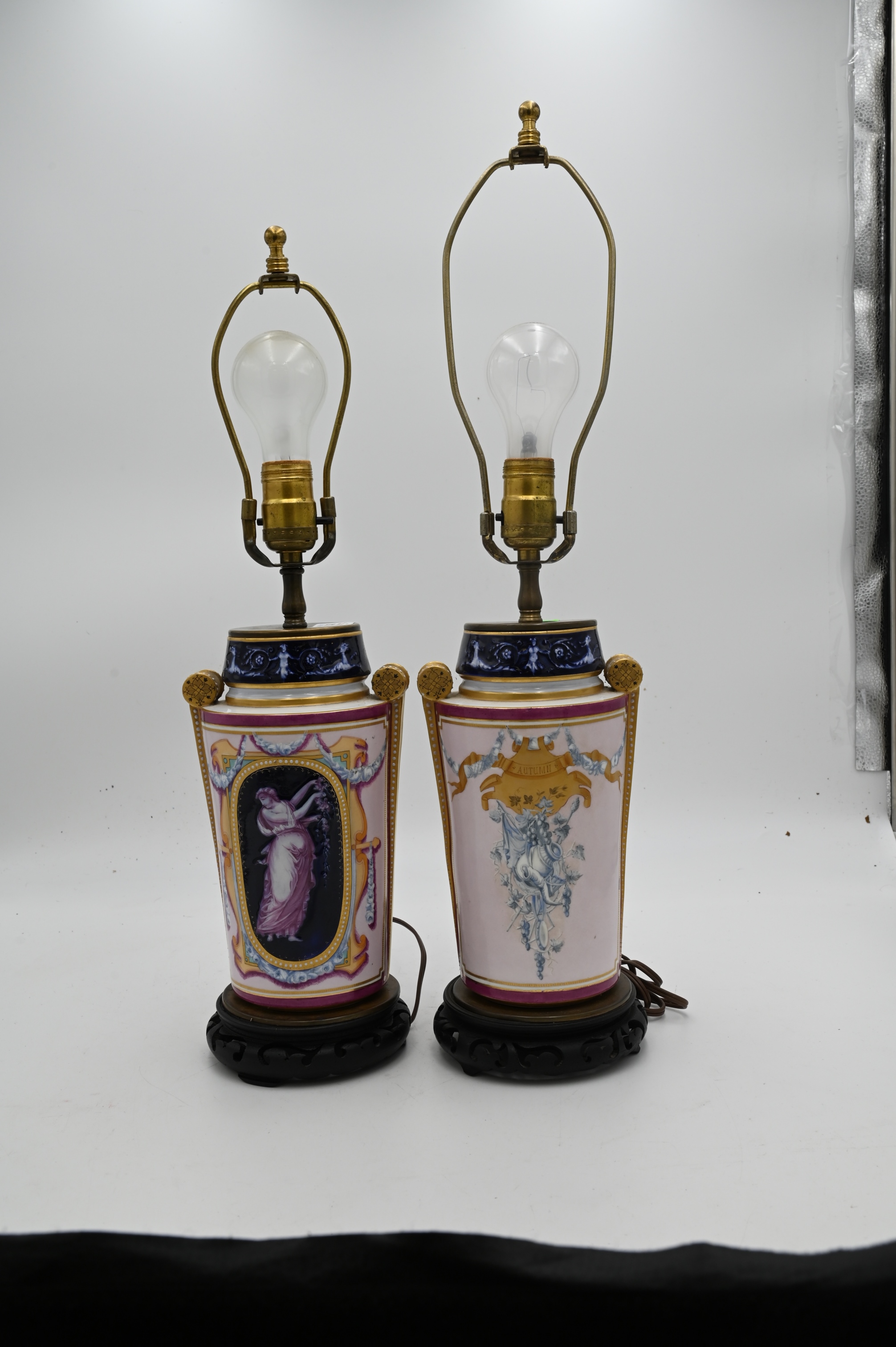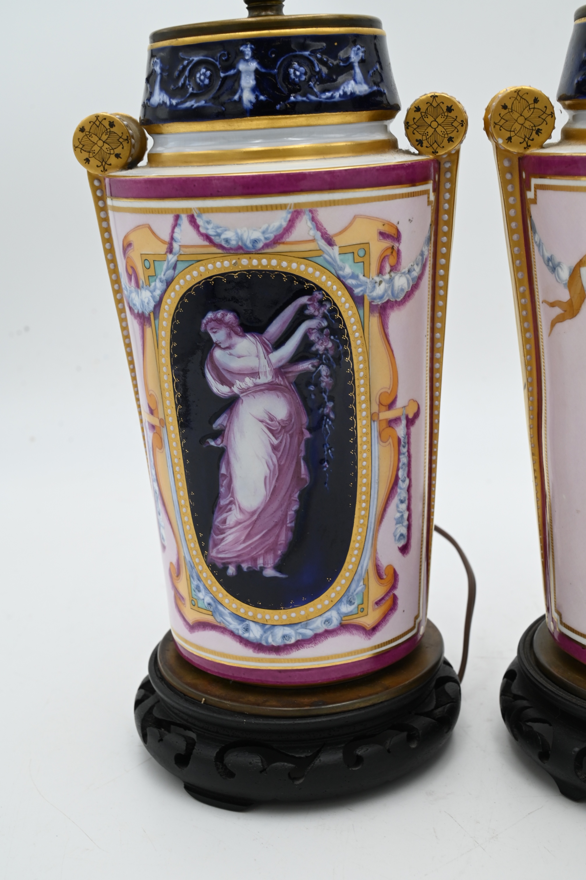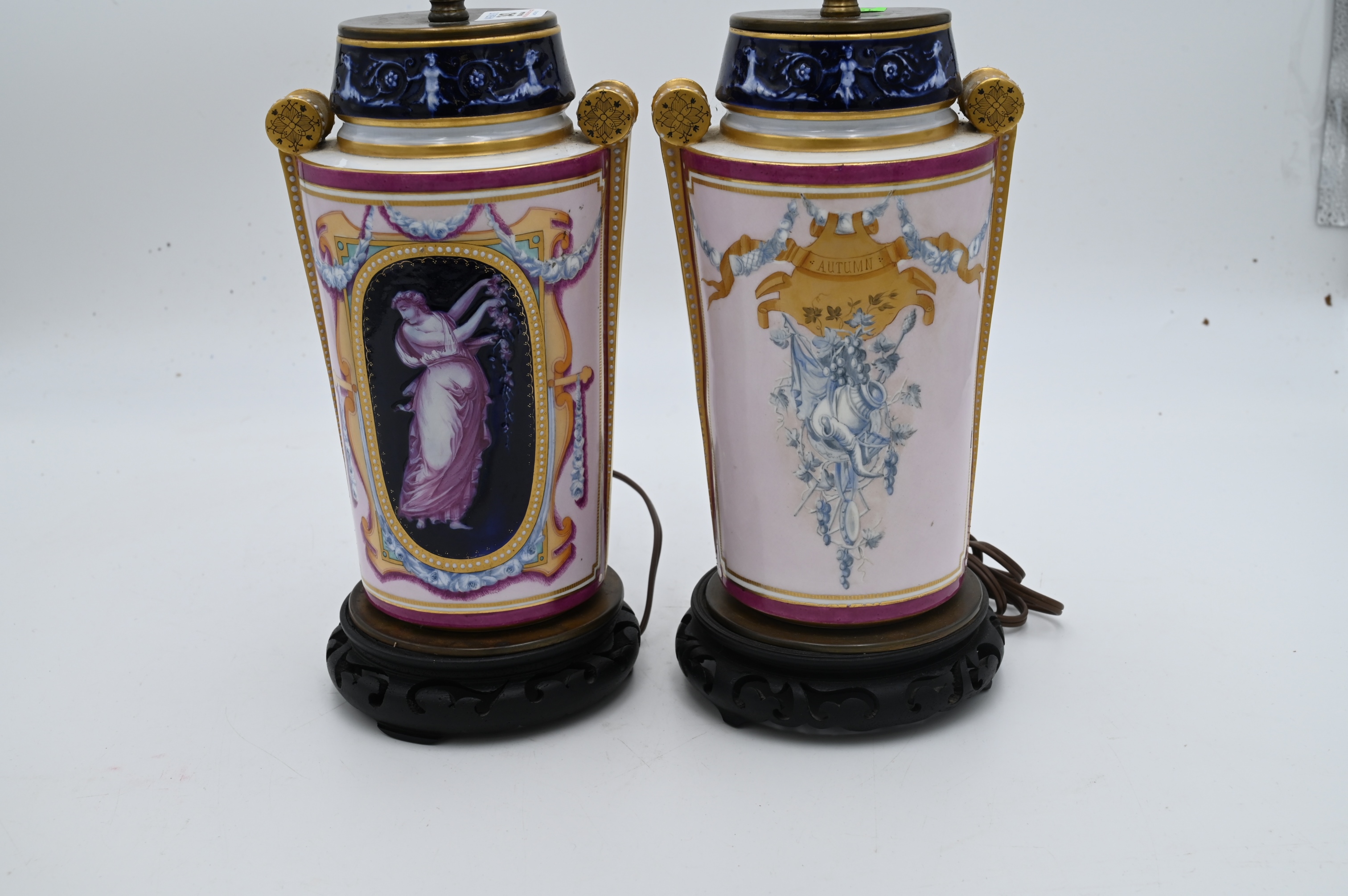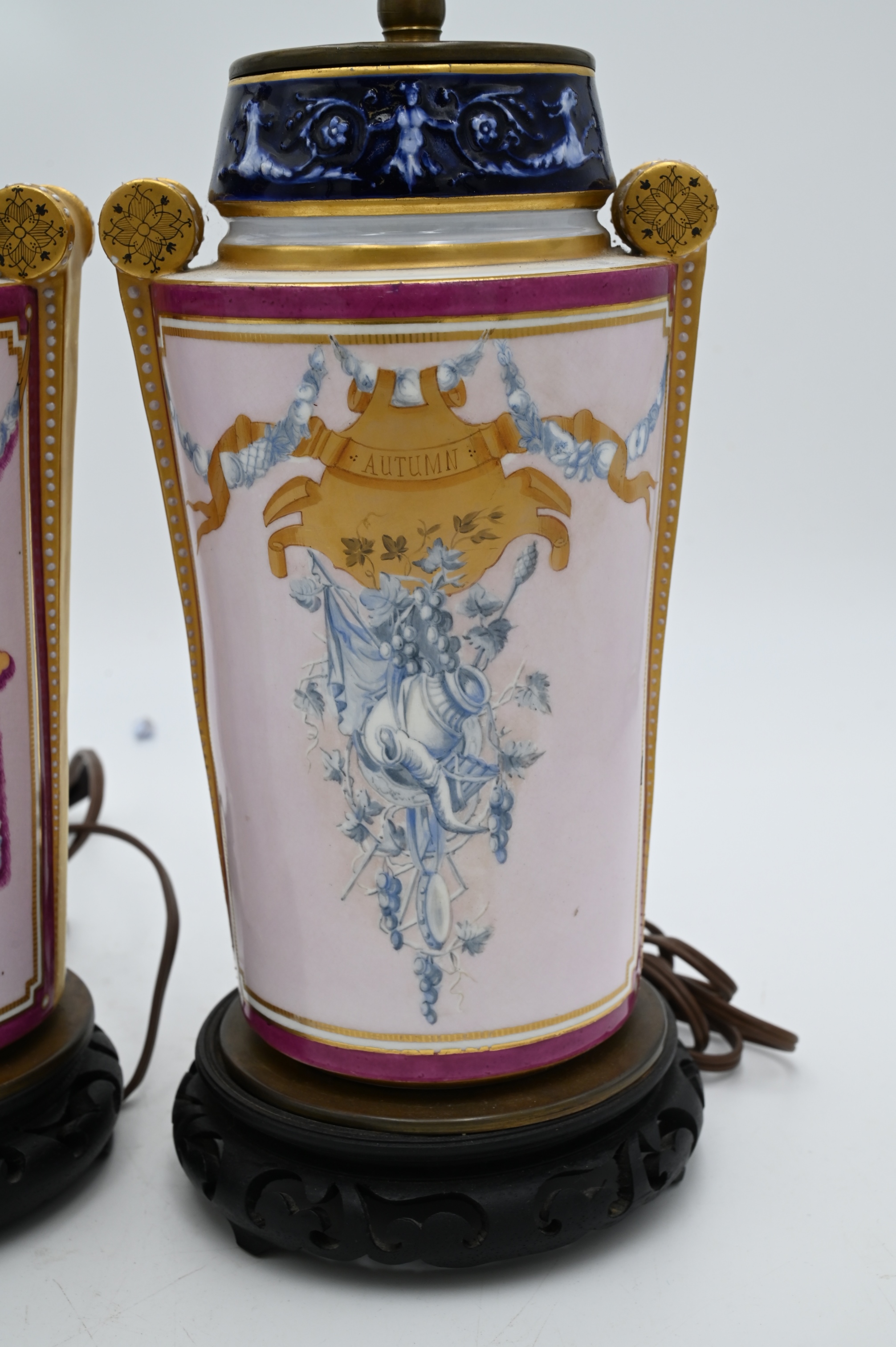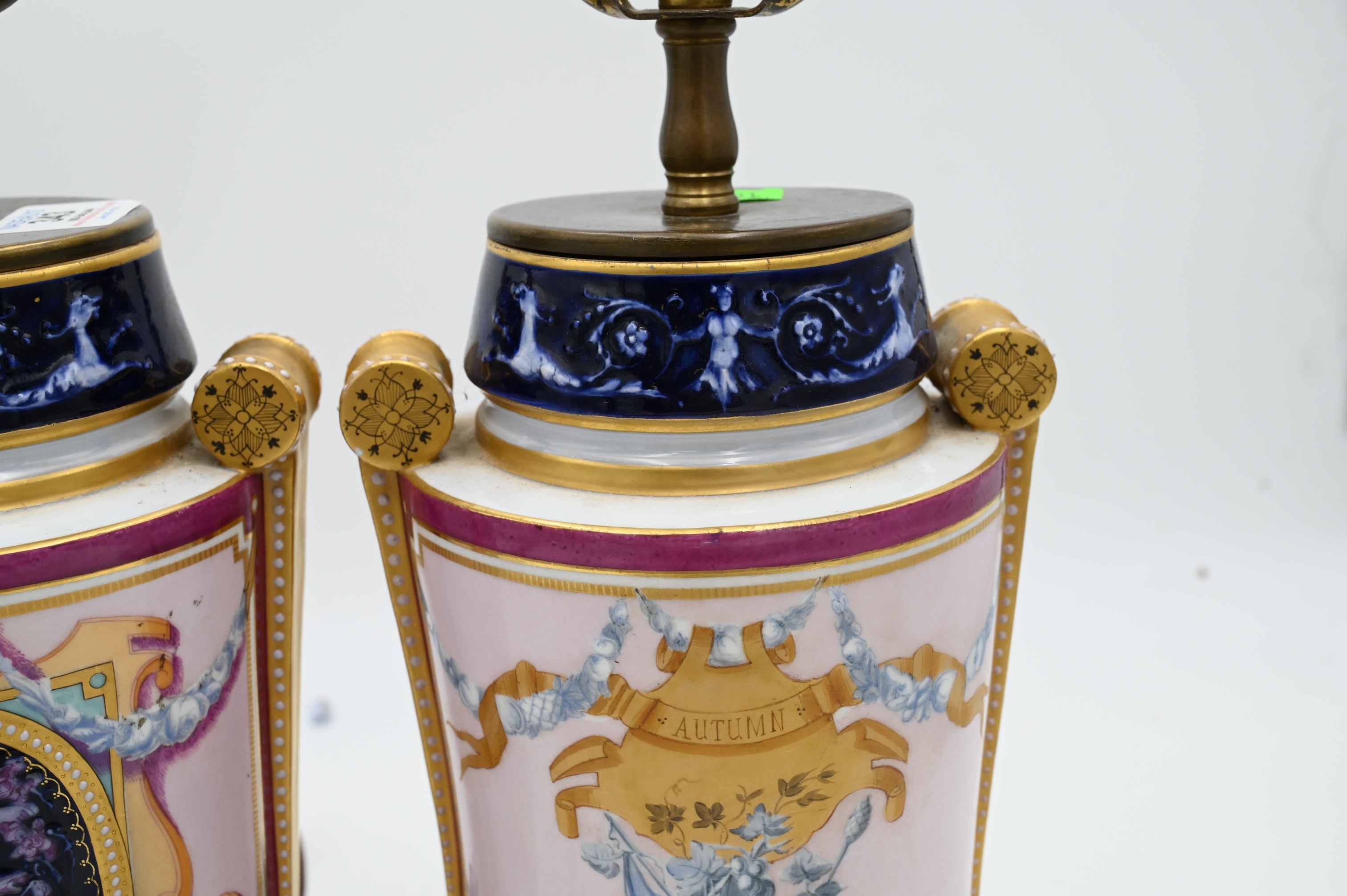 Pâte-sur-pâte Style Porcelain Vases, made into table lamps, one marked Spring the other marked Summer, vase height 9 inches.