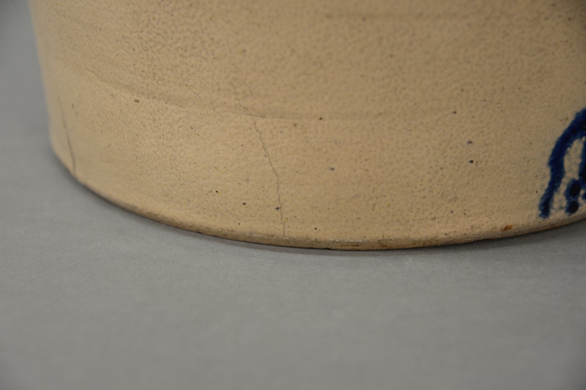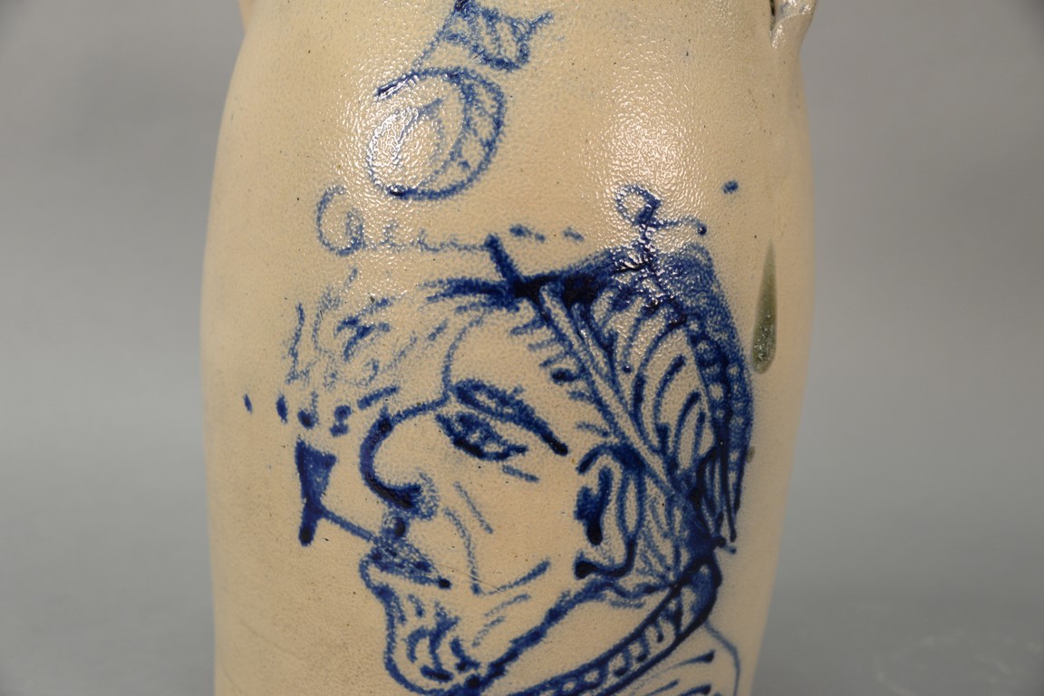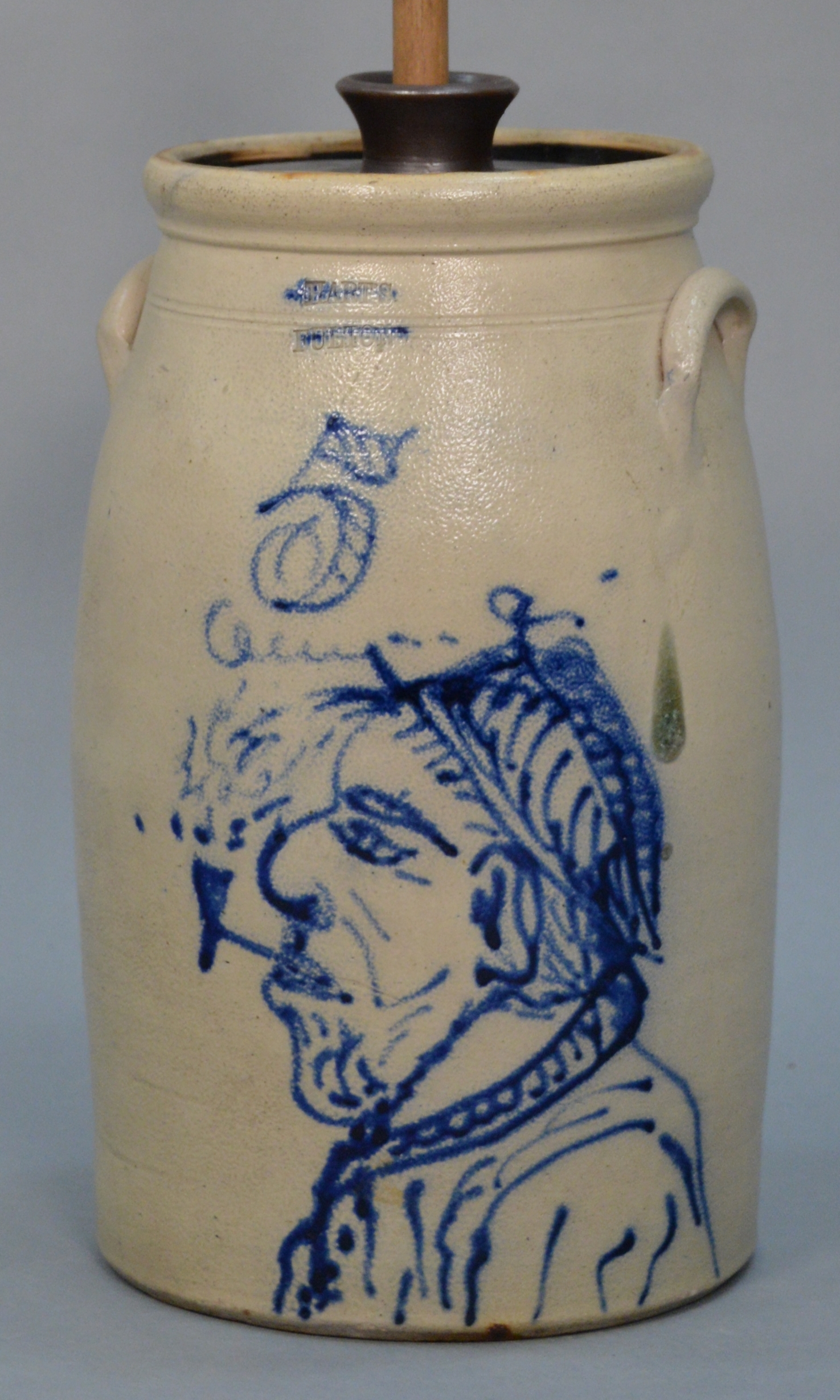 Rare Hart’s Fulton New York five gallon stoneware butter churn impressed Hart’s/Fulton with cobalt blue decorated old man smoking a pipe. tight hairline cracks in back, left front, and near bottom height 17 1/8 inches Provenance: Estate of Dr. Steve Leder