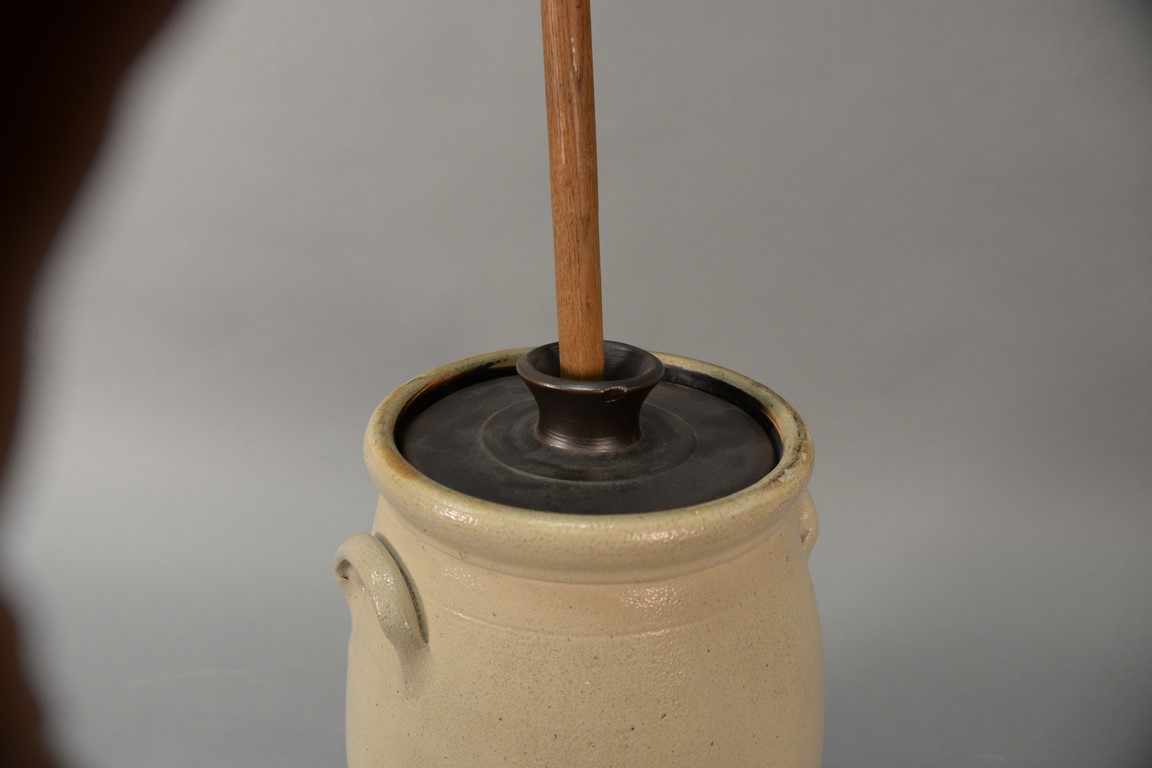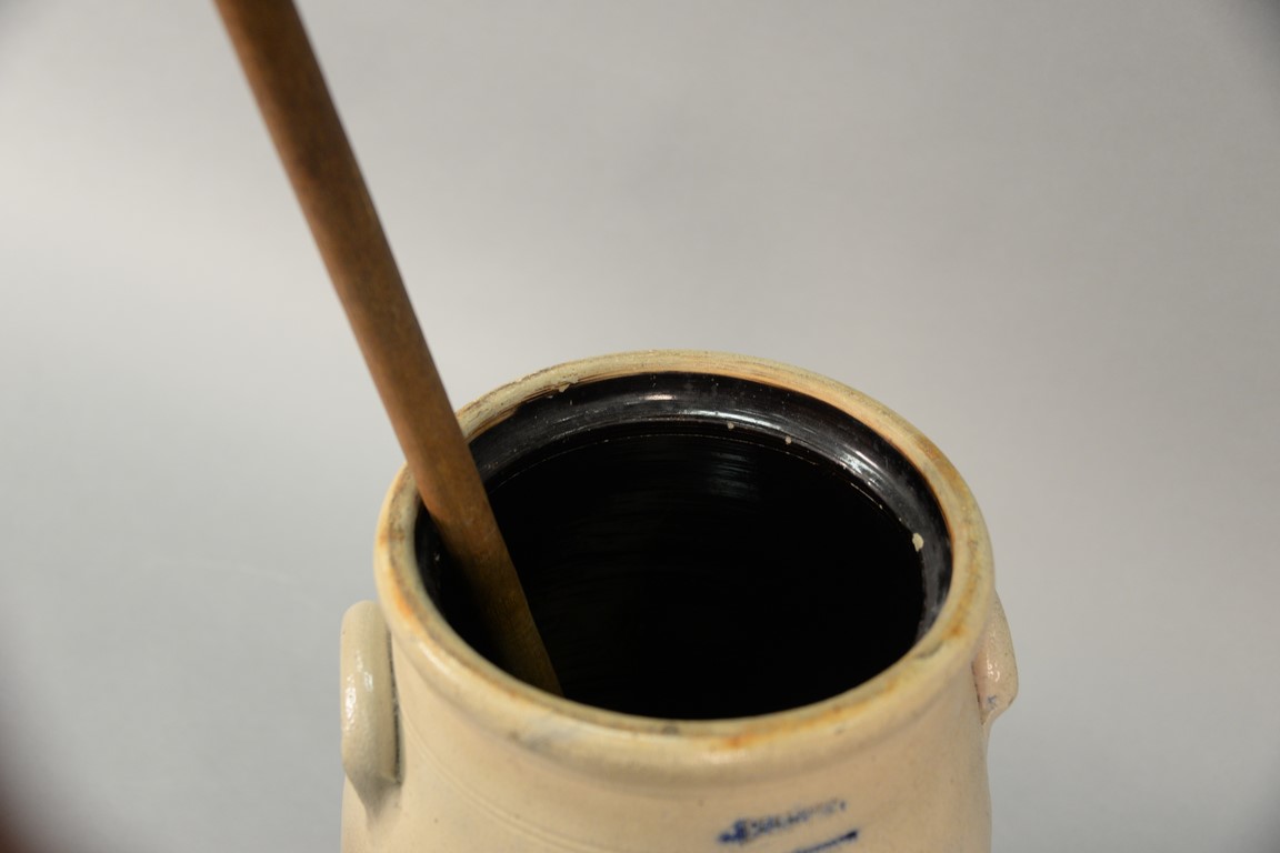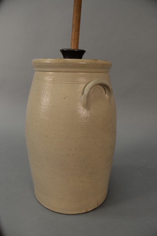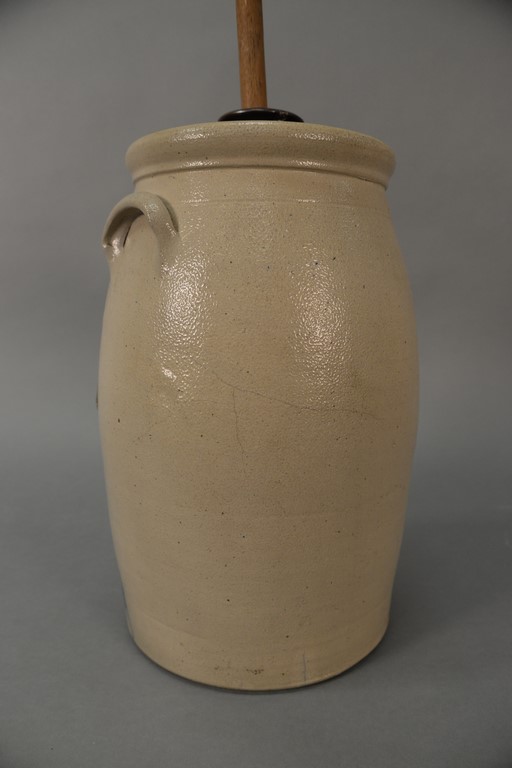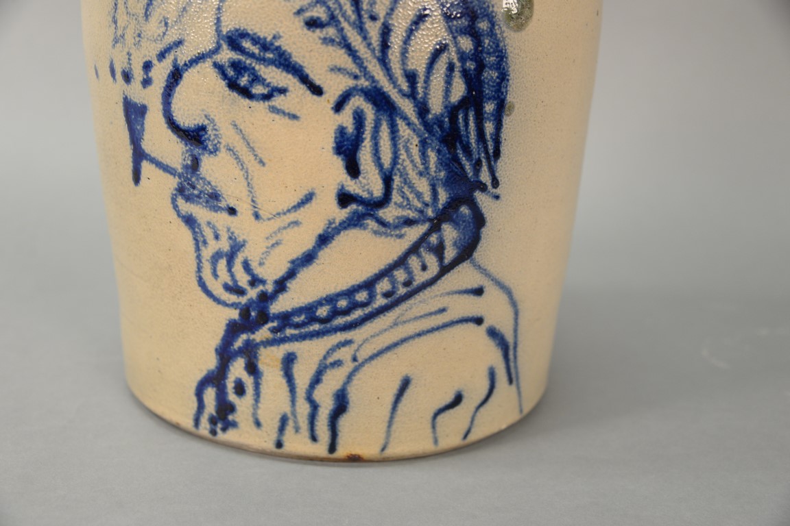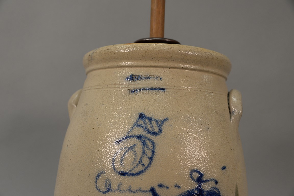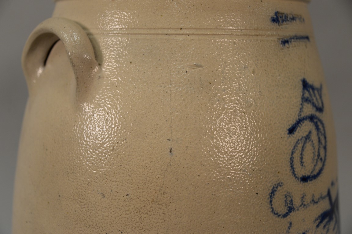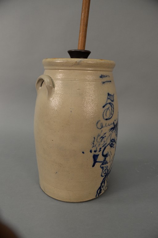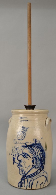 Lot 343: Rare Hart’s Fulton New York five gallon stoneware butter churn impressed Hart’s/Fulton with cobalt blue decorated old man smoking …